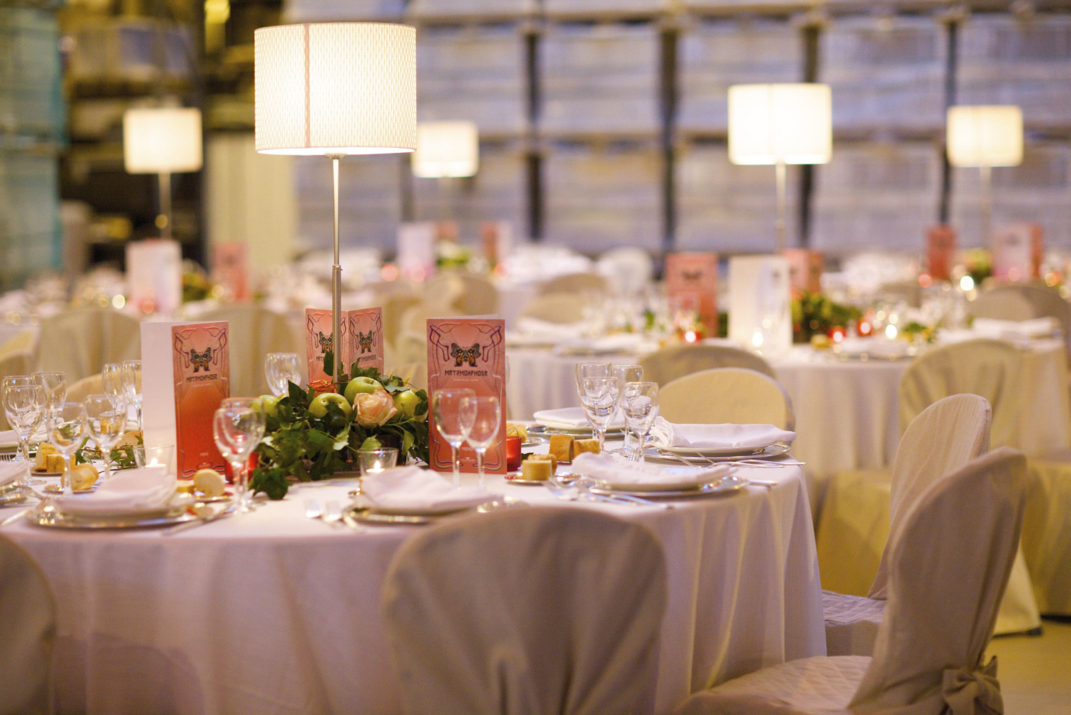 The restaurant area has been set up directly inside the Novoceram warehouse. Almost 24 metres long and 7 metres wide with a floor entirely tiled in about 160 sq m of 60×60 Samsara Perle, it can comfortably welcome up to 144 people at 12 circular 12-place tables.