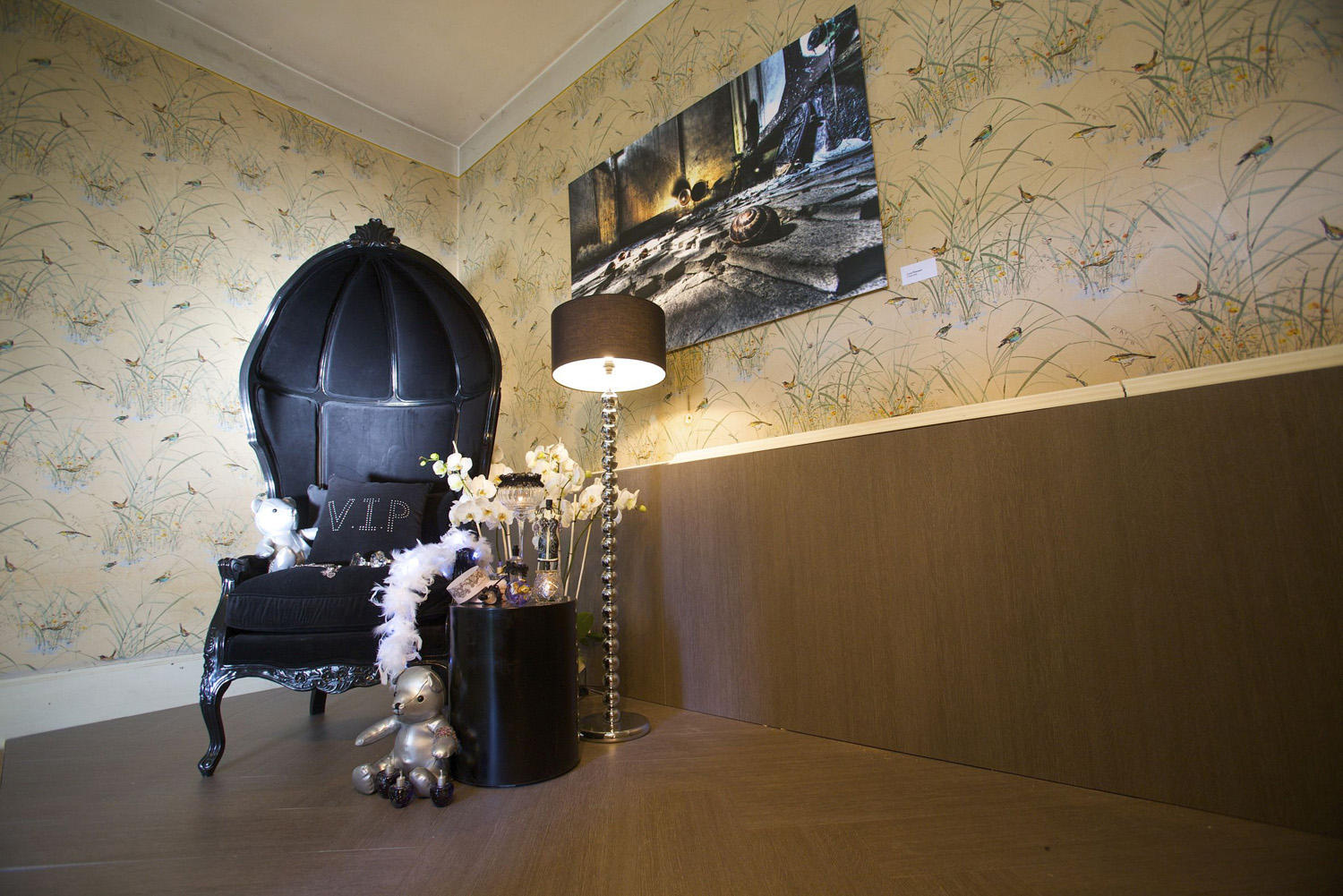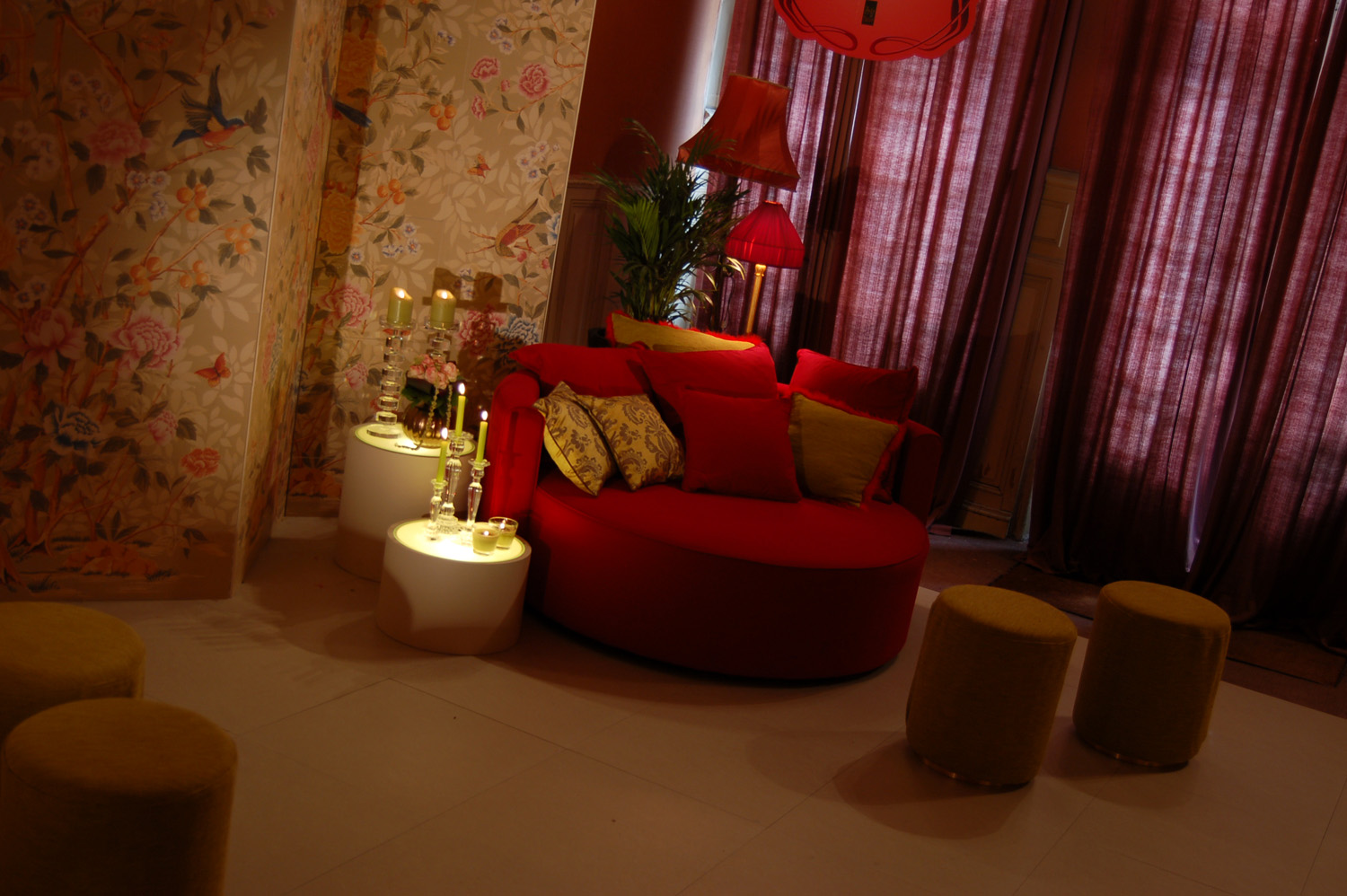A fragment of an imaginary stay was created in the old hall of the hotel. The floor is in Samsara Ivoire, the enormous screens are entirely clad in Florilège.
