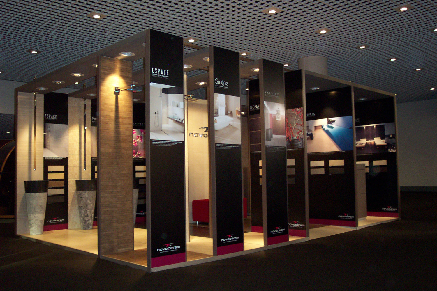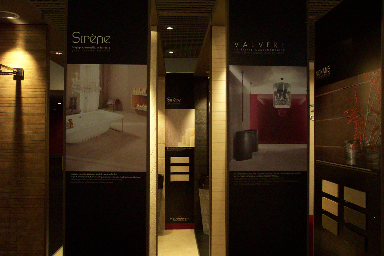 In a game of facing walls tiled with surprising mosaics, the Novoceram stand displays every aspect of the “Charme Céramique”, introducing visitors into the company’s latest collections, the result of a thourough research on materials for wellness and on the latest aesthetic trends.