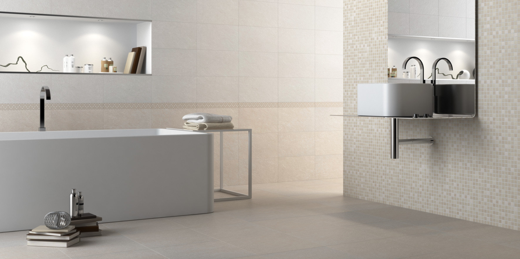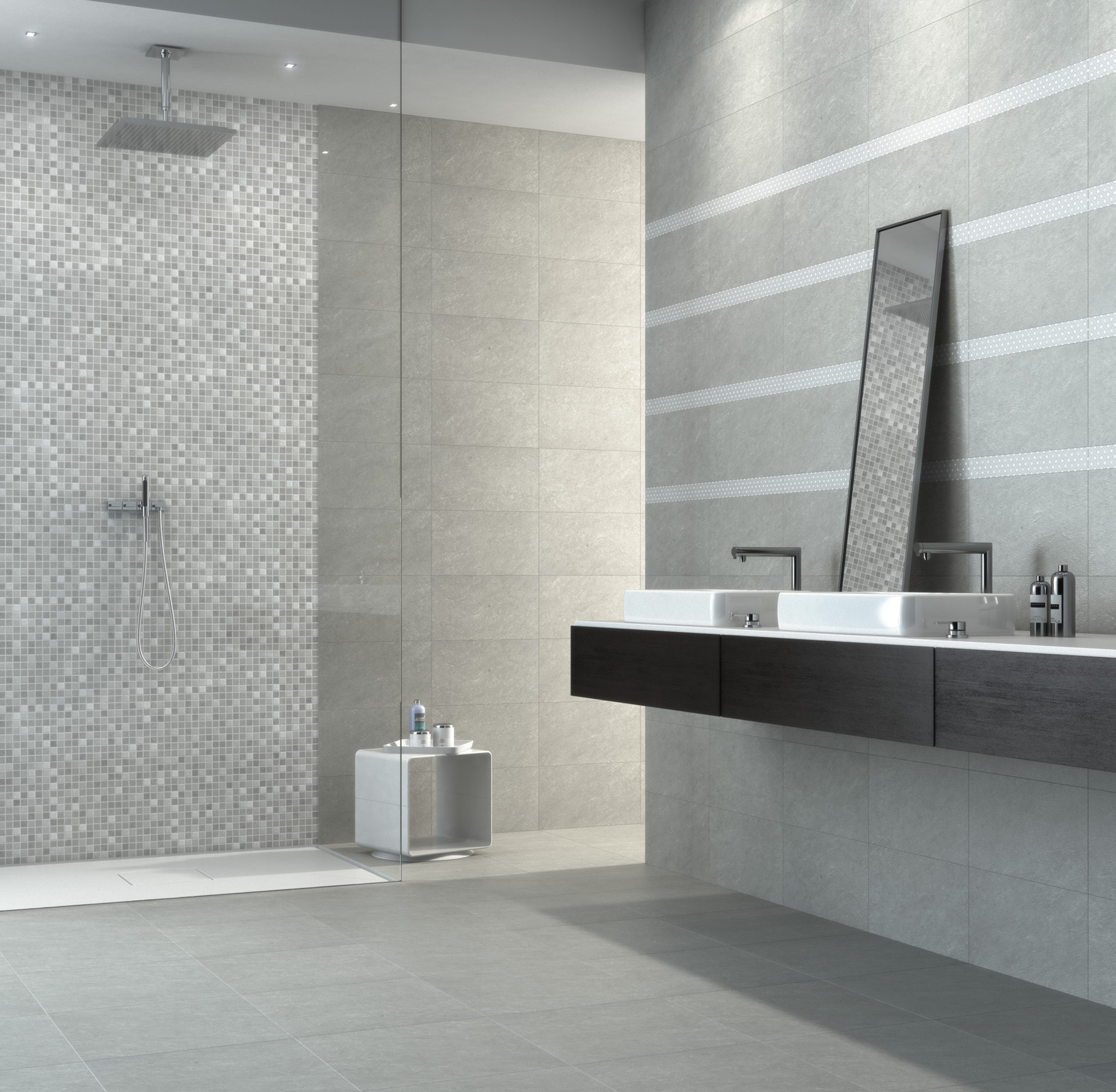 The offer is completed by a 5.5×45 cm strip tile in a warm version to combine with the Opale and Ivoire colours and a cold version to combine with the Perle colour, and a mosaic effect insert for on-site laying, also available in both warm and cold versions. The possibility of grouting the pre-scored joints between the mosaic tiles guarantees an appearance in every way similar to that of traditional mosaic with much lower costs.