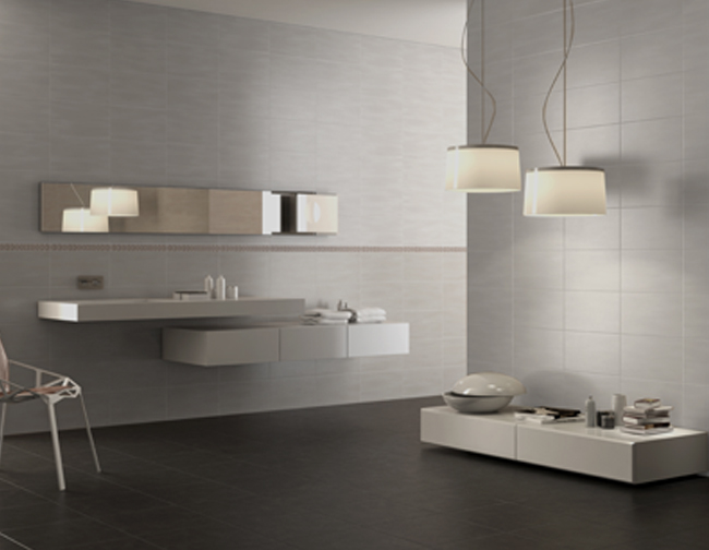 The colours were designed to be combined in pairs: Zone Ivoire with Zone Chocolat, Zone Plomb with Zone Argent, Zone Perle with Zone Poudre, to cover and customise bathroom walls elegantly, creating pleasant layout combinations also using a decorative 4.5×45 cm strip.