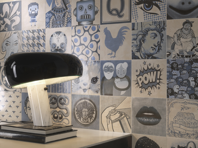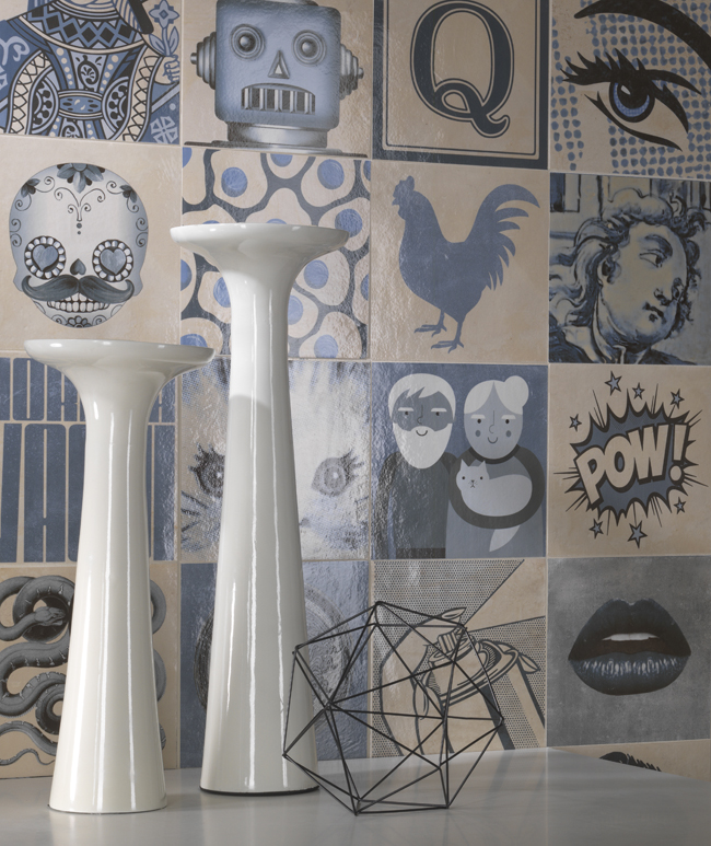 Ironic, irreverent, provocative. The 2016 edition of Cersaie, the Ceramic Trade Fair for Architecture and Bathroom Furnishing, sees the entry of the boldest collection yet into the Art catalogue by Novoceram. With no less than sixty-three different subjects made of glazed porcelain stoneware in the 20×20 cm size, Indigo mixes themes that draw inspiration from iconographic traditions that are stylistically and chronologically very far apart.