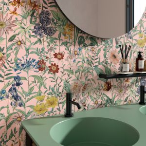 The flowery and plant patterns of this ceramic wallpaper joyfully stand out against the background, available in three pastel colours – blue, pink and white –, which fulfil every need of sweetness. The poesy that emanates from Bloom makes it a true decorative element that brings in interior spaces the elegant style of this unforgettable fashion and design era.