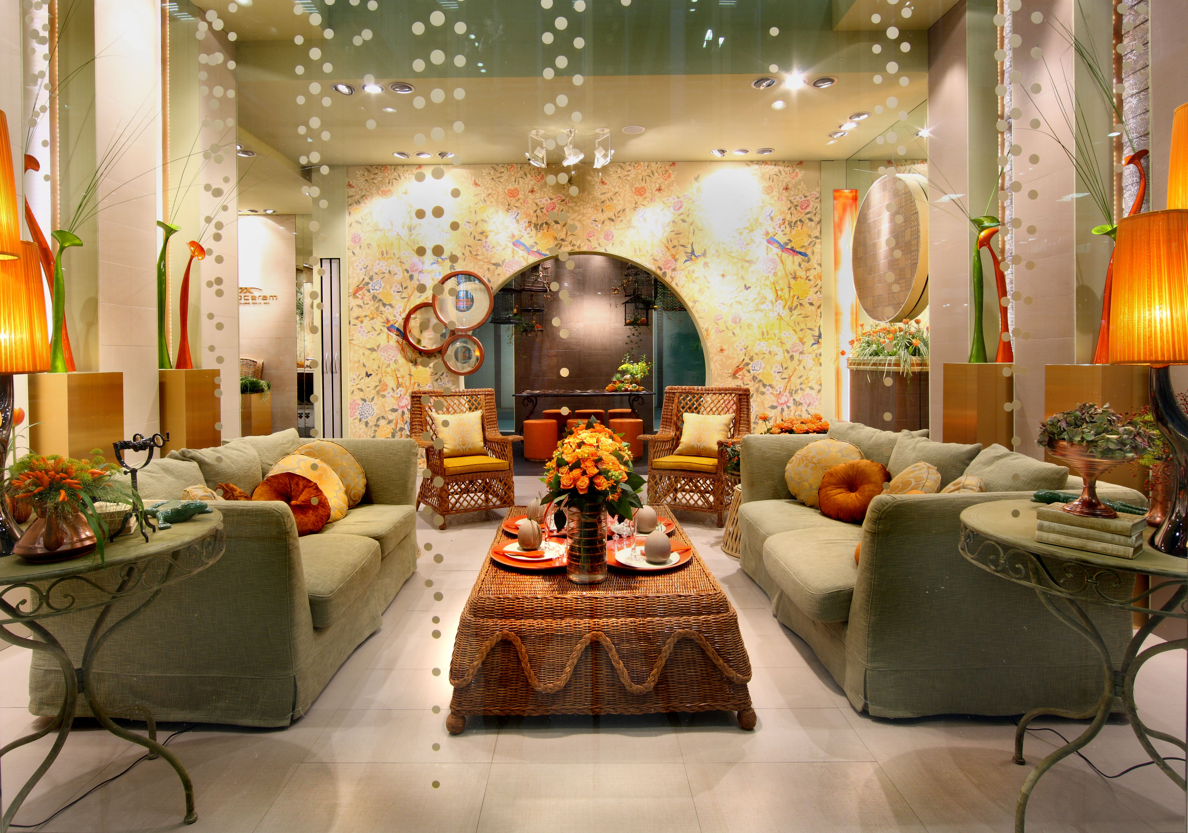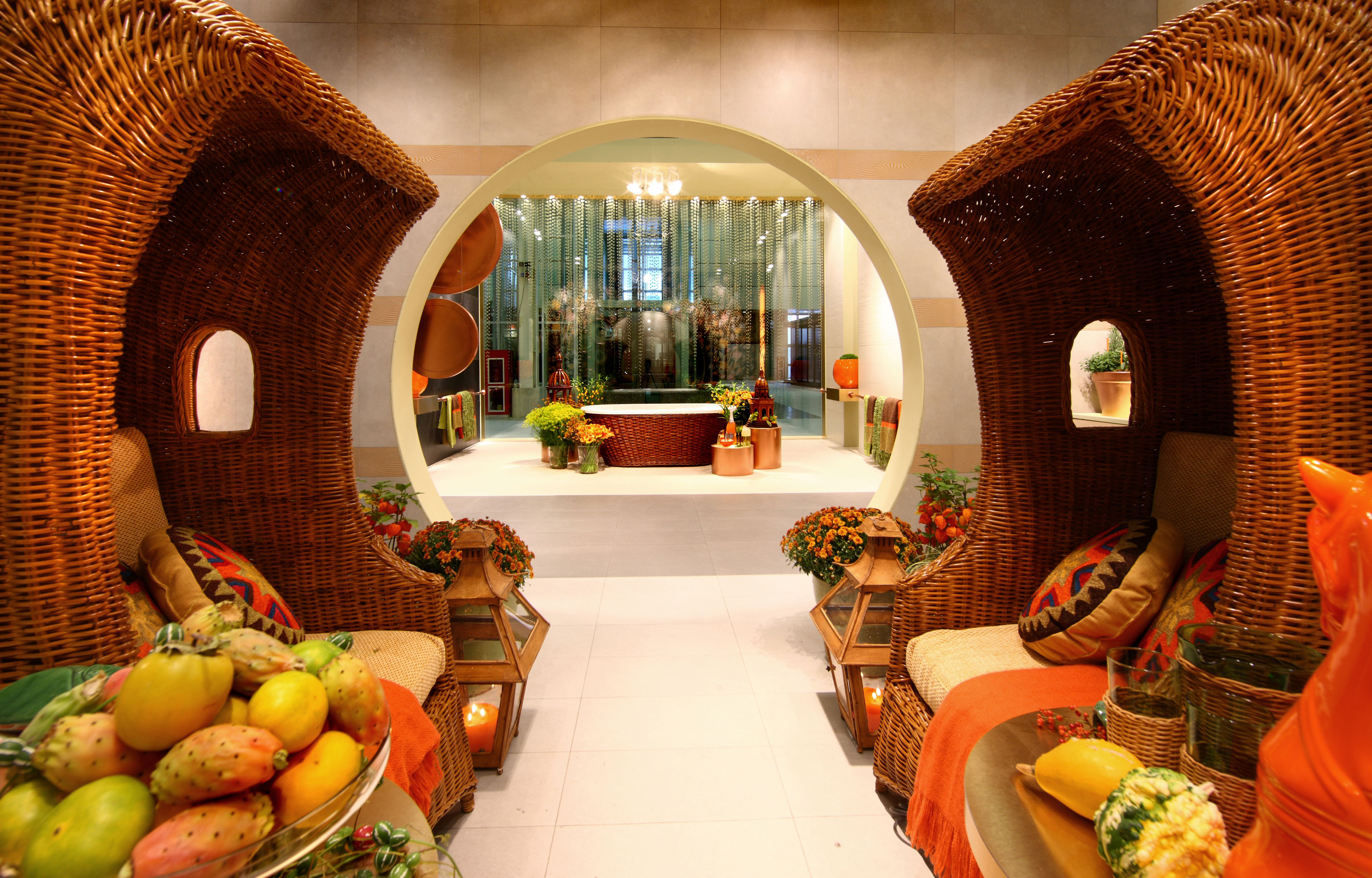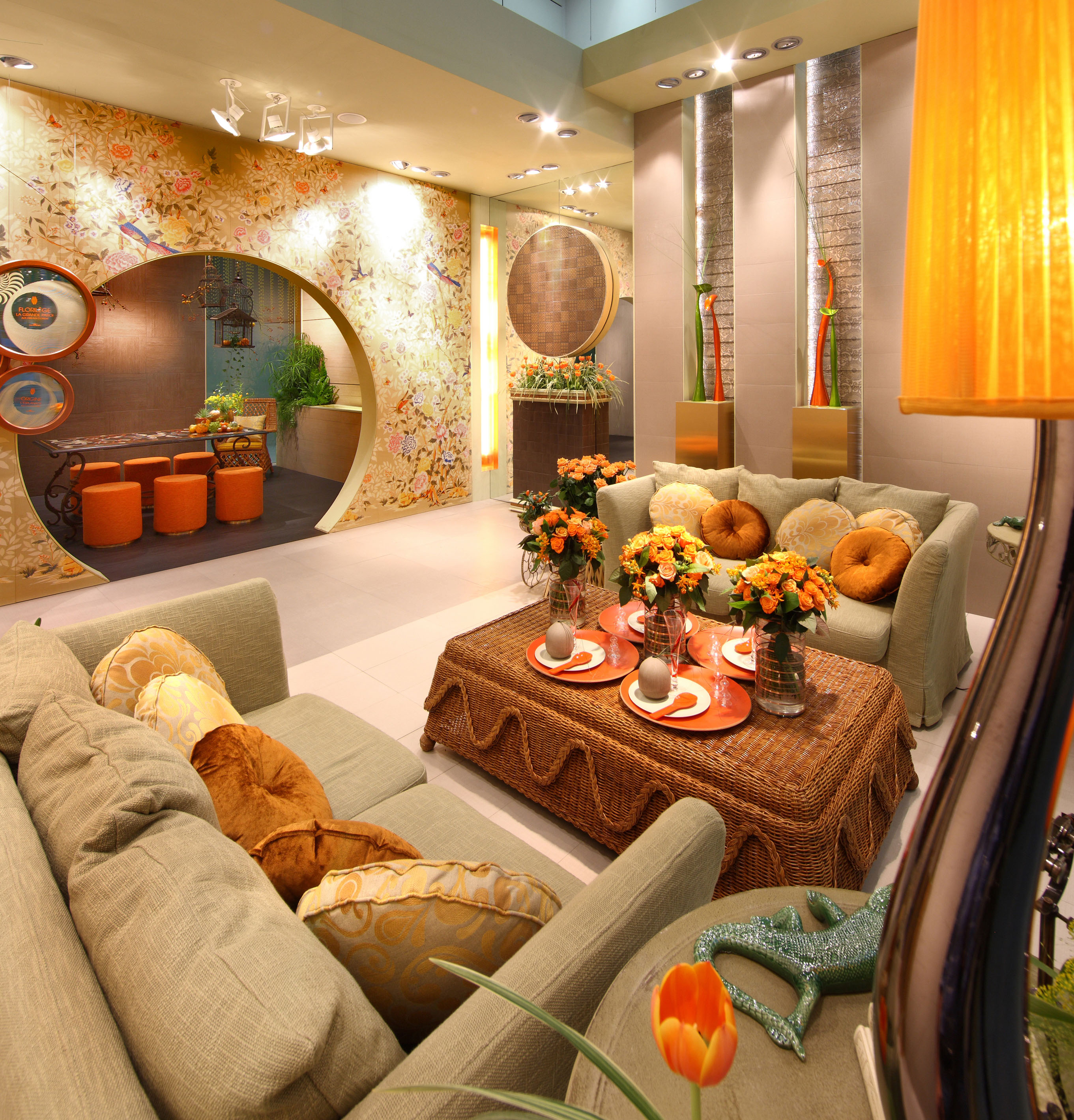 Novoceram, French ceramics manufacturer since 1863, takes inspiration from the relaxed lifestyle of the south of France to recreate the casual elegance of a holiday home in Provence in its stand « Conte d’été » at Cersaie 2008, the International Exhibition of Ceramic Tile and Bathroom Furnishings in Bologna. The circular lines of the seventies are combined with the silvery green of olive and lavender leaves and the sunny orange of the South of France, all lightened by smooth touch of copper.