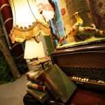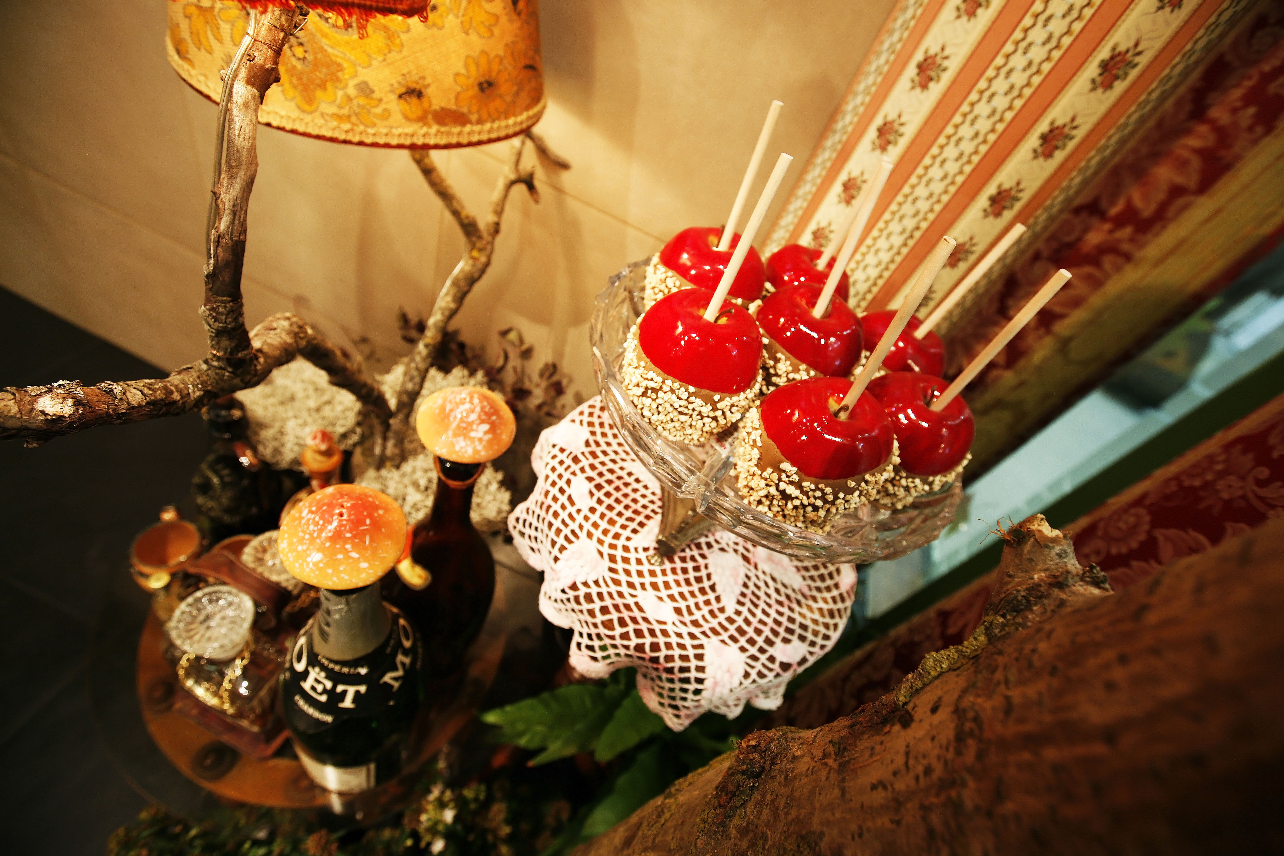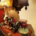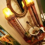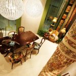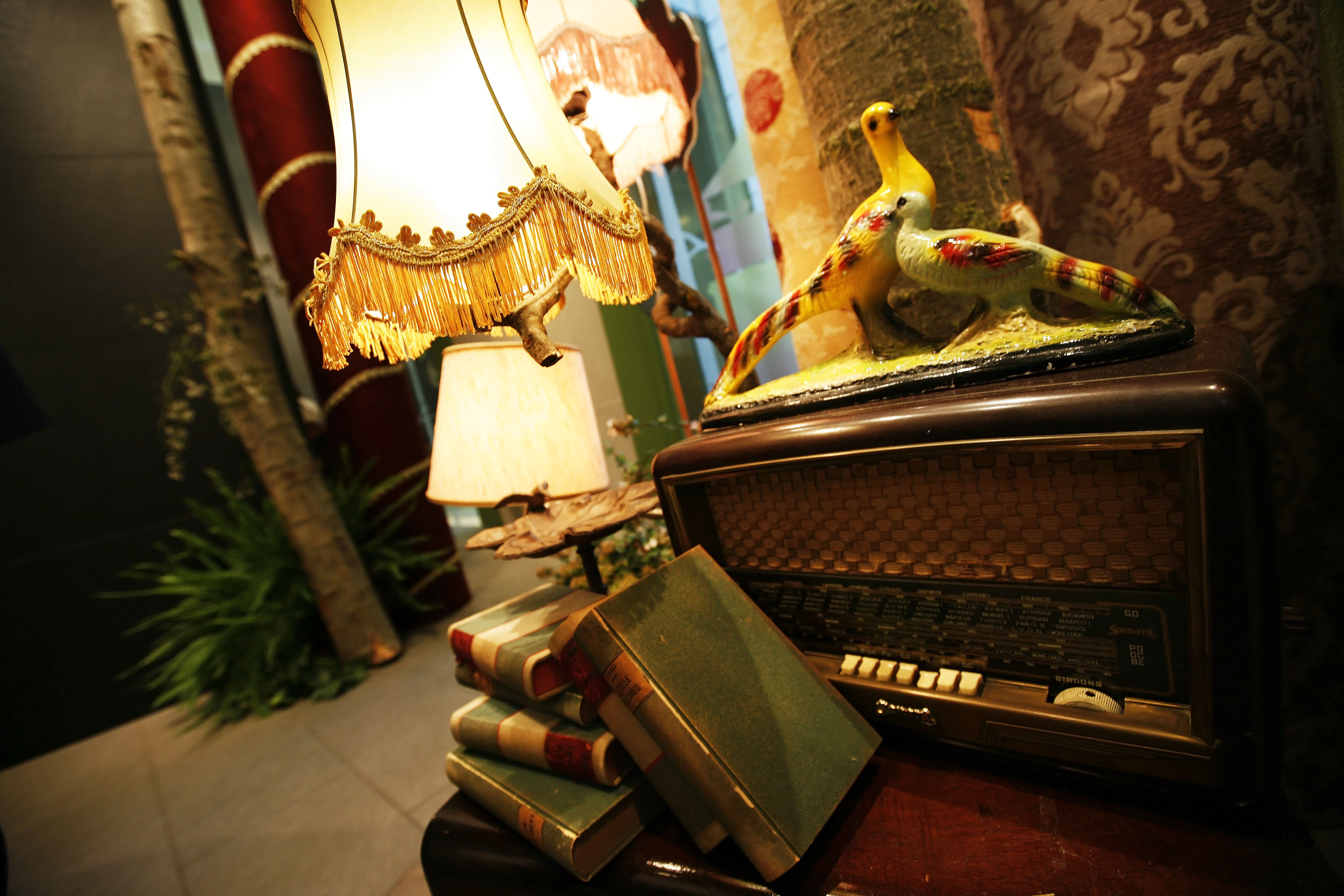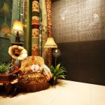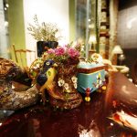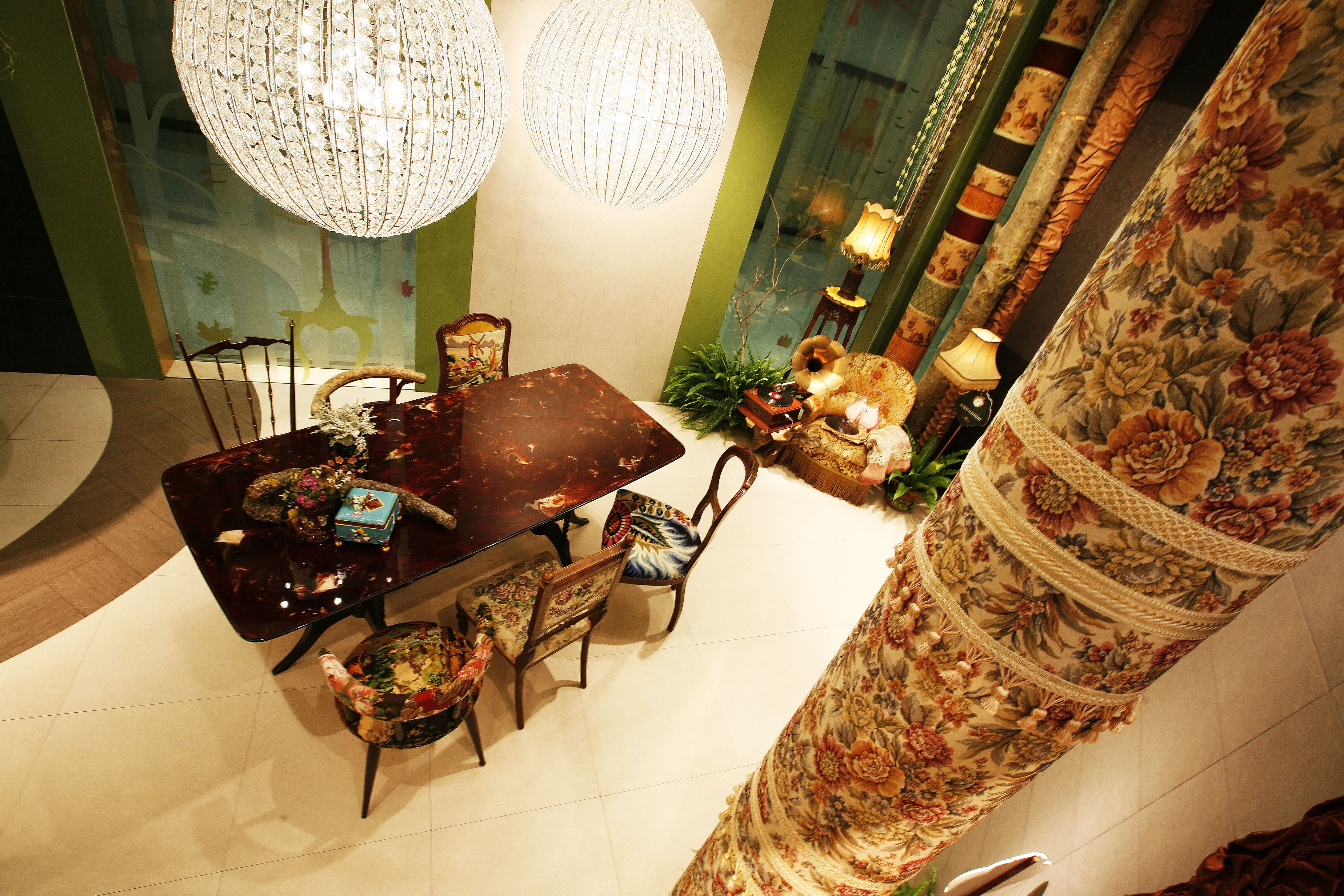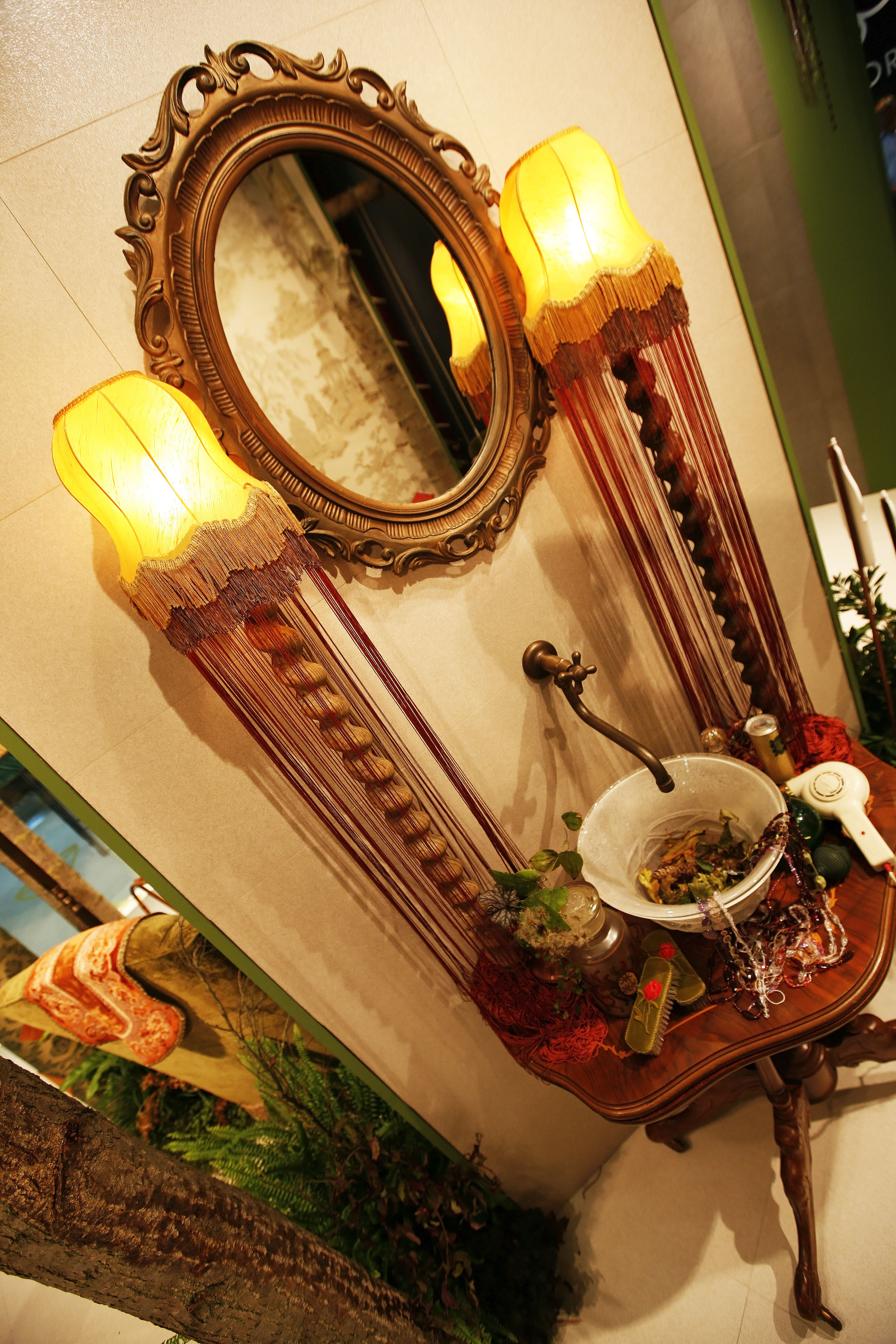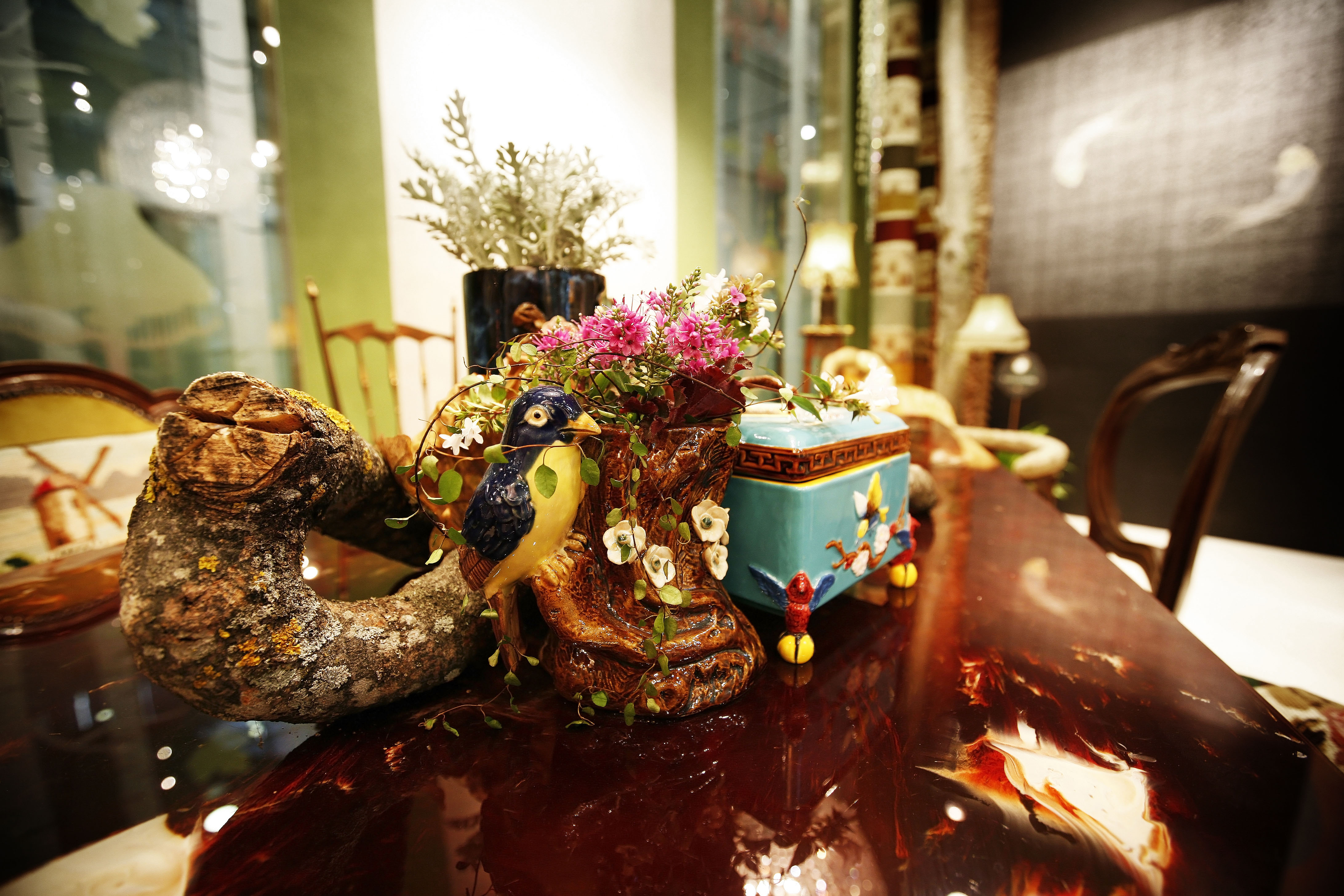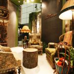 Real logs, coming from replanted crops, alternate and blend with fake tree trunks covered with vintage clothing fabrics that match with the style of the different pieces of furniture, all found in flea markets, in the ecological spirit of recycle and reuse, always respecting the fil rouge of charm, one of the corporate values of Novoceram.