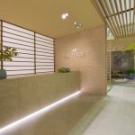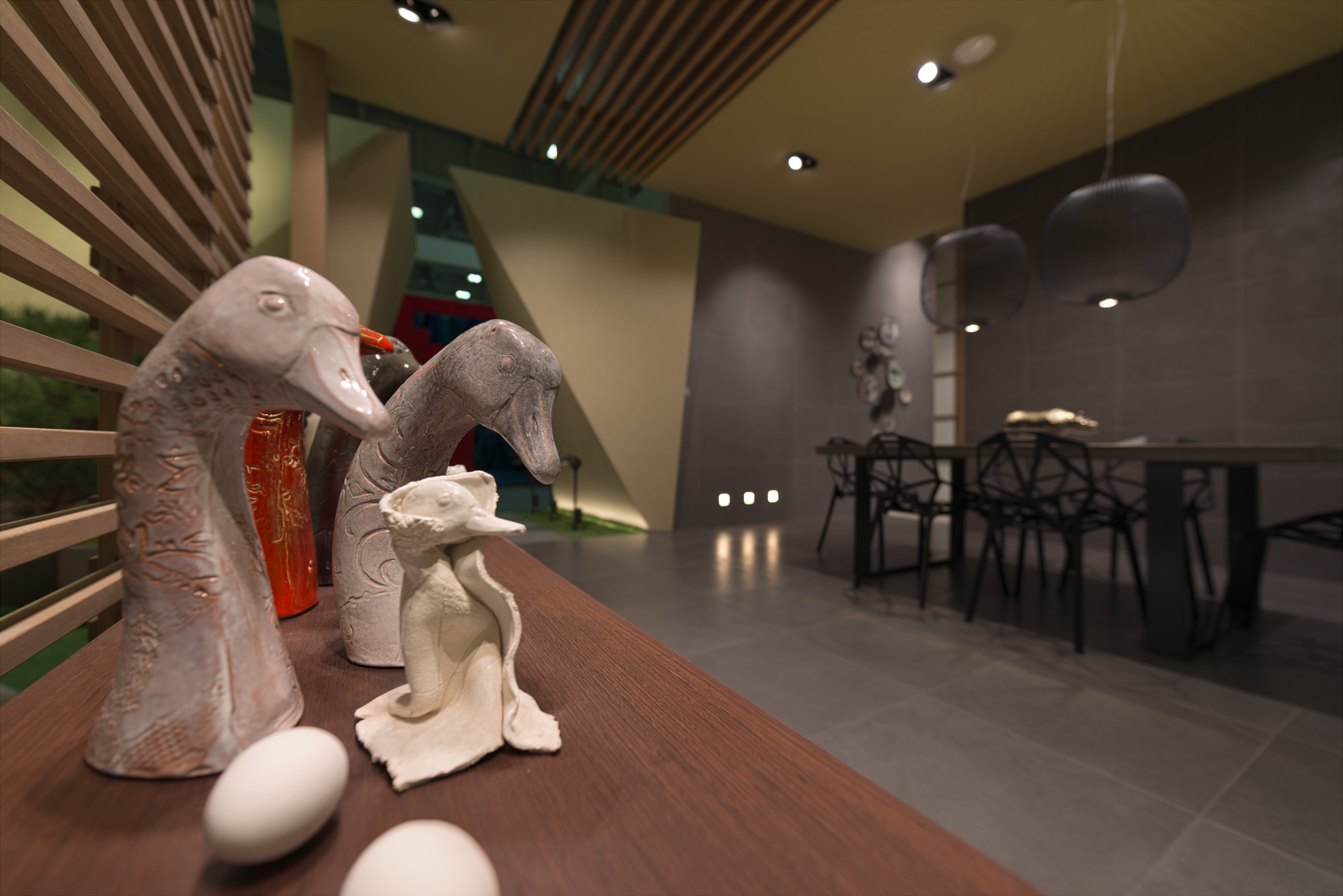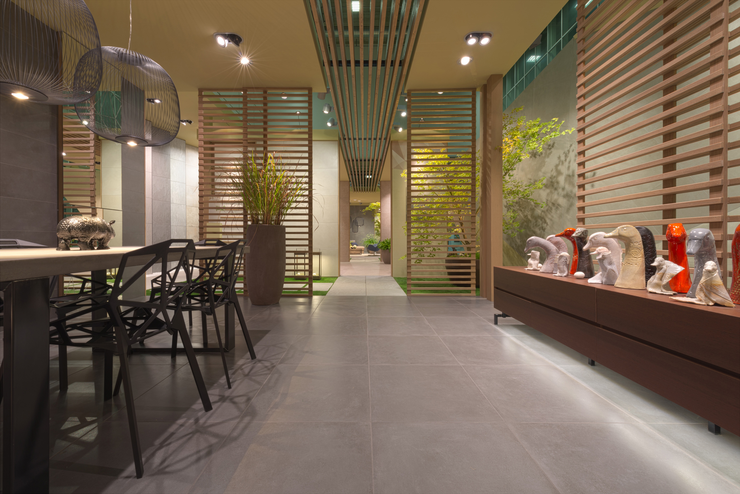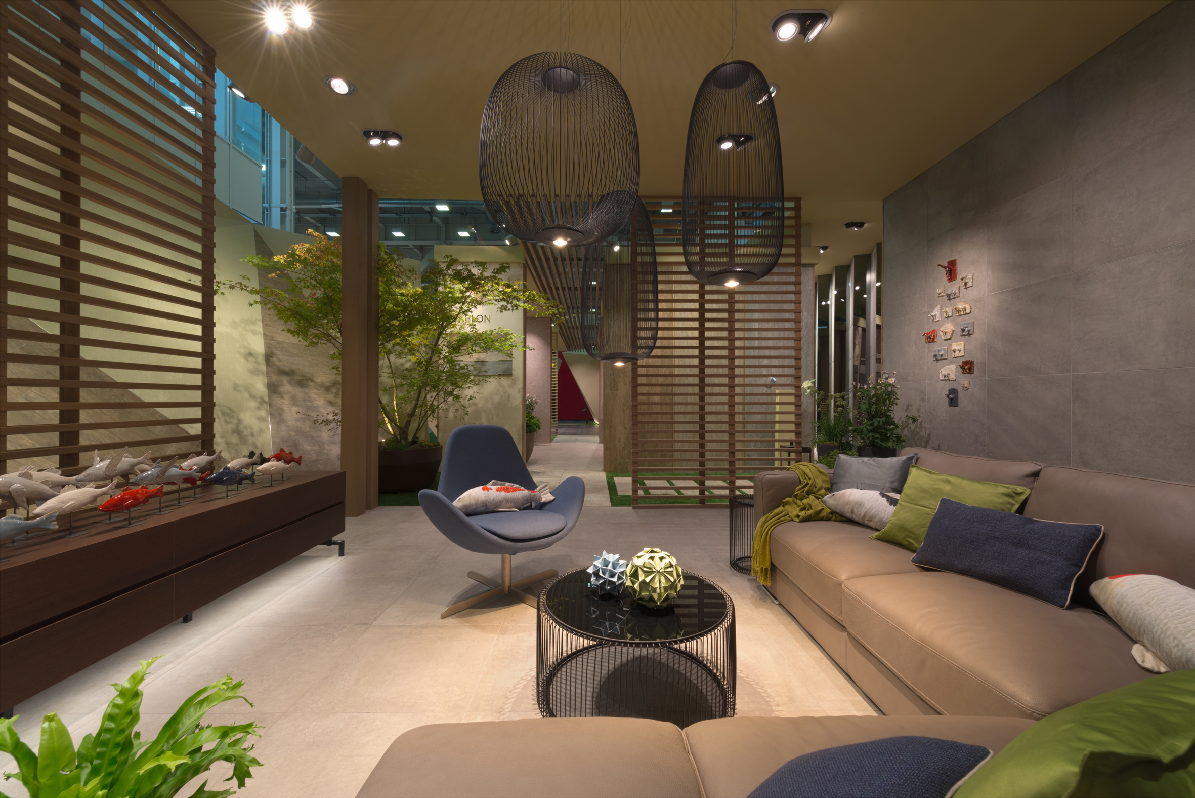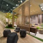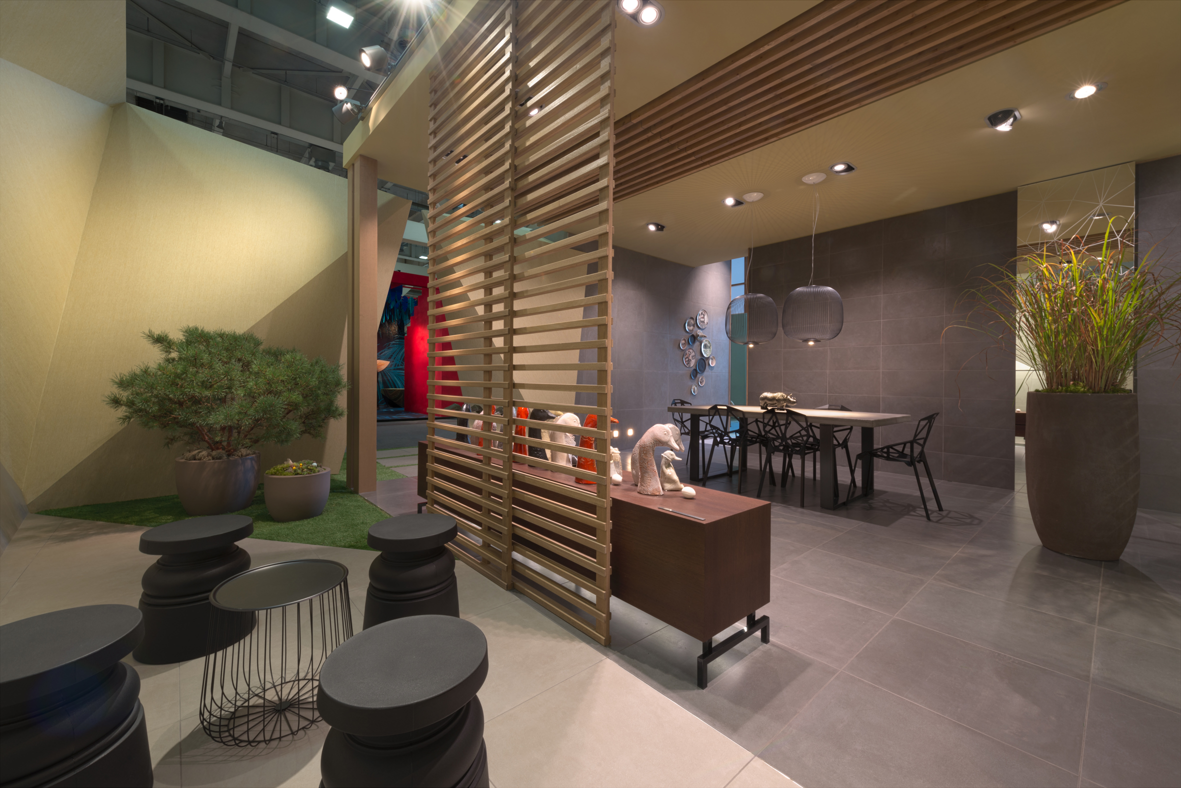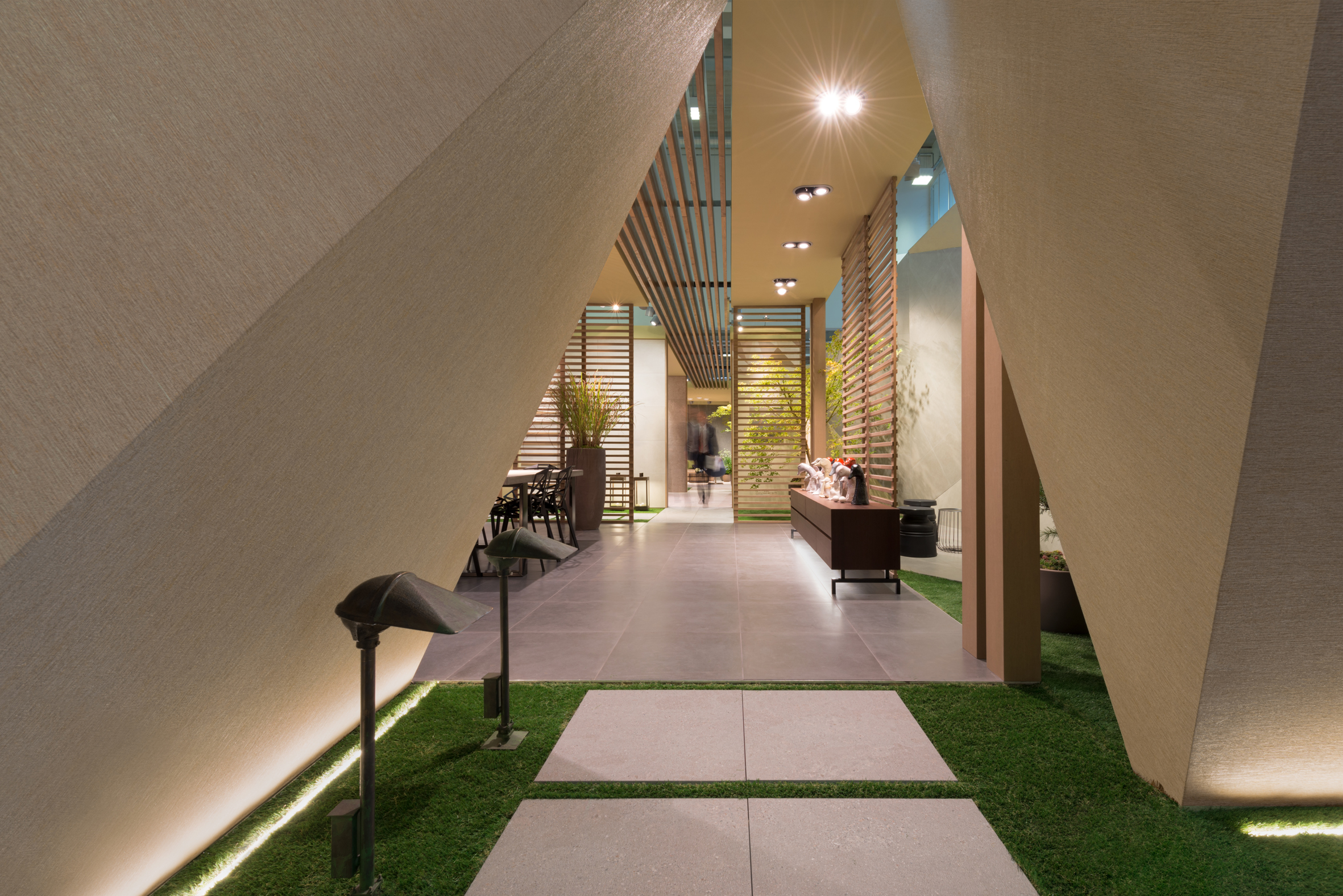 Pervading the places of a Japanese atmosphere, the Origami booth, signed by stands up in a pure form with rhythmic, intelligible and harmonious lines concealing in its heart an intimist and welcoming space, among other things, sculptural ceramics of Amaaro. Origami stands up in a pure form with rhythmic, intelligible and harmonious lines concealing in its heart an intimist and welcoming space, among other things, sculptural ceramics of Amaaro.