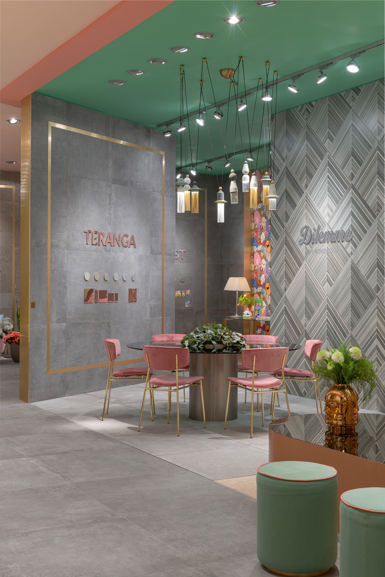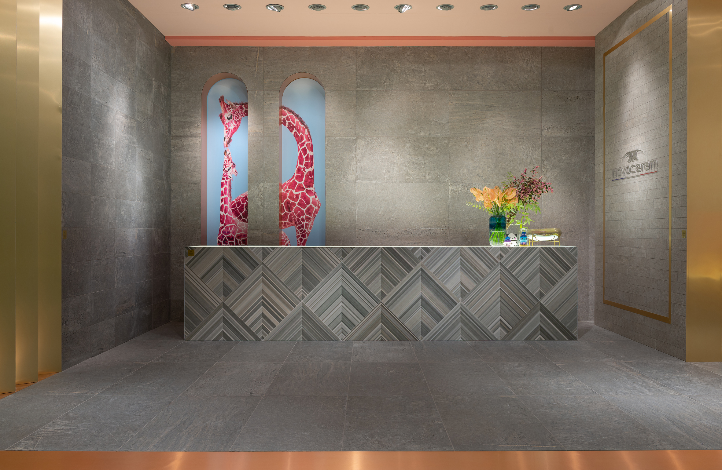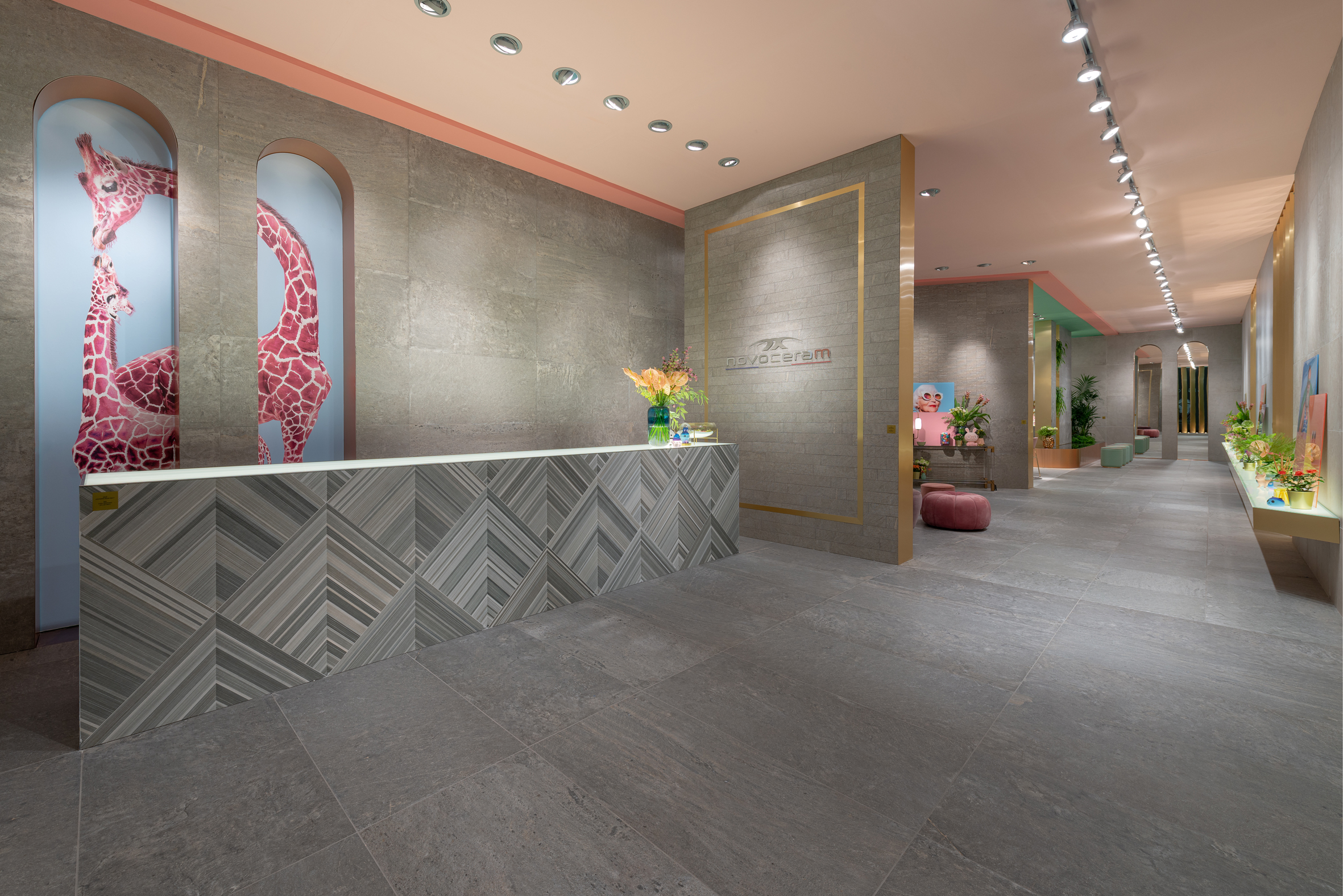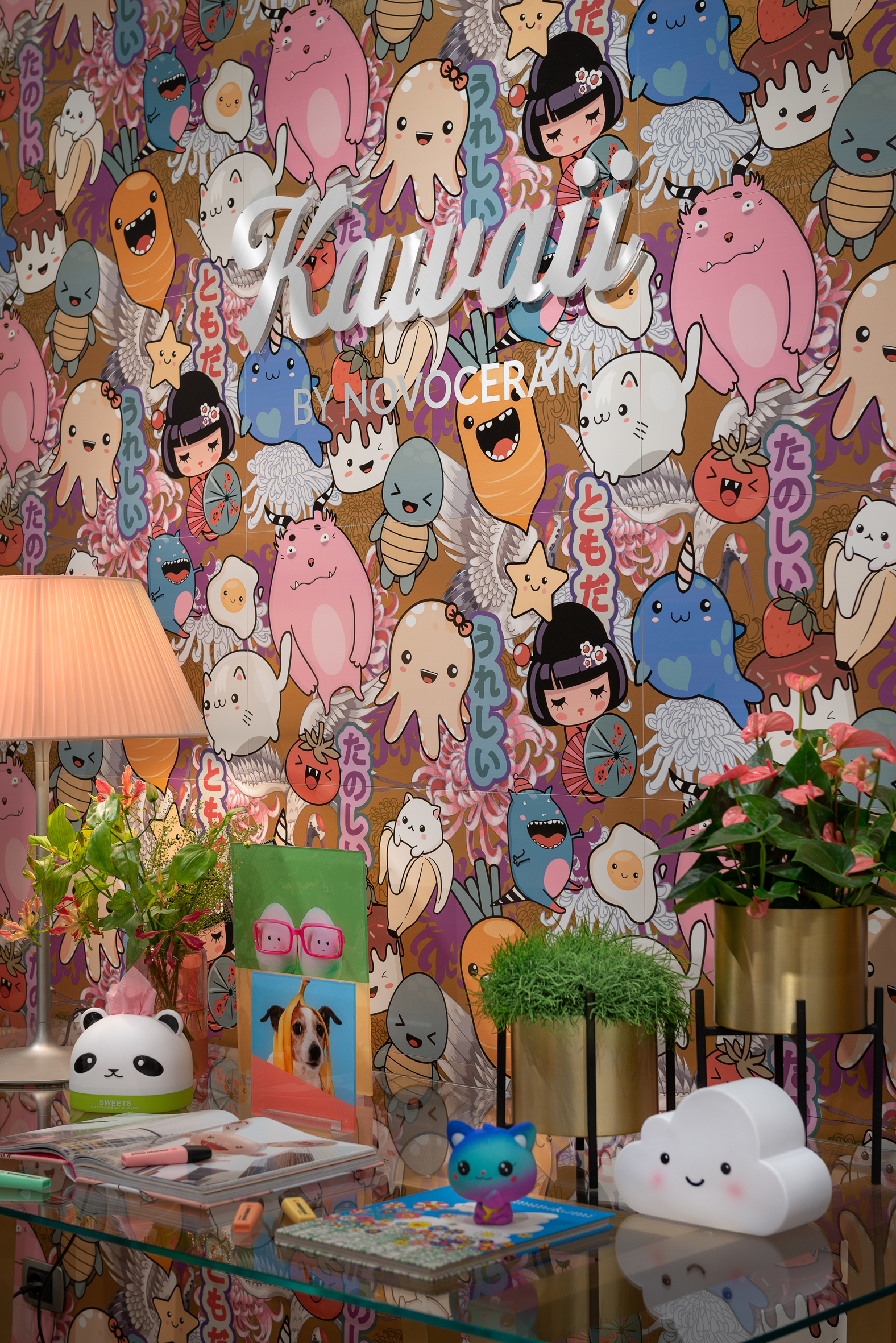 At the reception the geometric style of the Dilemme collection welcomes you, with ceramic wall and floor tiles expressing the three-dimensional lines that recall the Shantung textiles. The salon, a chic chat room, presents Tiber, a novelty that faithfully reproduces one of the most used Roman stones, travertine. In the office space, the unexpected Kawaii collection is unveiled, a way for Novoceram to express its individuality with an atypical composition. The collection is inspired by the “Kawaii” trend – the concept of “cuteness” – originally a Japanese joyful and sparkling graphic style developed in response to its rigid side of post-war culture.