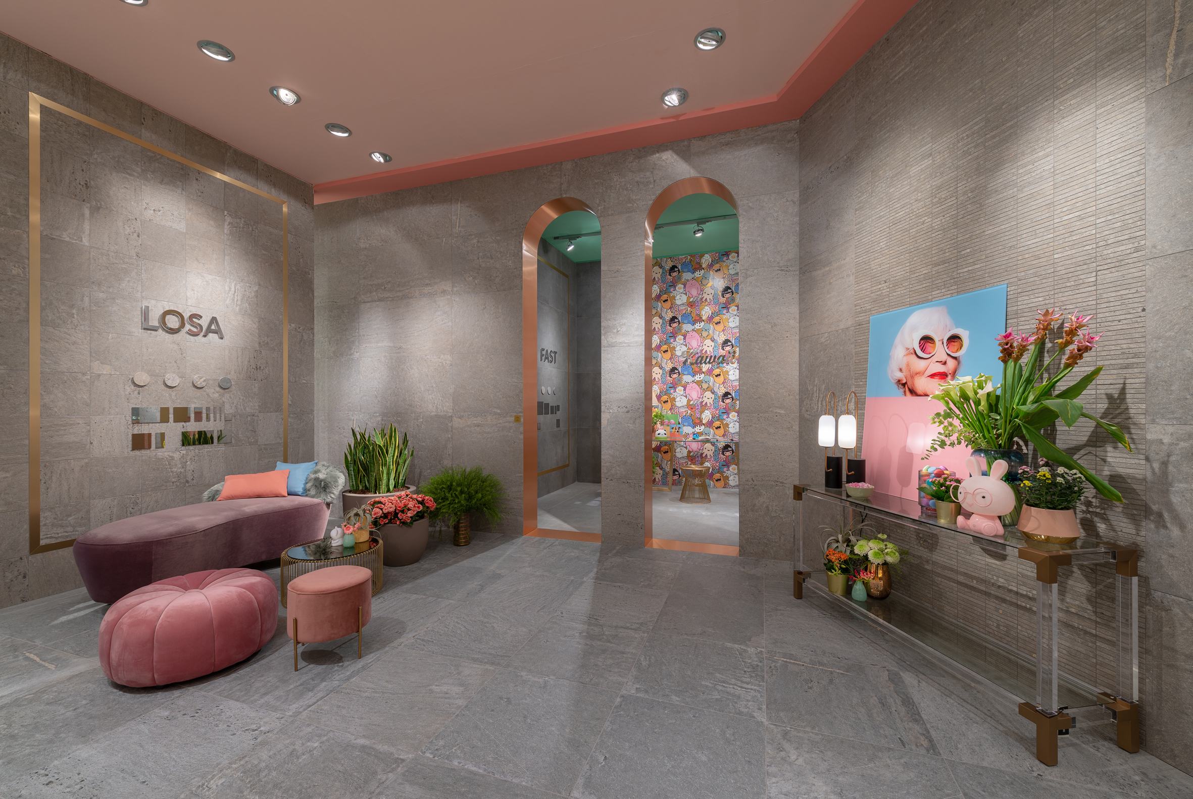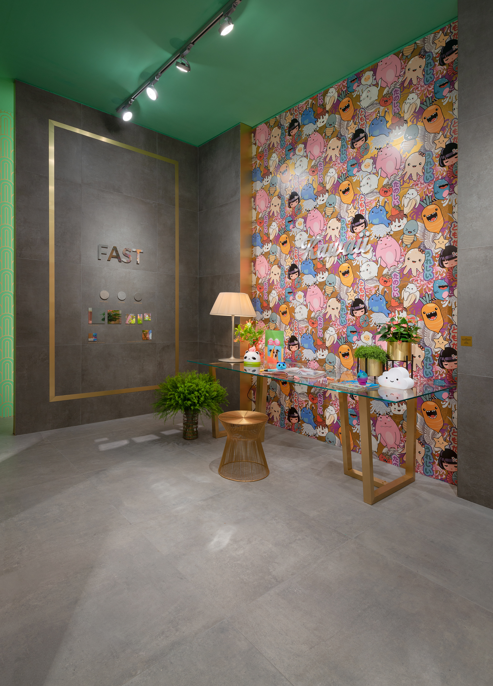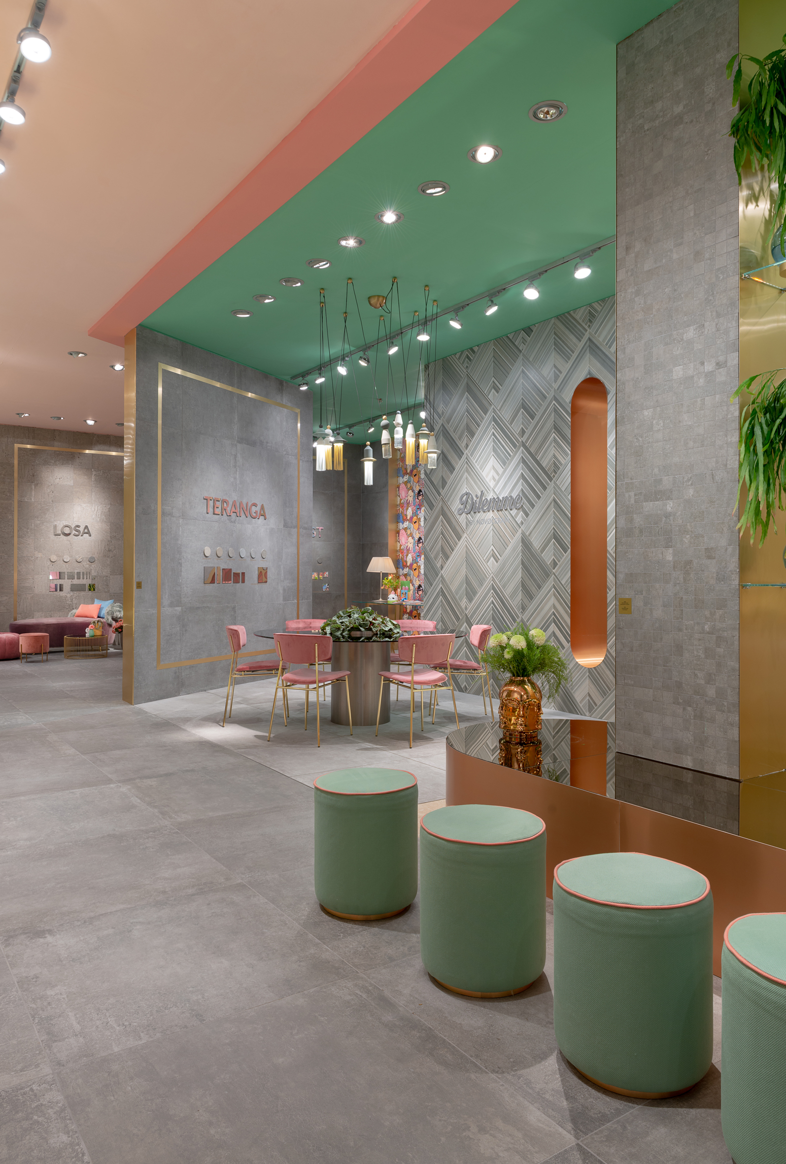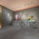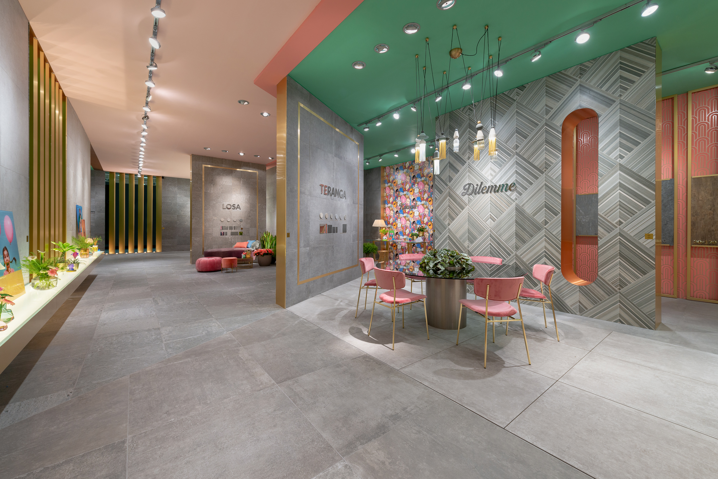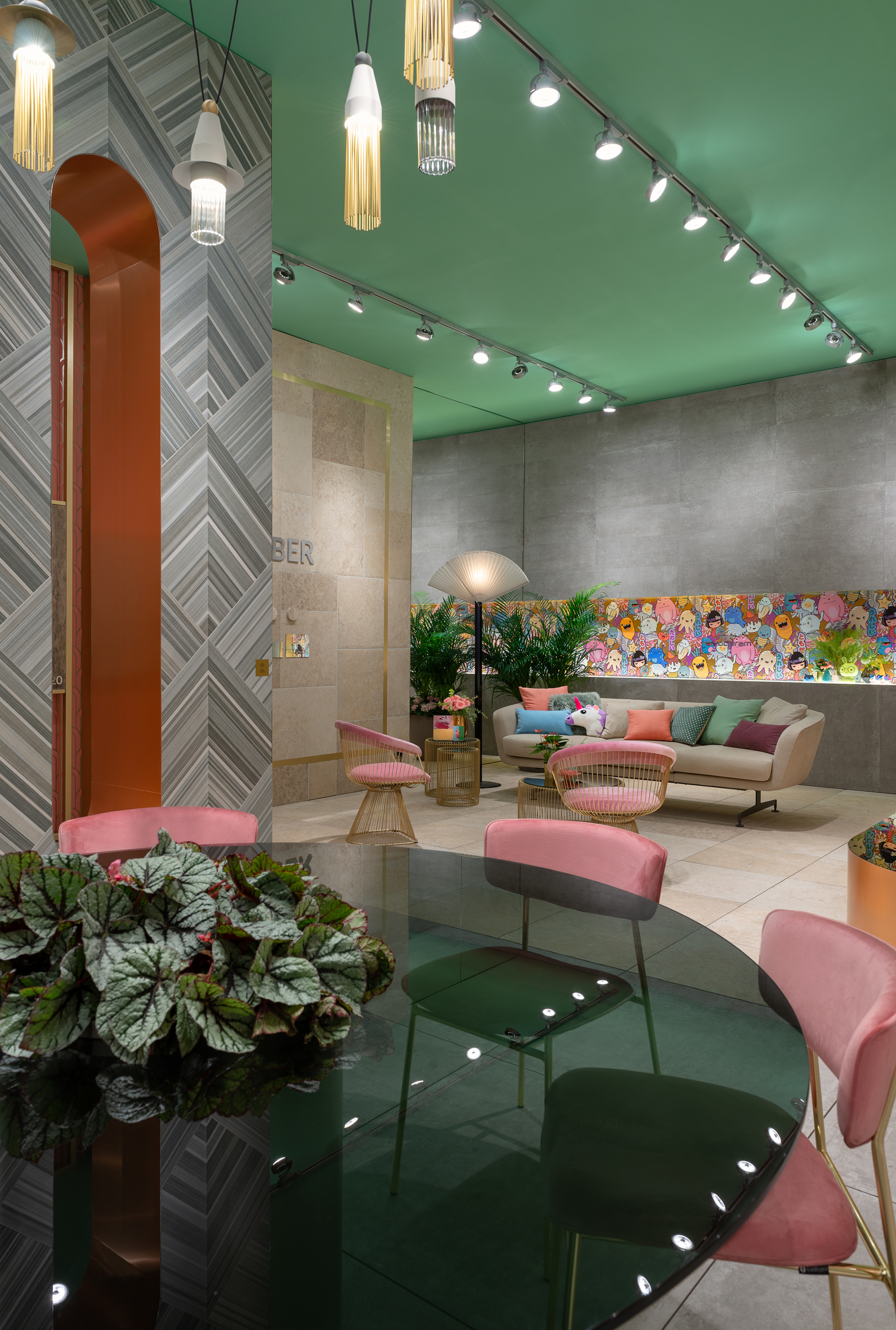 At the reception the geometric style of the Dilemme collection welcomes you, with ceramic wall and floor tiles expressing the three-dimensional lines that recall the Shantung textiles. The salon, a chic chat room, presents Tiber, a novelty that faithfully reproduces one of the most used Roman stones, travertine. In the office space, the unexpected Kawaii collection is unveiled, a way for Novoceram to express its individuality with an atypical composition. The collection is inspired by the “Kawaii” trend – the concept of “cuteness” – originally a Japanese joyful and sparkling graphic style developed in response to its rigid side of post-war culture.