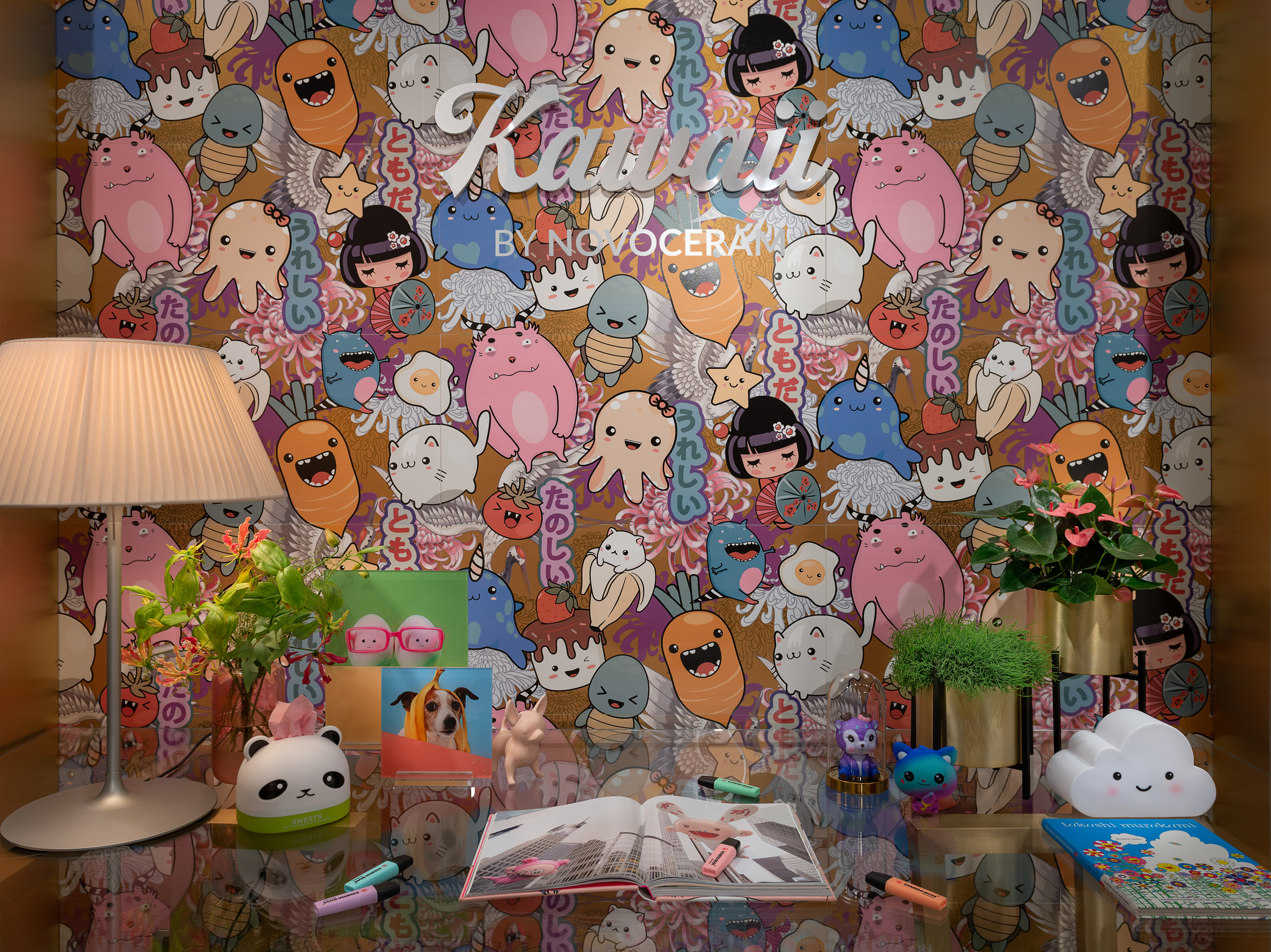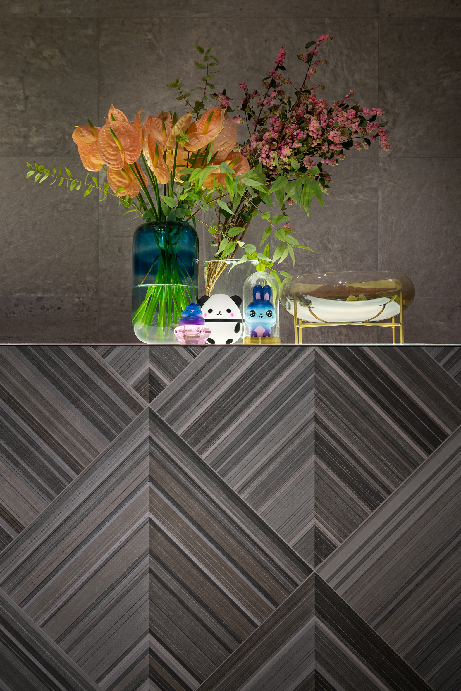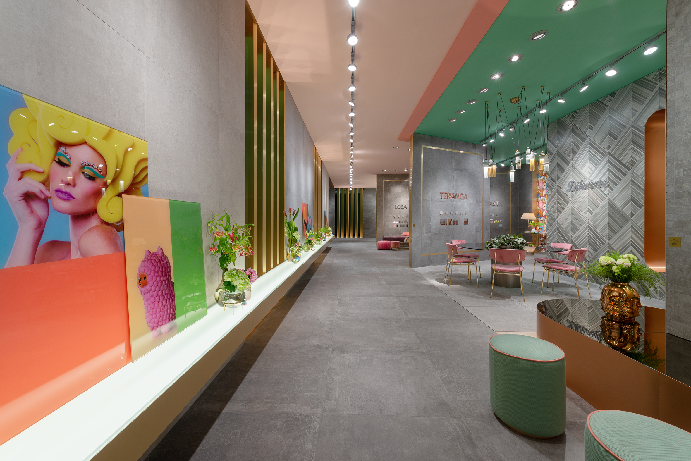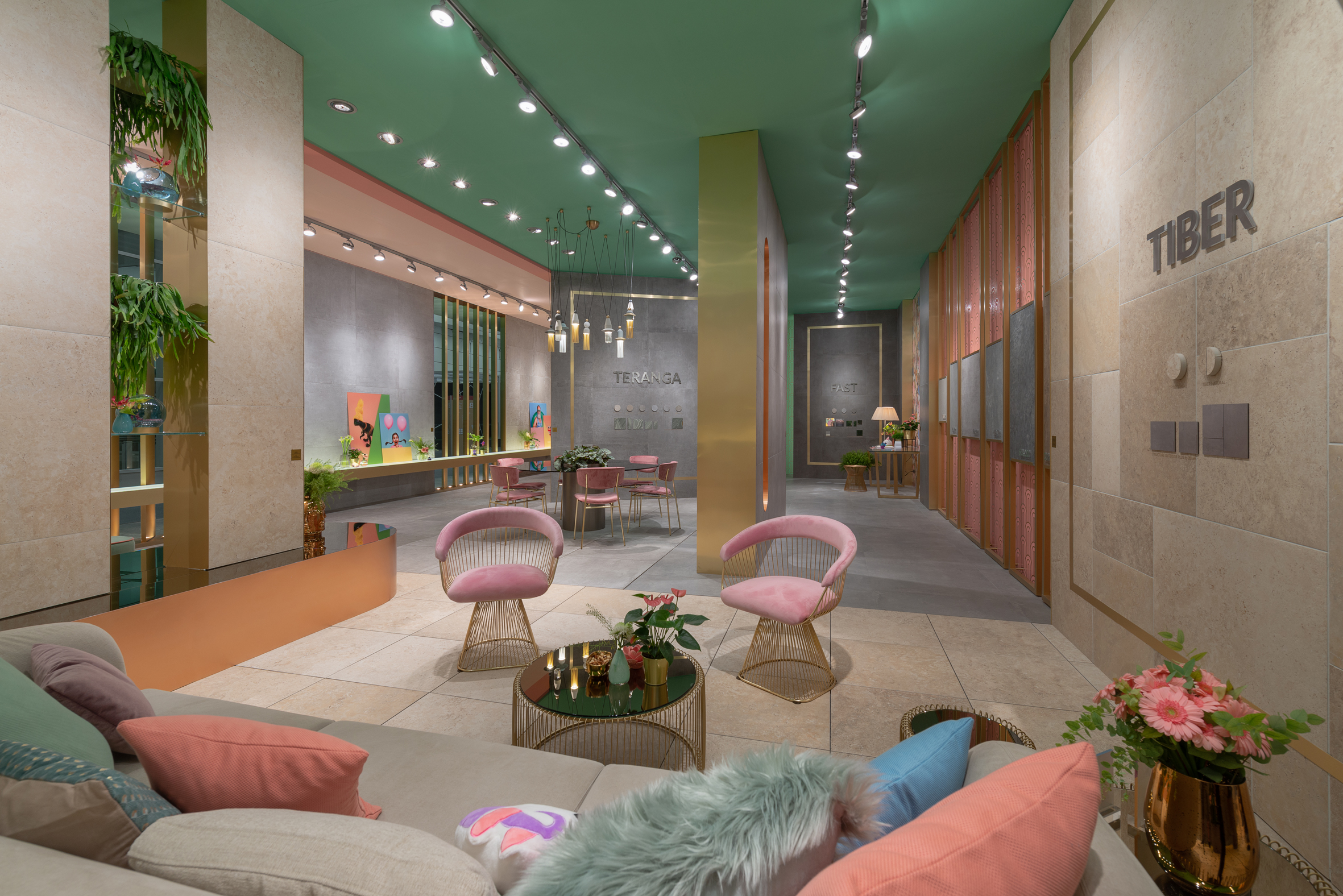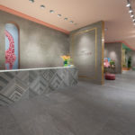 At the reception the geometric style of the Dilemme collection welcomes you, with ceramic wall and floor tiles expressing the three-dimensional lines that recall the Shantung textiles. The salon, a chic chat room, presents Tiber, a novelty that faithfully reproduces one of the most used Roman stones, travertine. In the office space, the unexpected Kawaii collection is unveiled, a way for Novoceram to express its individuality with an atypical composition. The collection is inspired by the “Kawaii” trend – the concept of “cuteness” – originally a Japanese joyful and sparkling graphic style developed in response to its rigid side of post-war culture.