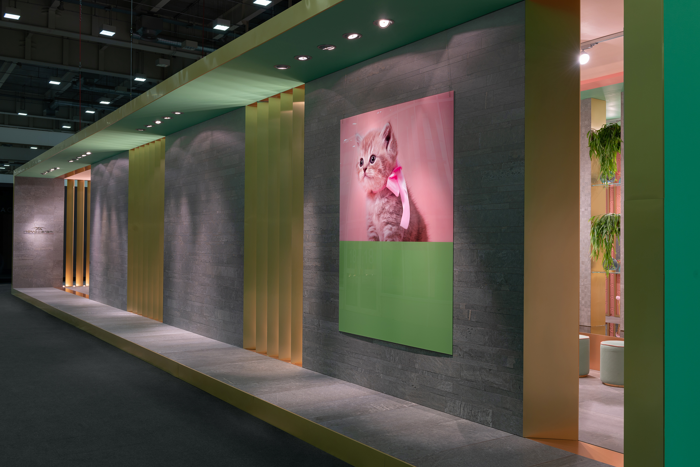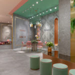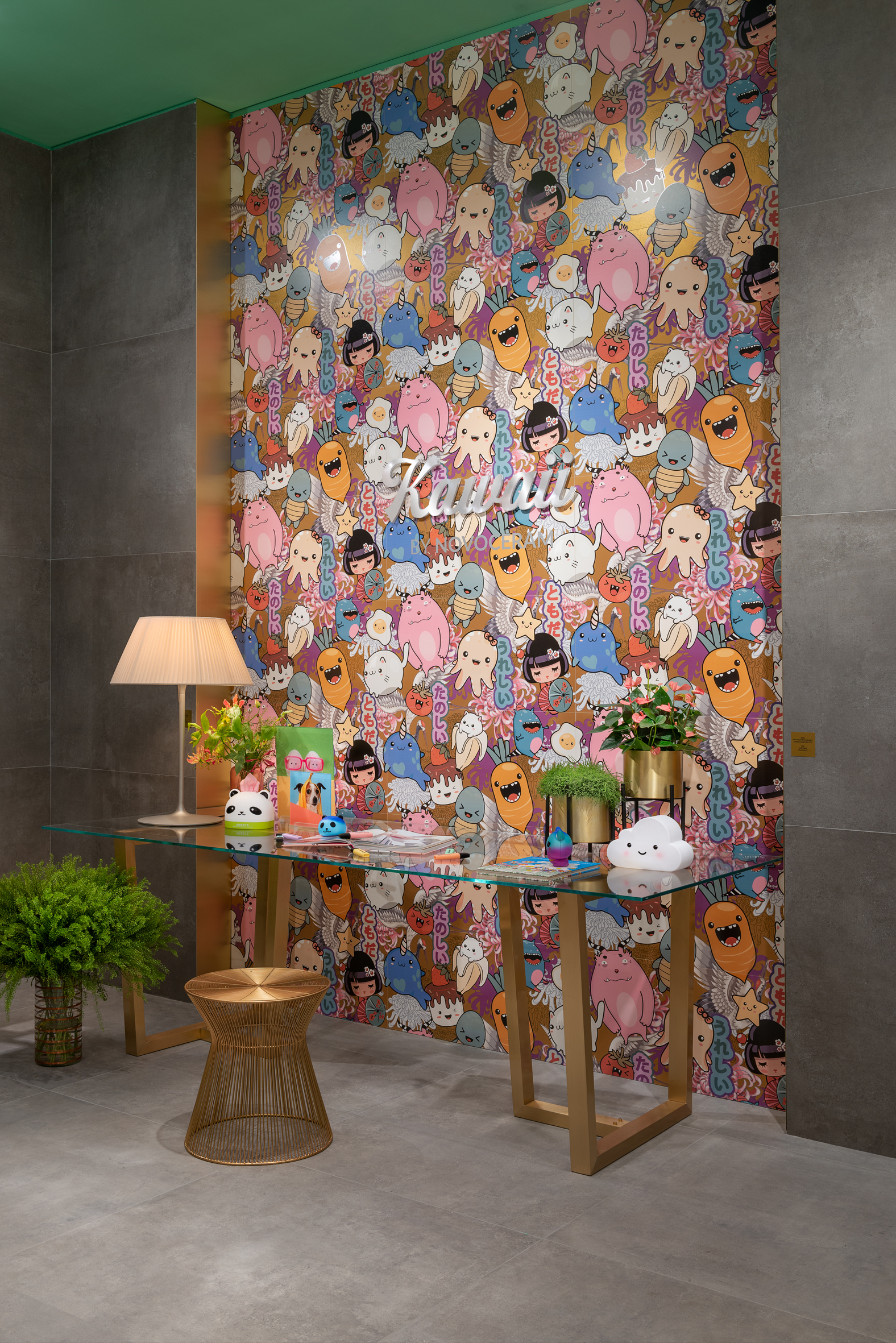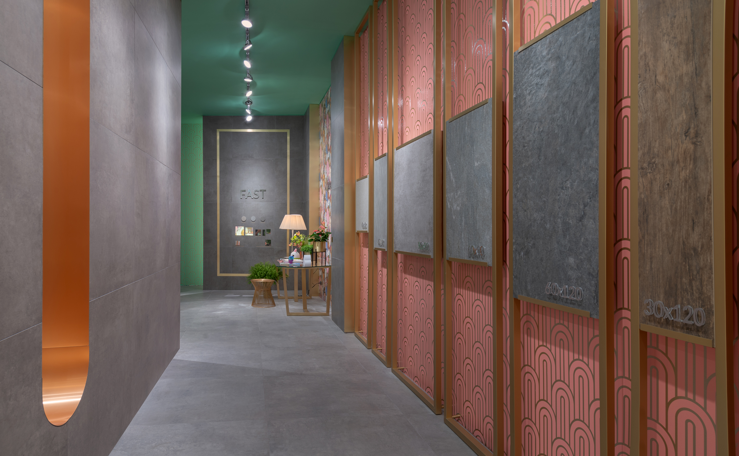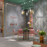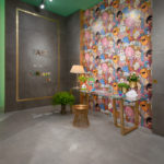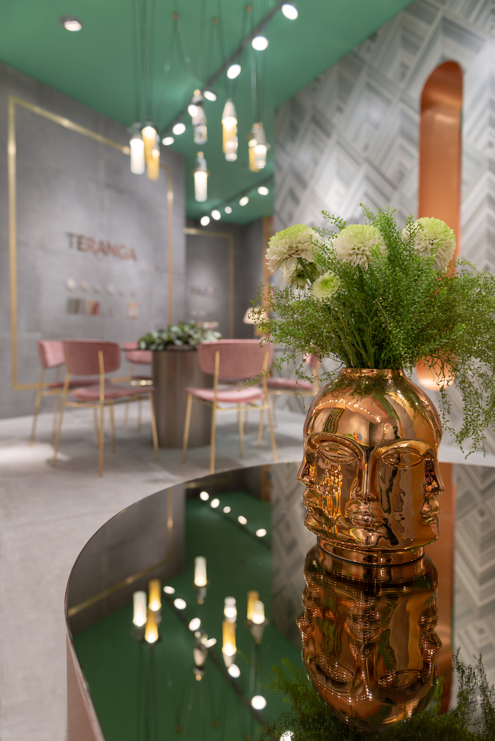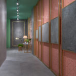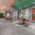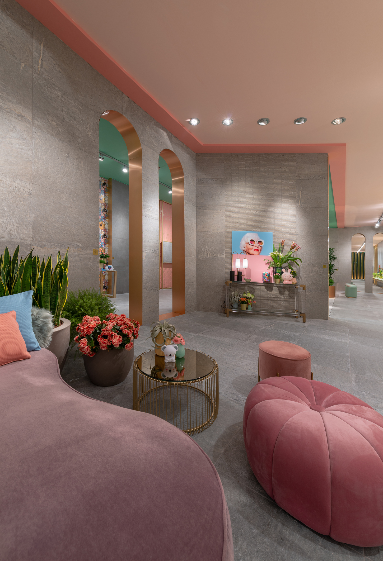 At the reception the geometric style of the Dilemme collection welcomes you, with ceramic wall and floor tiles expressing the three-dimensional lines that recall the Shantung textiles. The salon, a chic chat room, presents Tiber, a novelty that faithfully reproduces one of the most used Roman stones, travertine. In the office space, the unexpected Kawaii collection is unveiled, a way for Novoceram to express its individuality with an atypical composition. The collection is inspired by the “Kawaii” trend – the concept of “cuteness” – originally a Japanese joyful and sparkling graphic style developed in response to its rigid side of post-war culture.