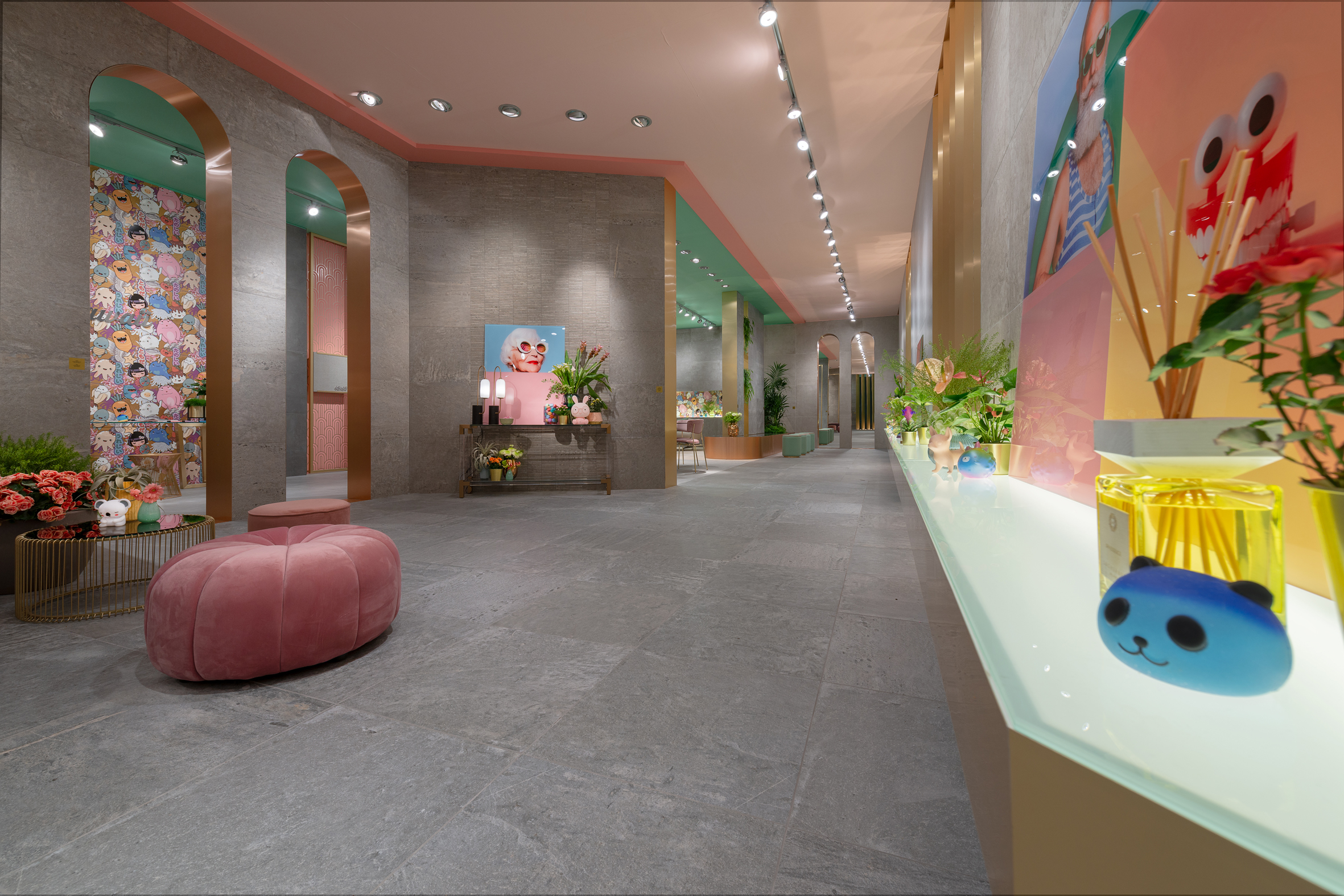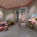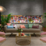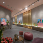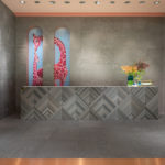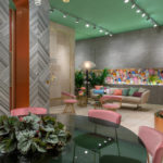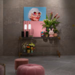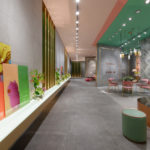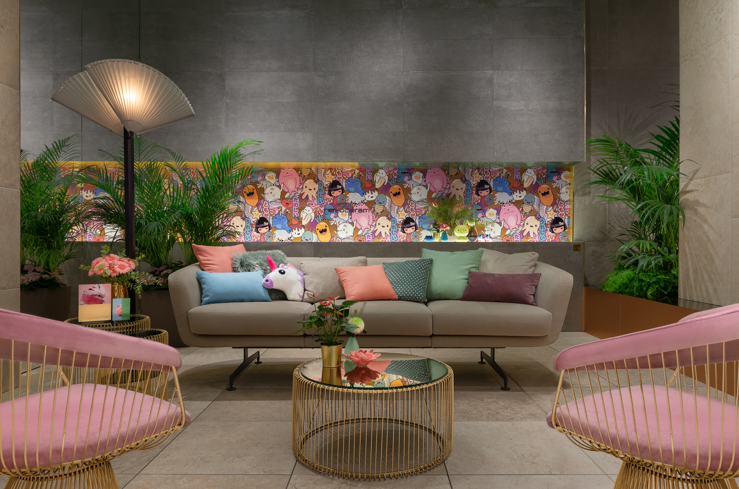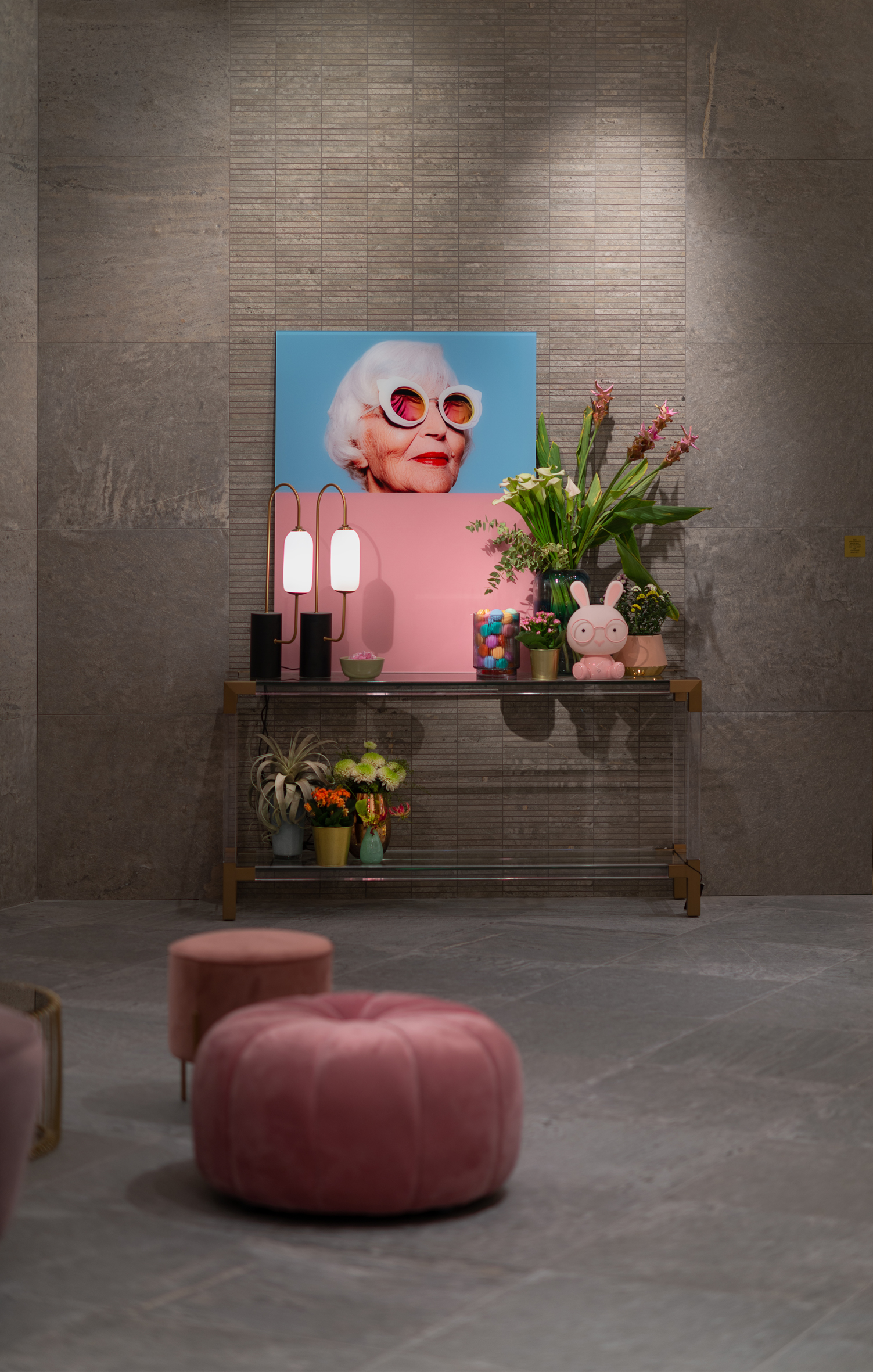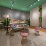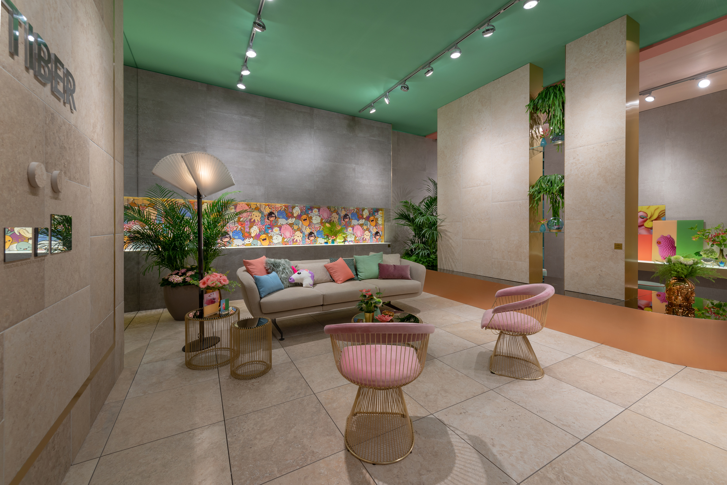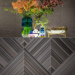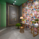 At the reception the geometric style of the Dilemme collection welcomes you, with ceramic wall and floor tiles expressing the three-dimensional lines that recall the Shantung textiles. The salon, a chic chat room, presents Tiber, a novelty that faithfully reproduces one of the most used Roman stones, travertine. In the office space, the unexpected Kawaii collection is unveiled, a way for Novoceram to express its individuality with an atypical composition. The collection is inspired by the “Kawaii” trend – the concept of “cuteness” – originally a Japanese joyful and sparkling graphic style developed in response to its rigid side of post-war culture.