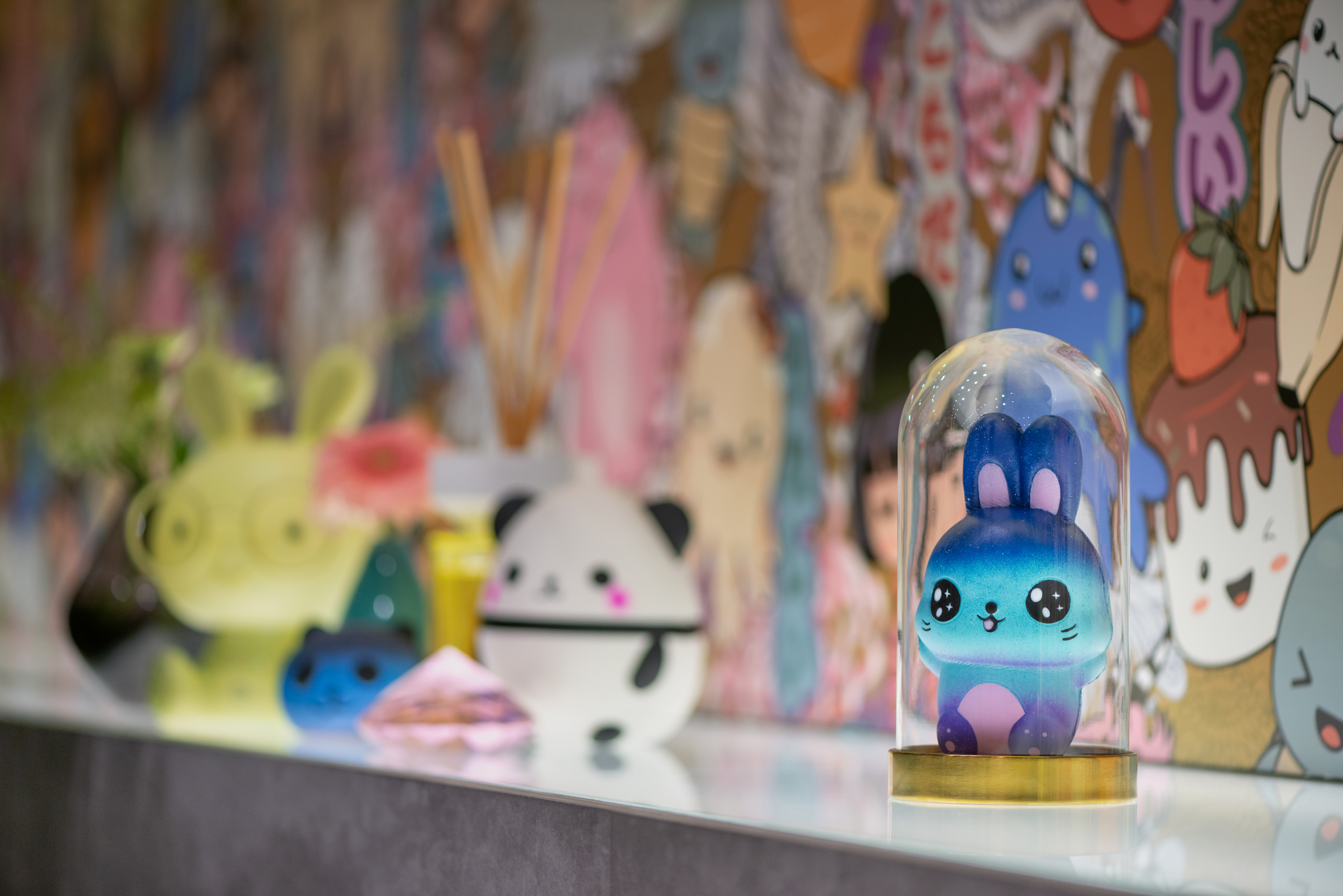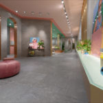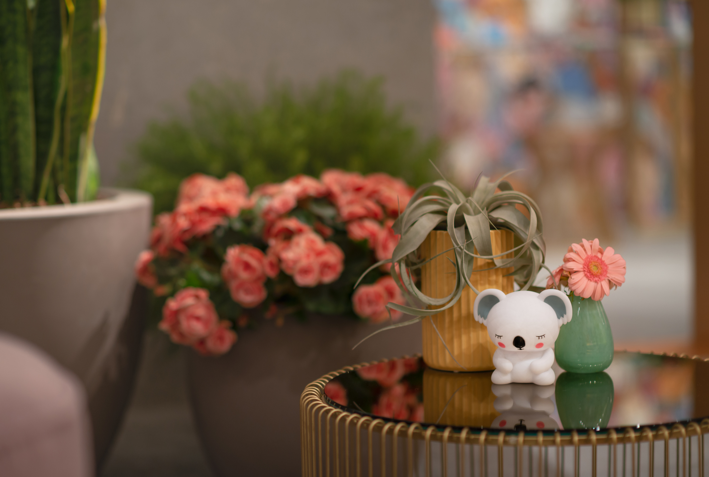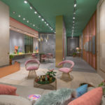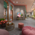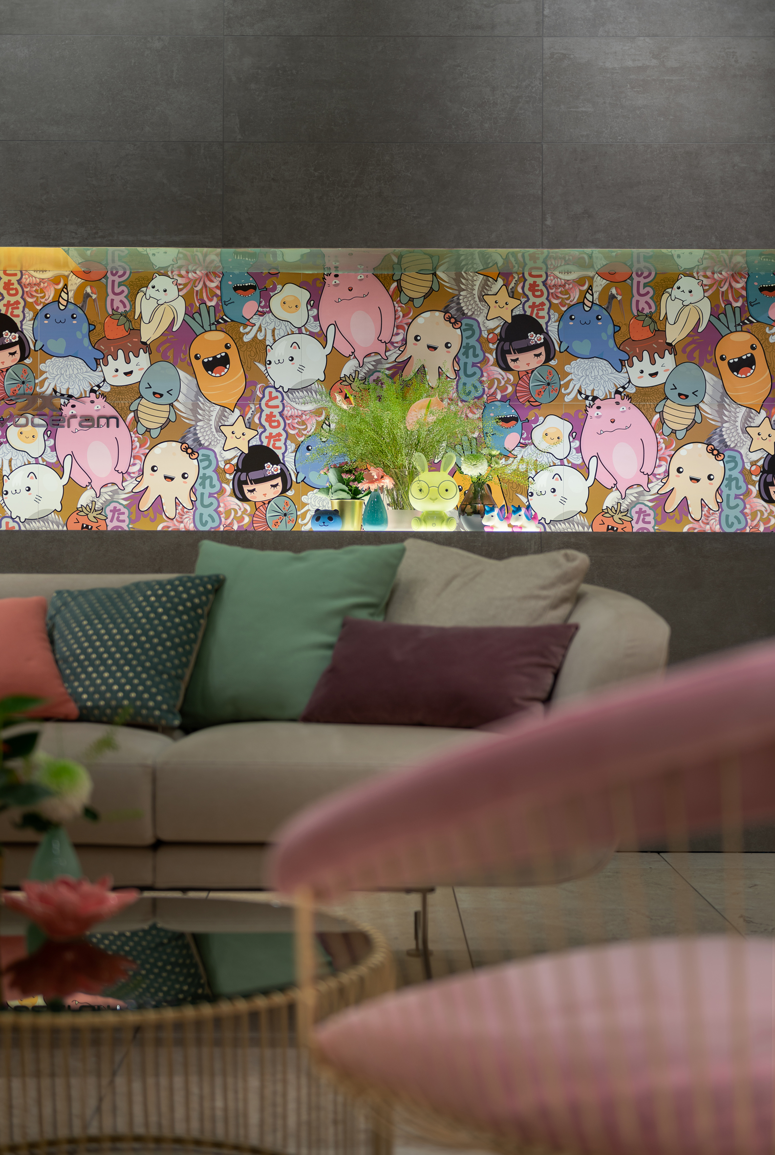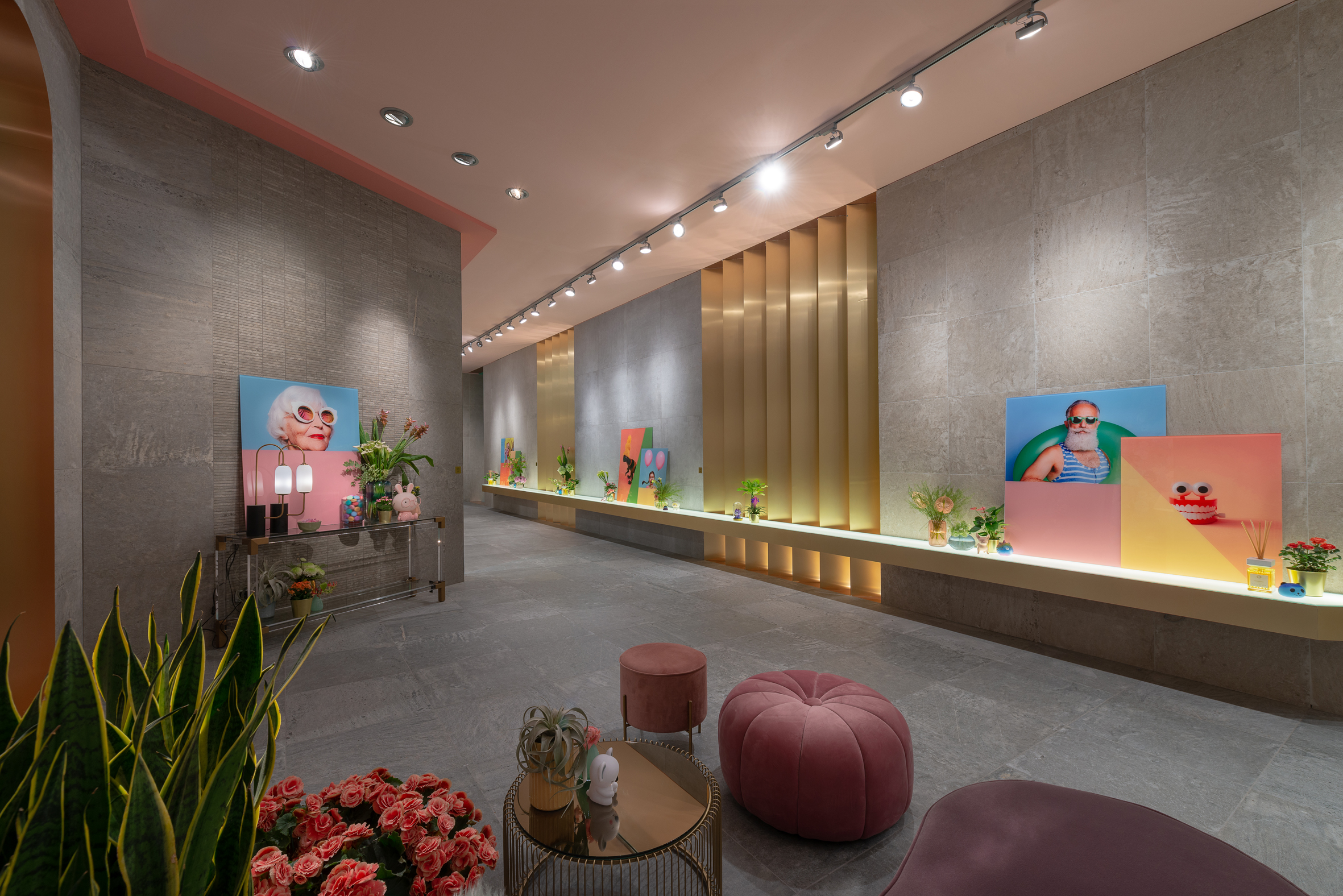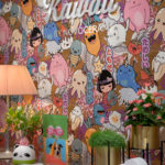 At the reception the geometric style of the Dilemme collection welcomes you, with ceramic wall and floor tiles expressing the three-dimensional lines that recall the Shantung textiles. The salon, a chic chat room, presents Tiber, a novelty that faithfully reproduces one of the most used Roman stones, travertine. In the office space, the unexpected Kawaii collection is unveiled, a way for Novoceram to express its individuality with an atypical composition. The collection is inspired by the “Kawaii” trend – the concept of “cuteness” – originally a Japanese joyful and sparkling graphic style developed in response to its rigid side of post-war culture.