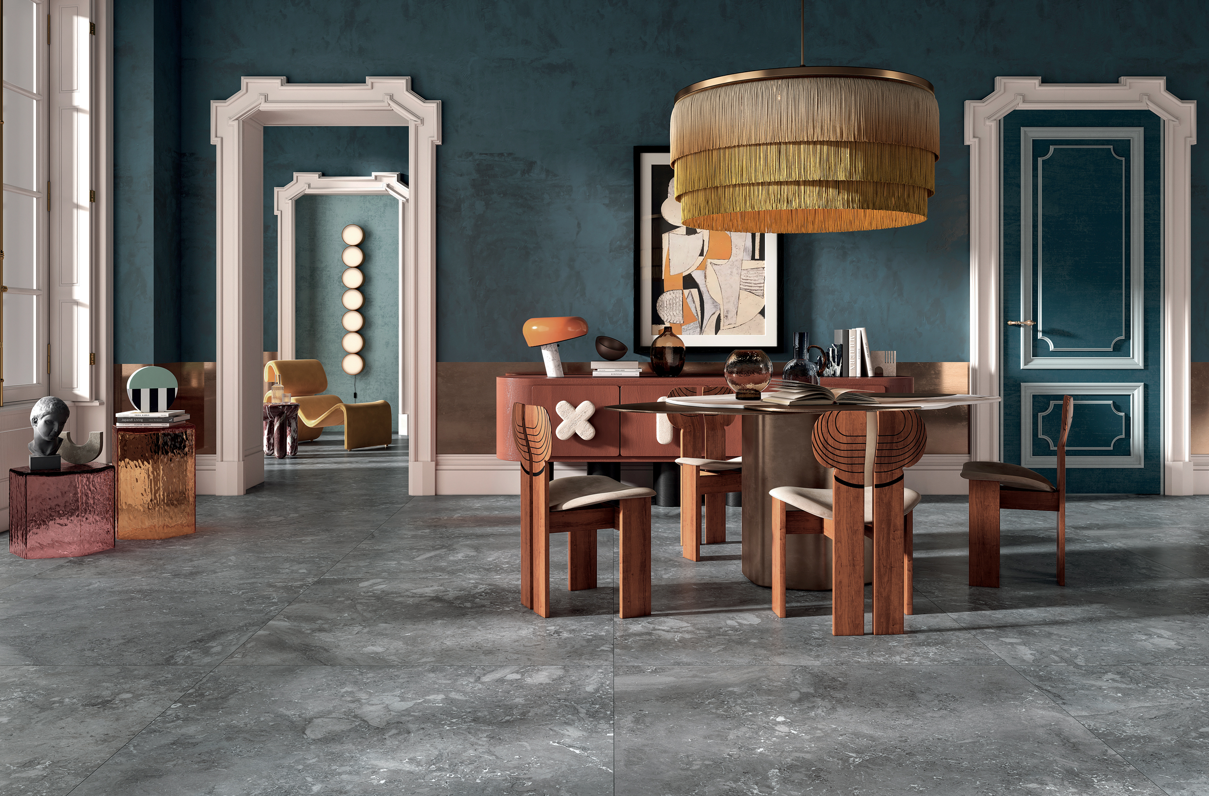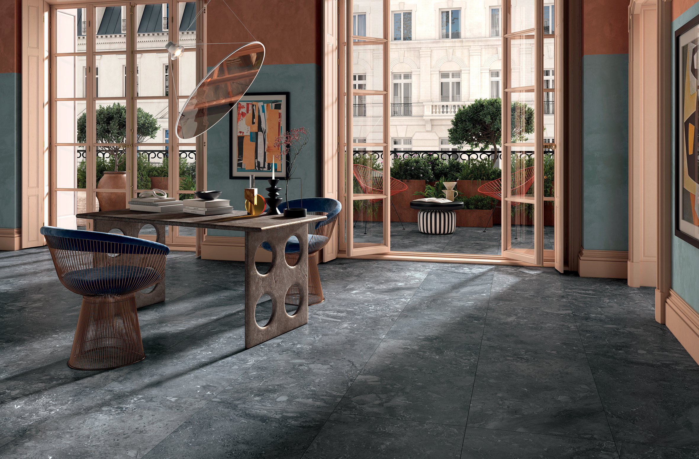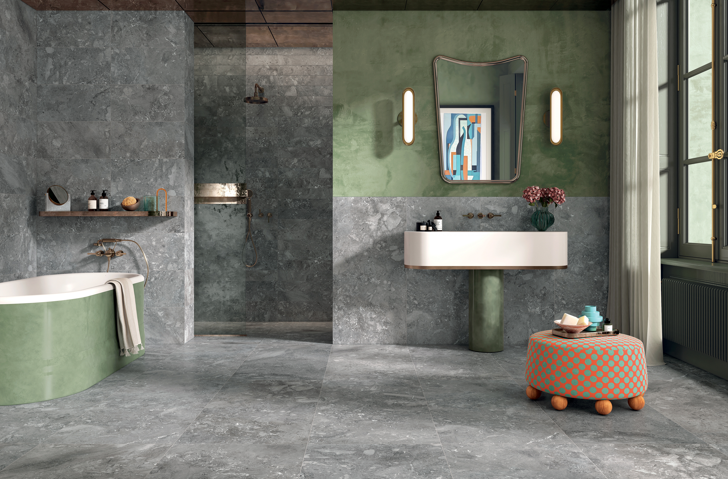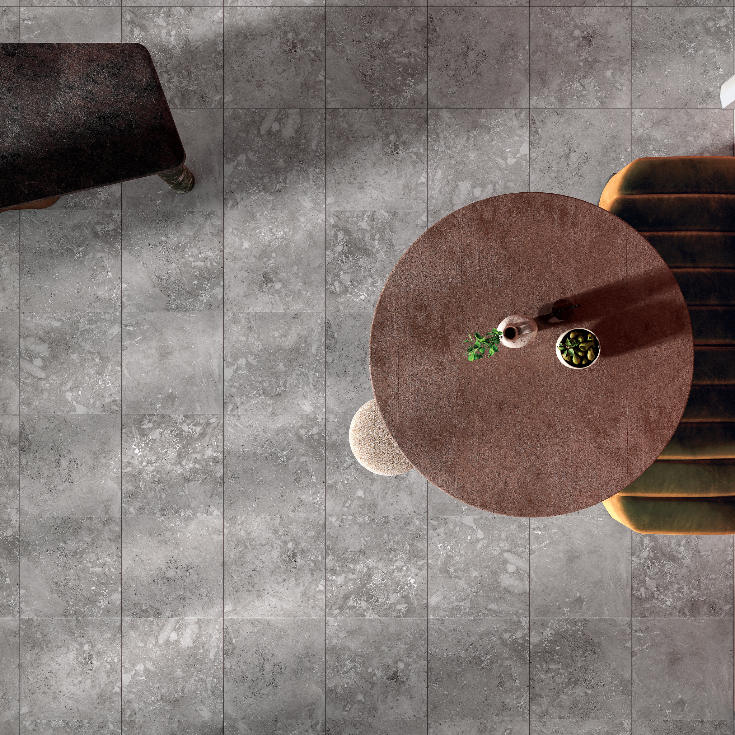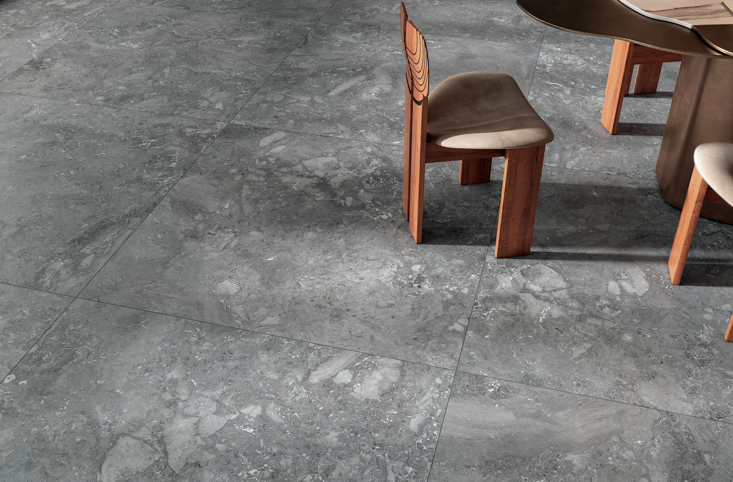 Kryo is offered in Natural colour, in which the dominant shade is a cold grey; in Intense colour, with decidedly darker and more marked tones; and finally in Frost colour: a proposal of warmer grey tones with shades tending towards beige.
