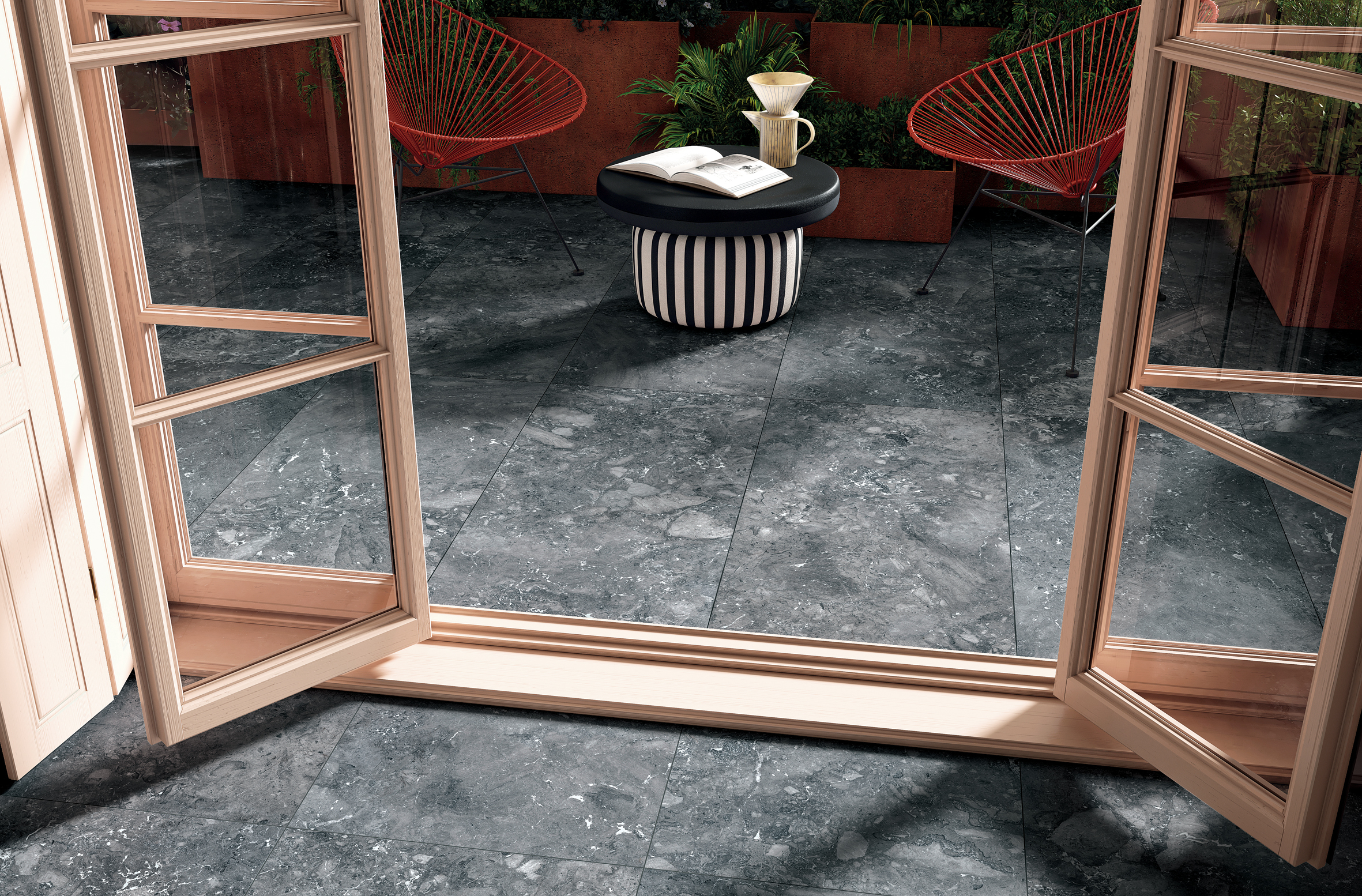 Kryo is available in 9.0 mm thickness in sizes 120×120, 60×120, 60×60 and 30×60 with R10 – B finish. For outdoor use, the range is completed by the 60×120 Outdoor Plus and 60×60 Outdoor Plus formats in 20 mm thickness with structured finish and R11 – C non-slip characteristics.