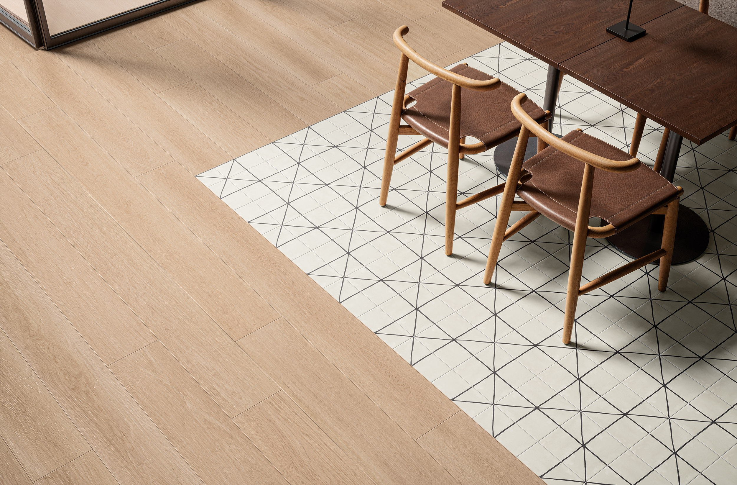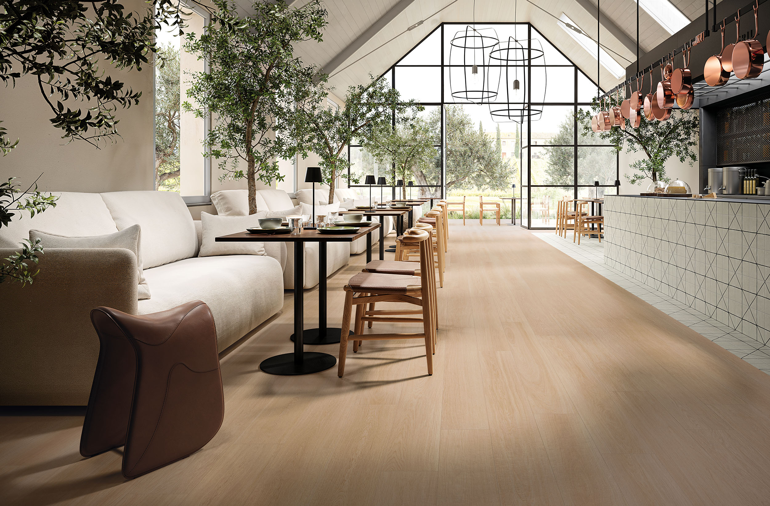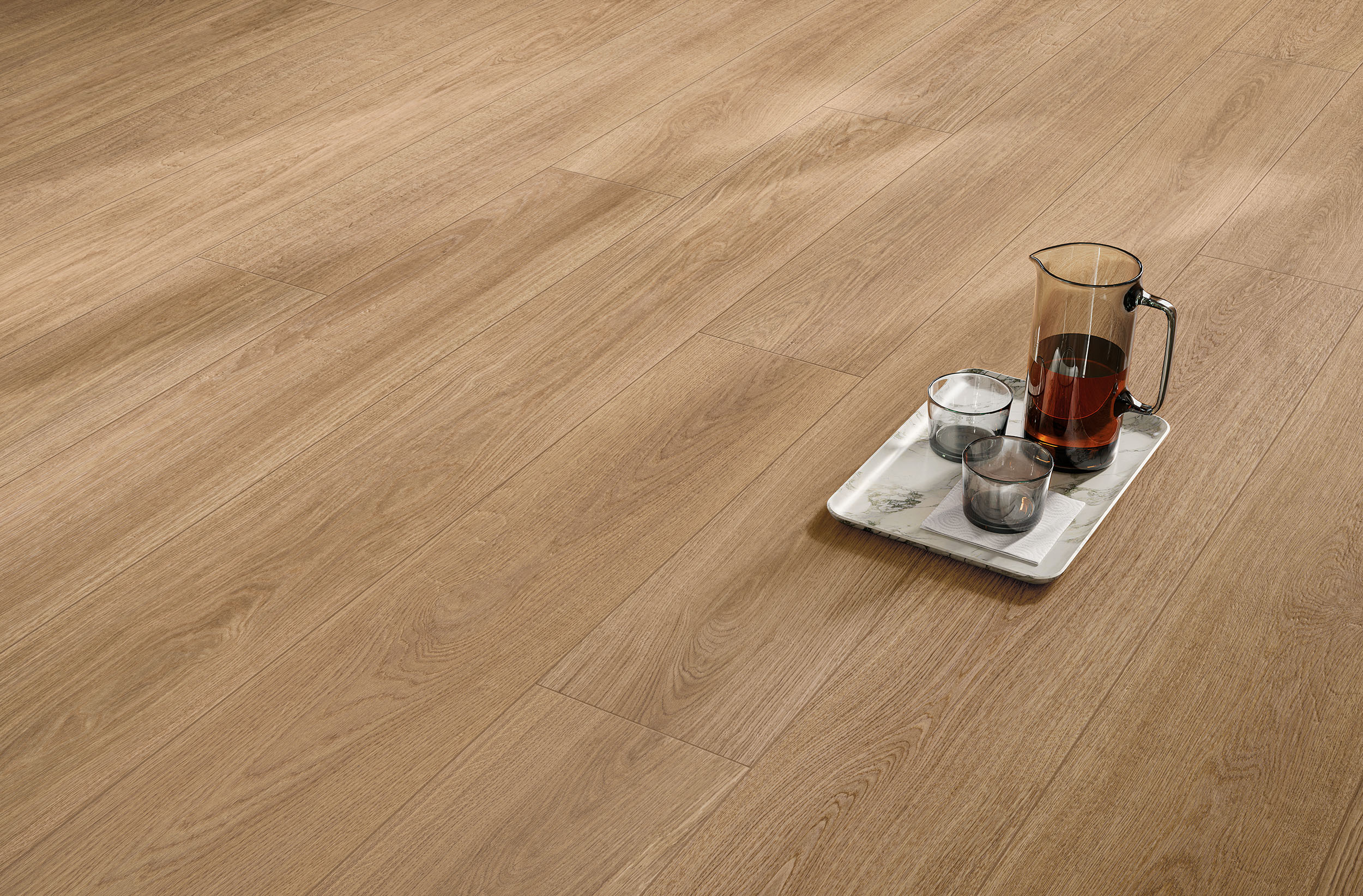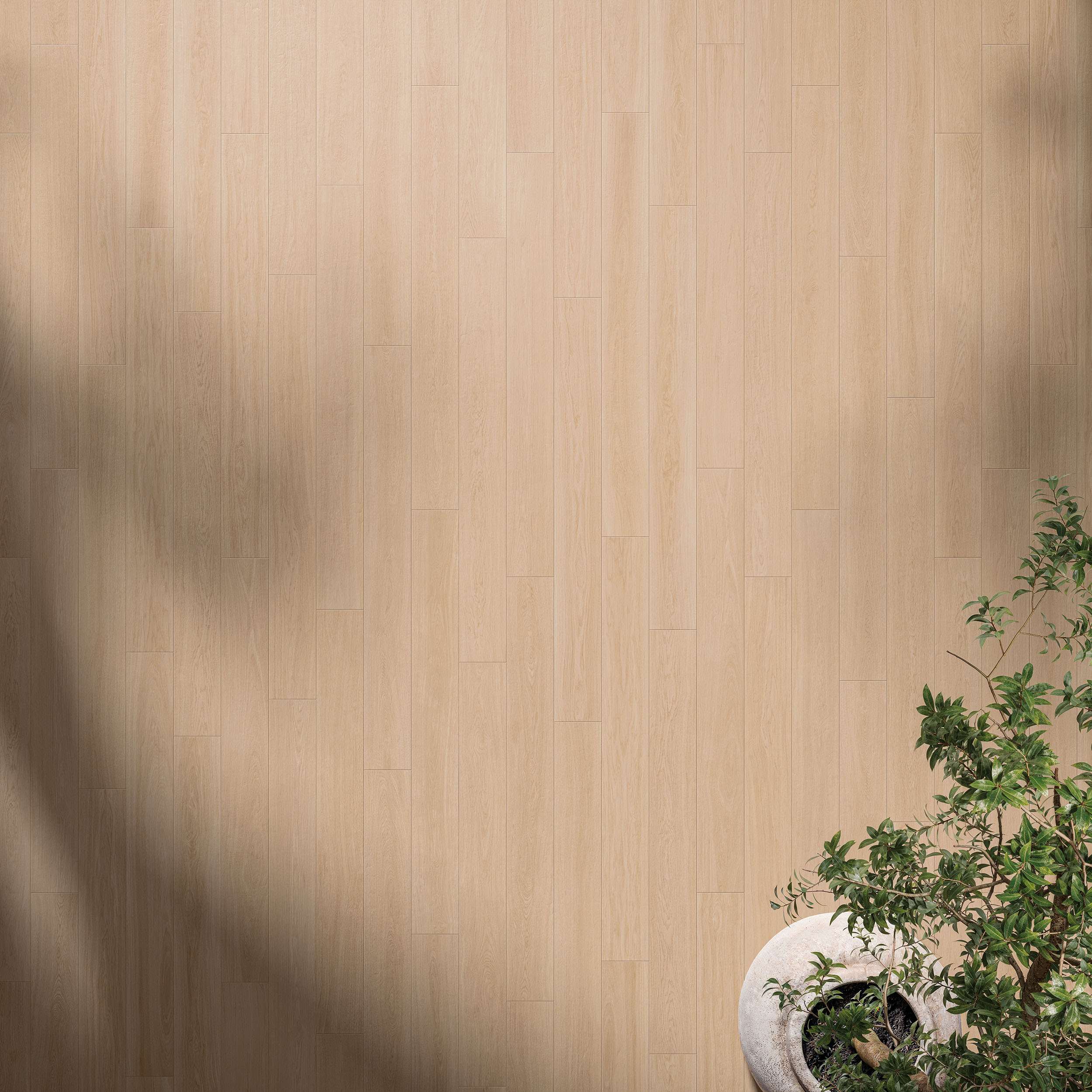 The result of this selection is a wood-effect tile with a minimalist design, ideal for recreating surfaces of uniform tone, but which at a closer look reveals the many details that characterise oak wood such as the fine grain of the subtle veining and the subtle chiaroscuro nuances. which lend great depth to a product with a contemporary taste.