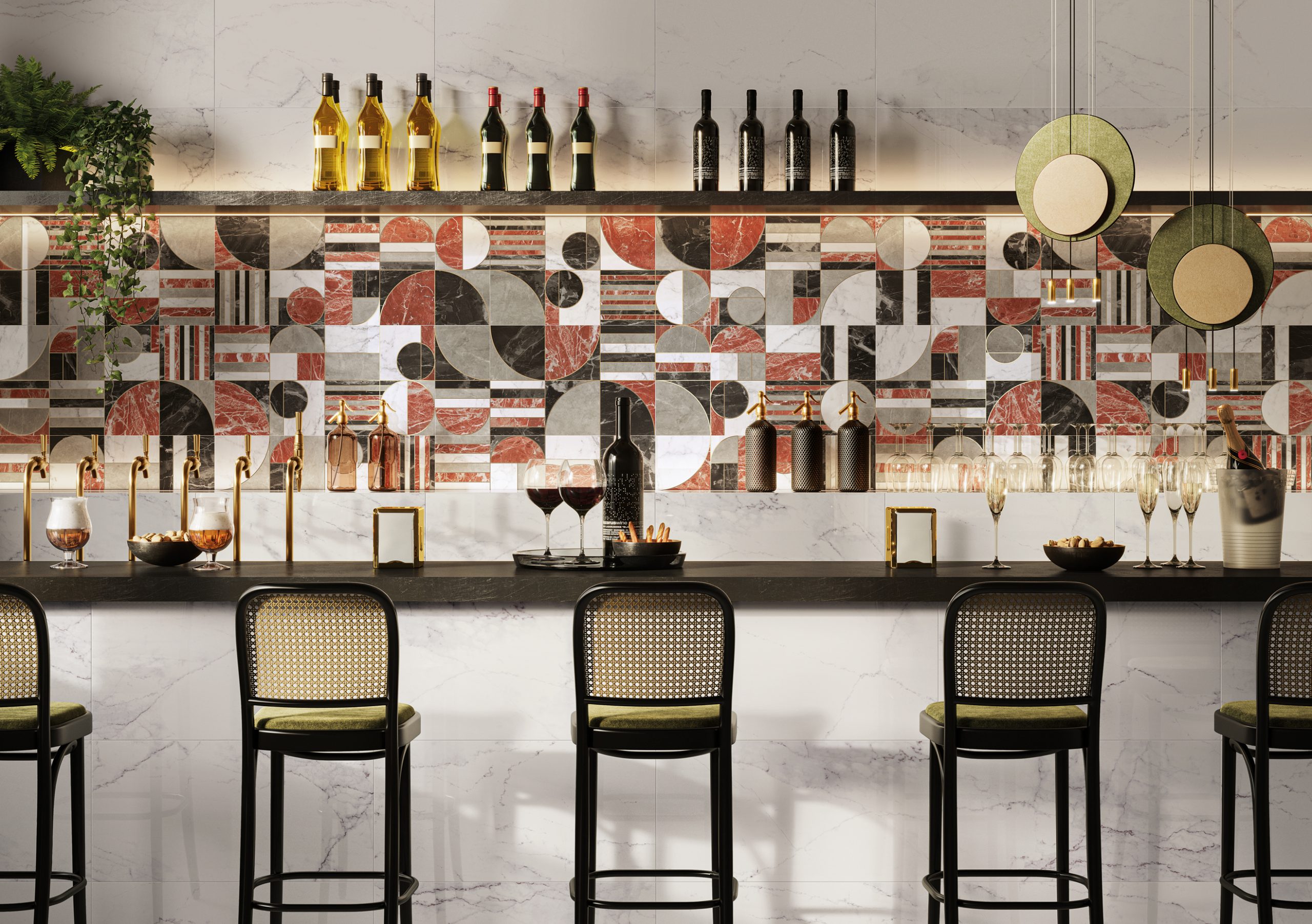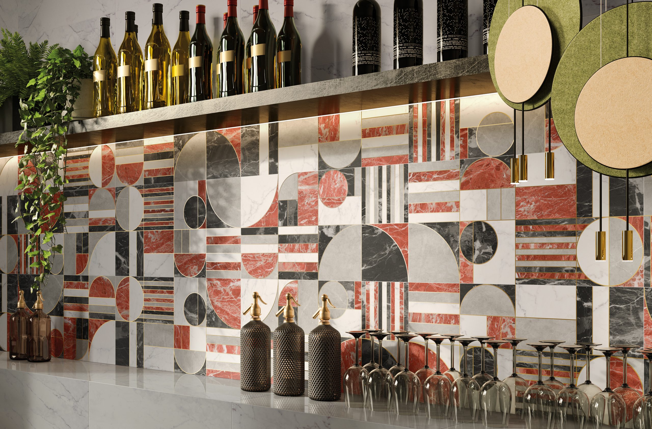 Parallaxe is offered in three versions, two with marble inlays and one with trace only. Alicante, which takes its name from the variety of red marble it is inlaid with, has an eccentric and disruptive character that immediately draws the observer’s attention to itself. Emperador, also a type of marble, on the other hand, is elegant and luxurious, with its beige colour matching perfectly with the black and white marble inlays. Finally, Real sheds its dress of inlays, giving complete space to the refined beauty of the golden trace. Applied on a glossy background, it seems to shine with its own light, decorating the wall in a precious yet discreet way.