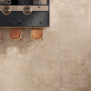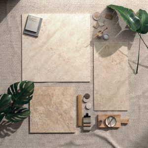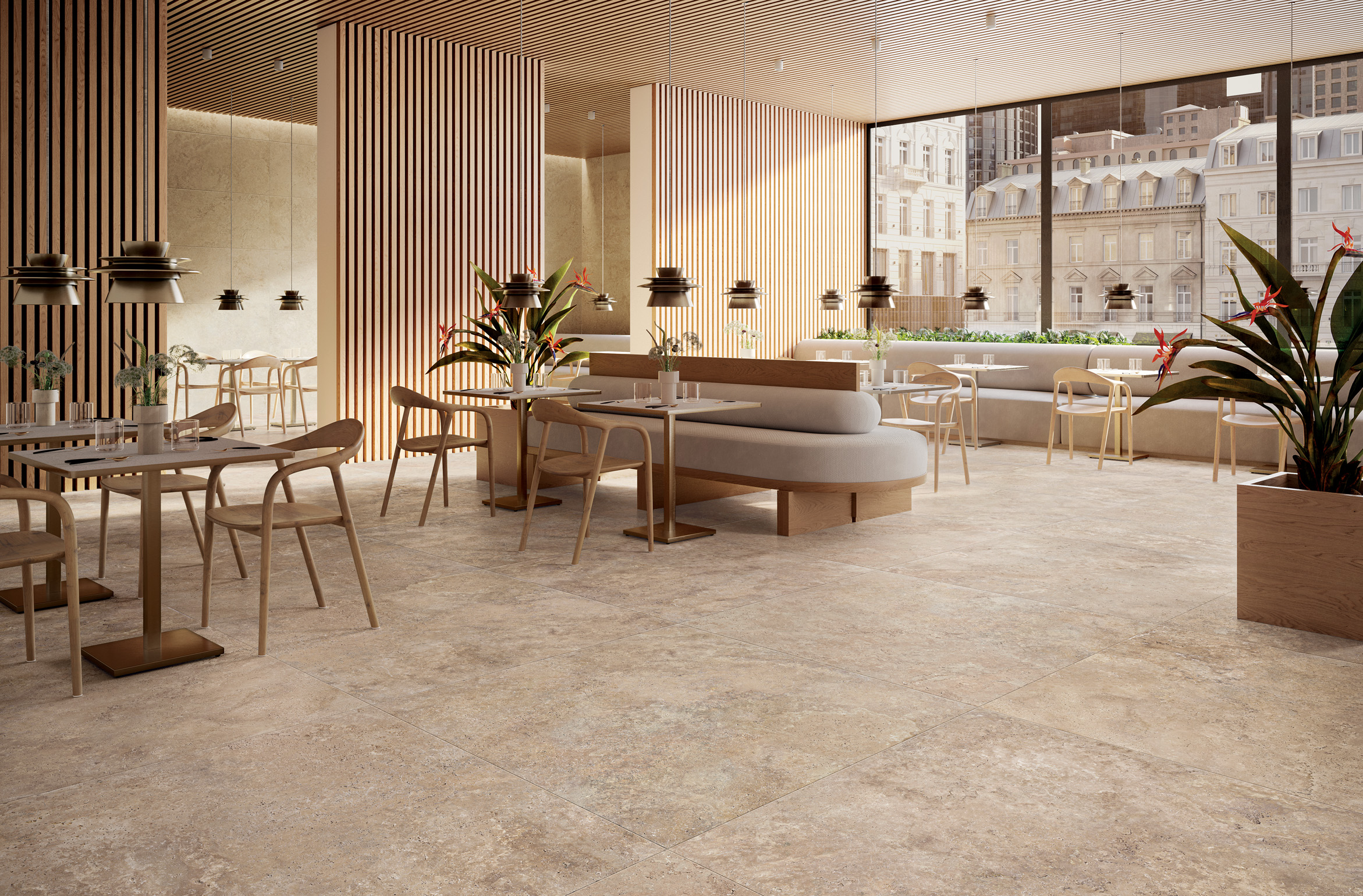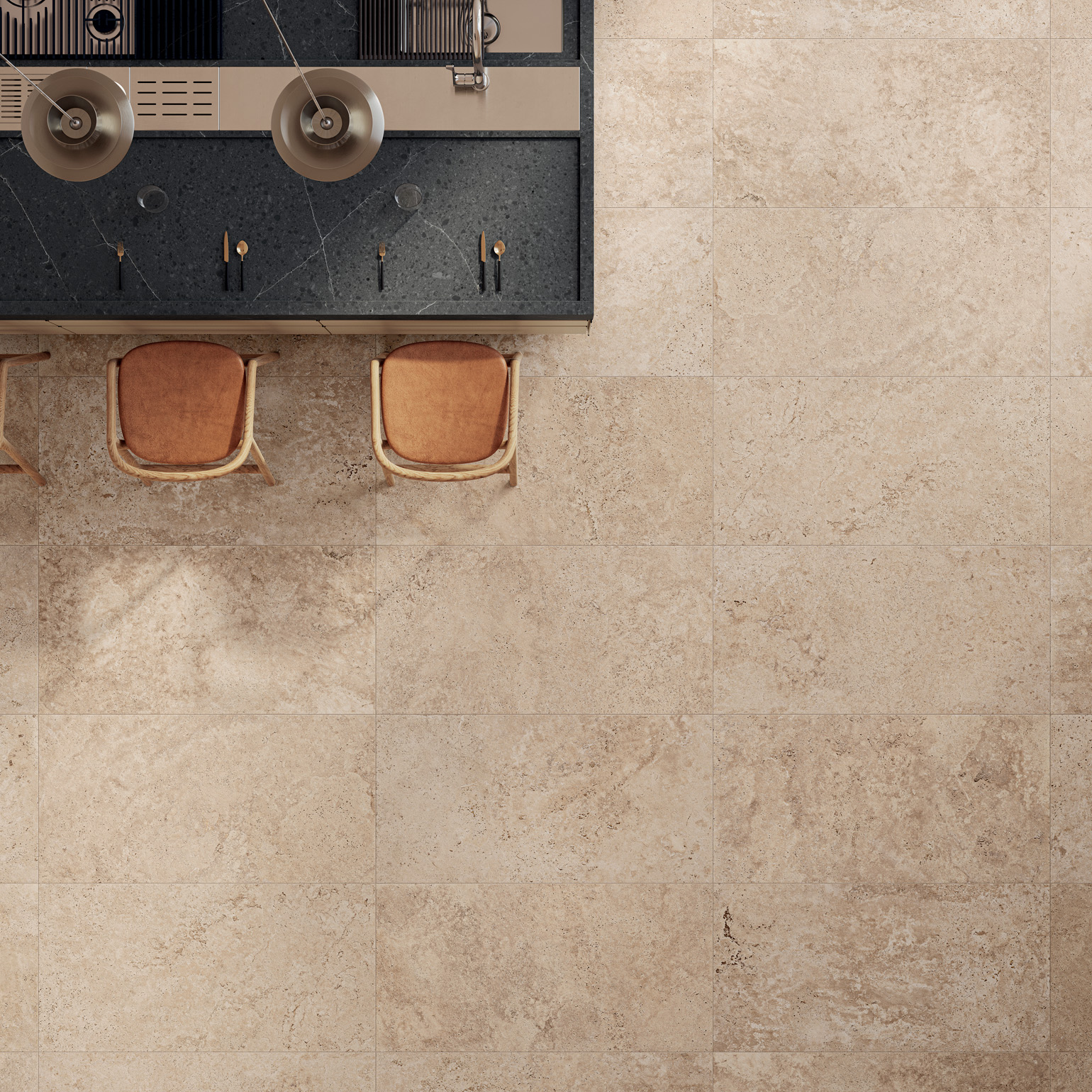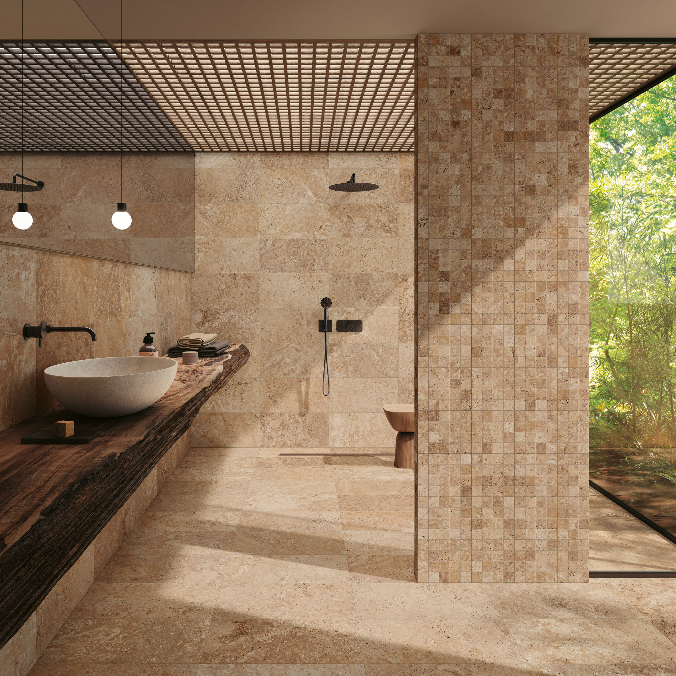 Inspired by travertine, one of the most used stones by the Romans, Tiber faithfully reproduces the shades of beige and the small irregularities of this rustic and elegant material that integrates perfectly into any type of environment.