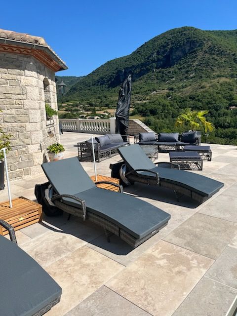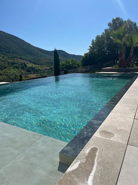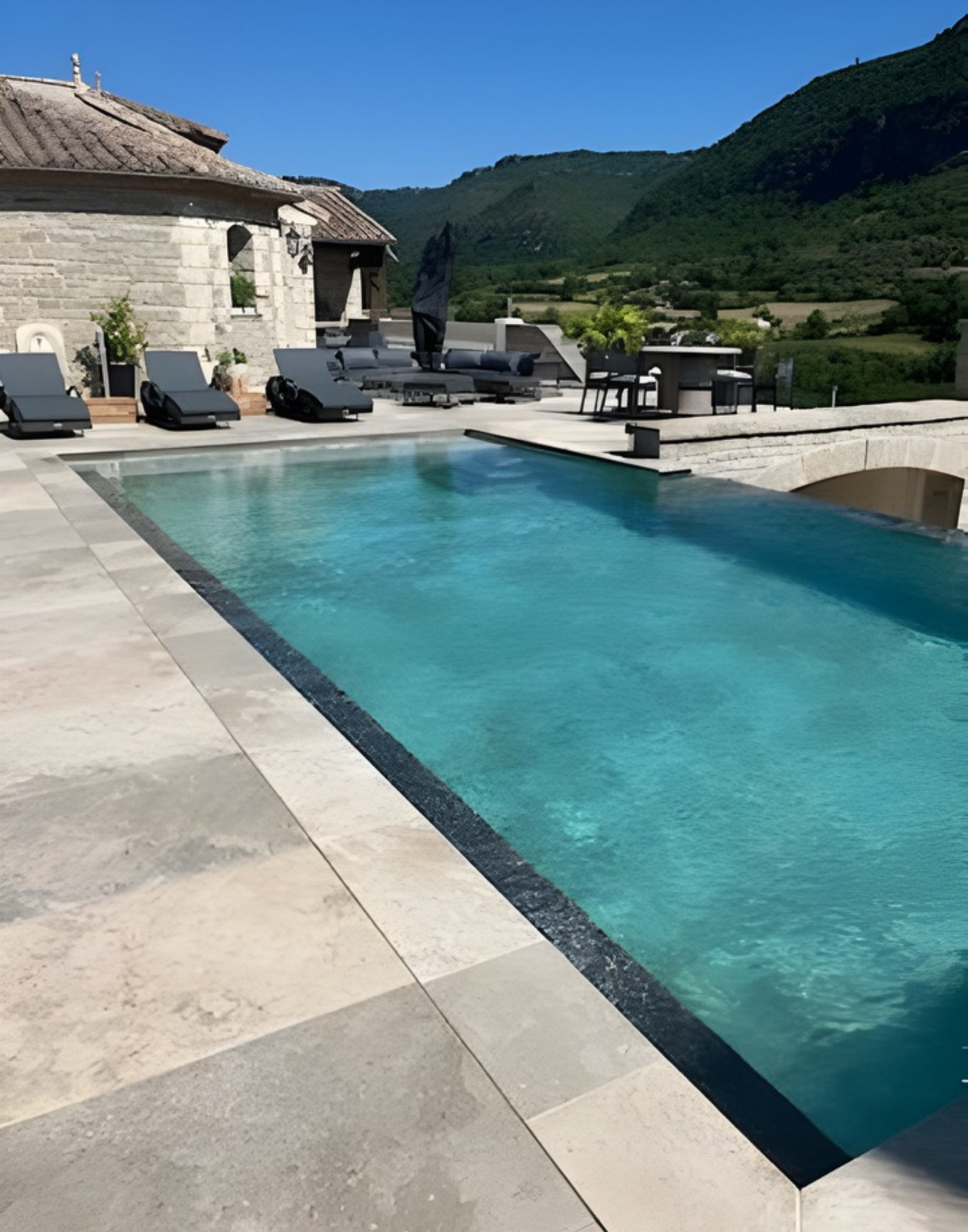 With its breathtaking view of the hills, the infinity pool blends perfectly into an exceptional setting at the foot of a stone house with timeless charm.