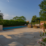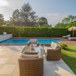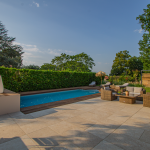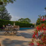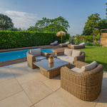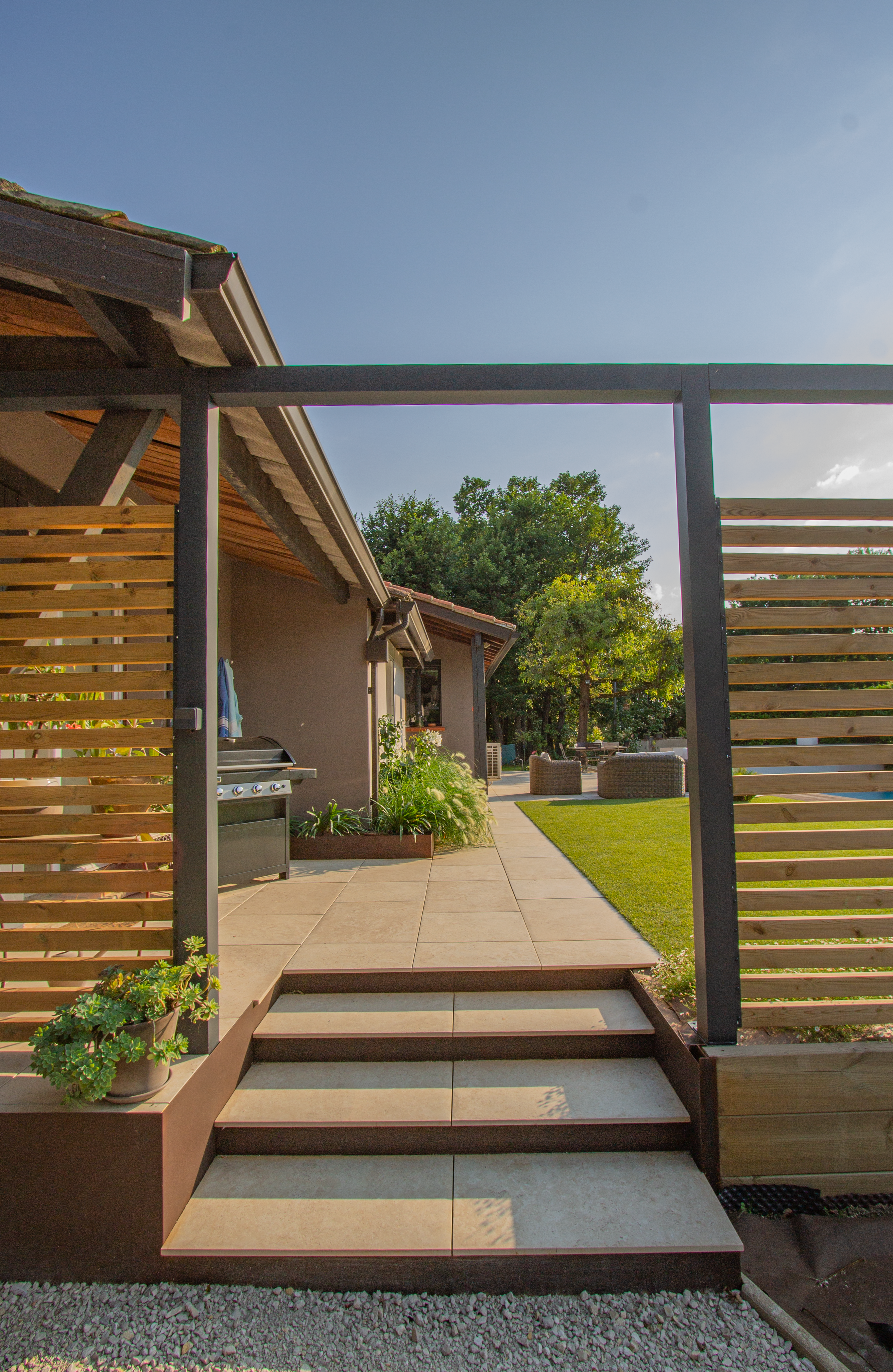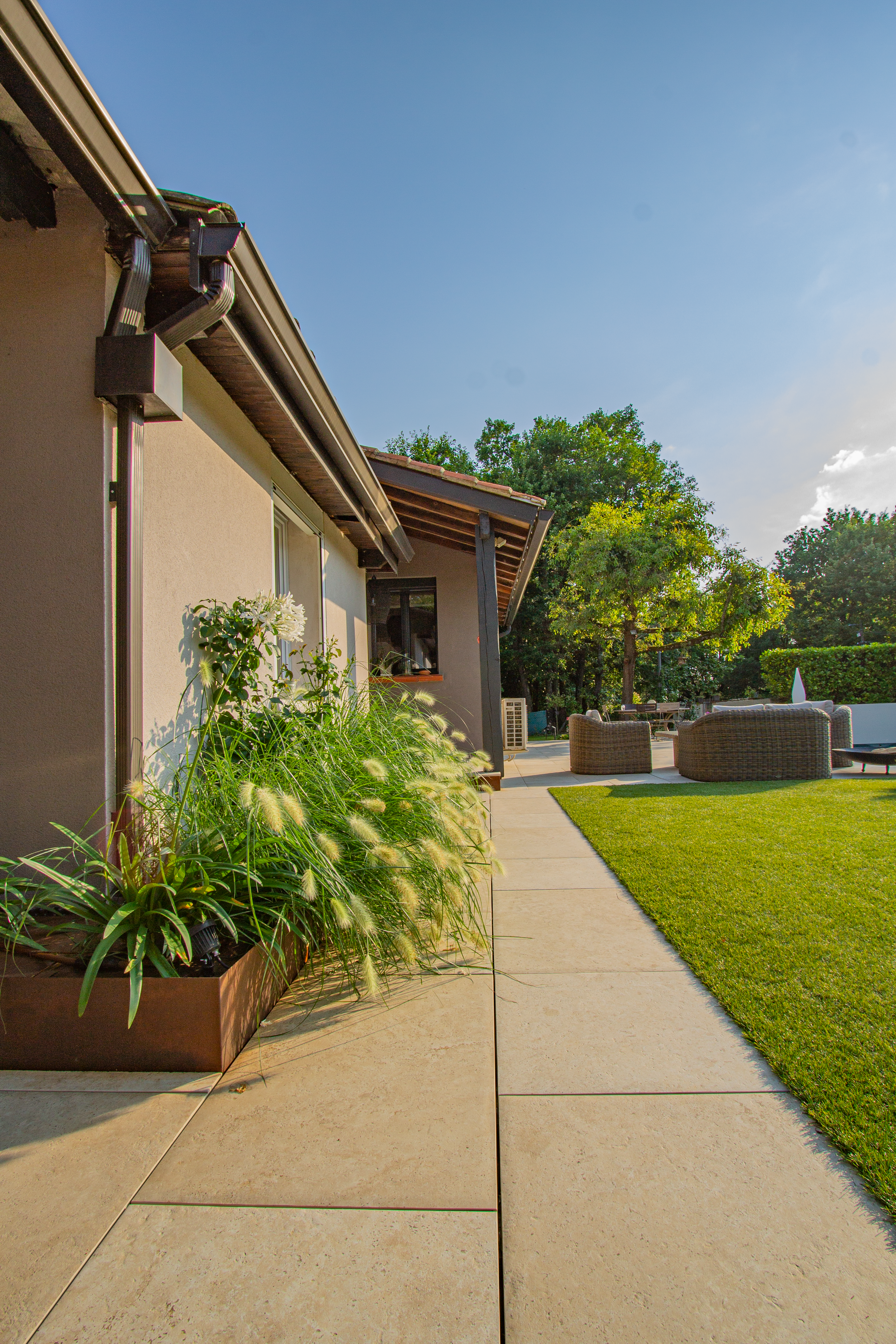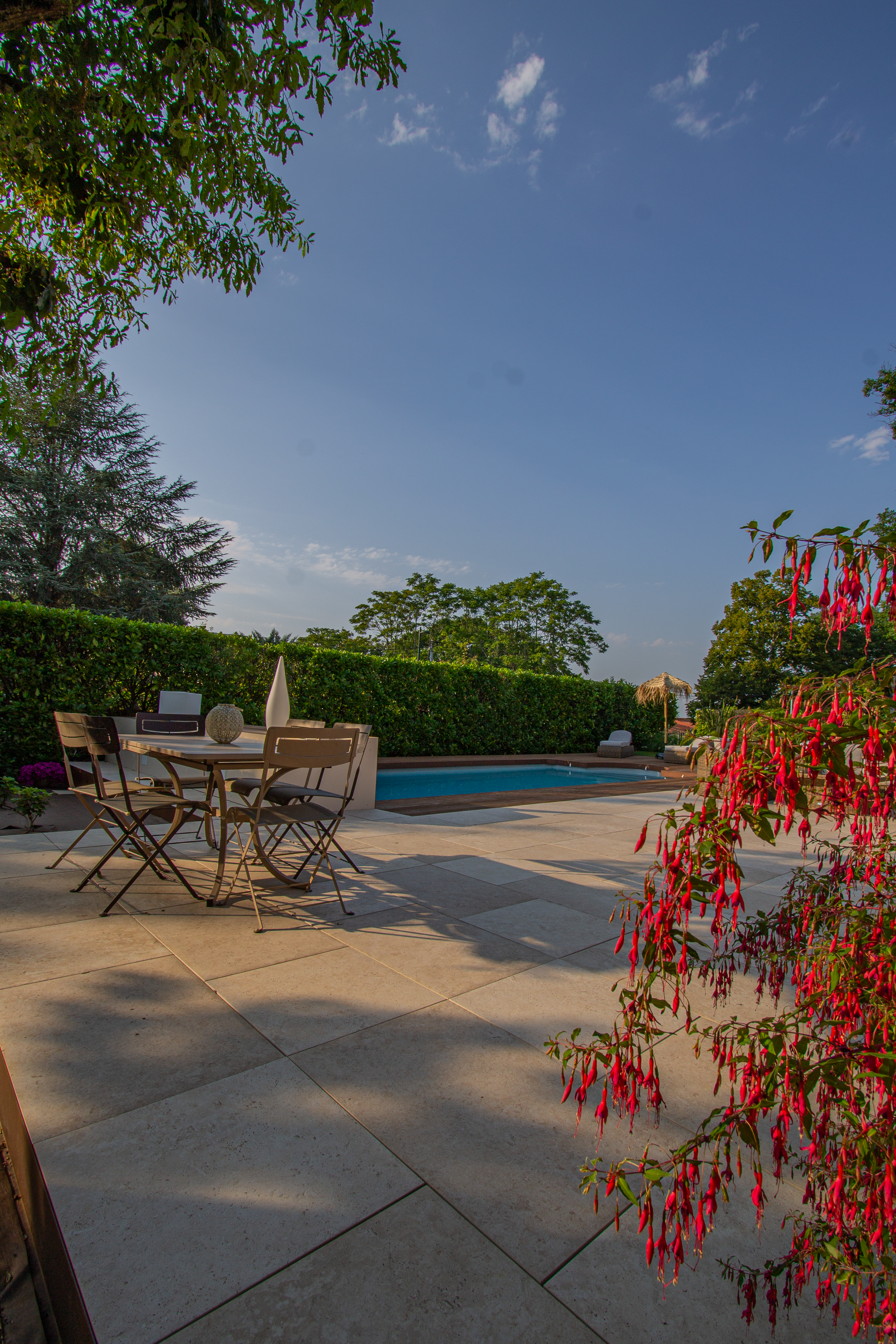 In the green setting designed by Kael CRÉATEUR DE JARDIN, tiles from the Tiber collection lay the foundations for a convivial space. The characteristic shades of travertine enhance the pool and outdoor furniture, creating a rest area that’s as beautiful as it is functional.