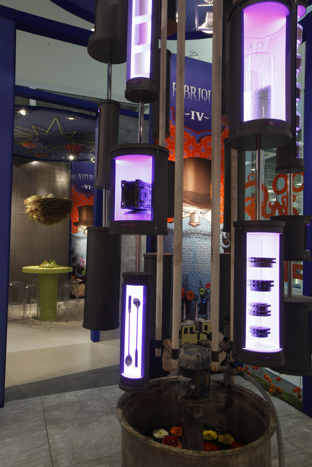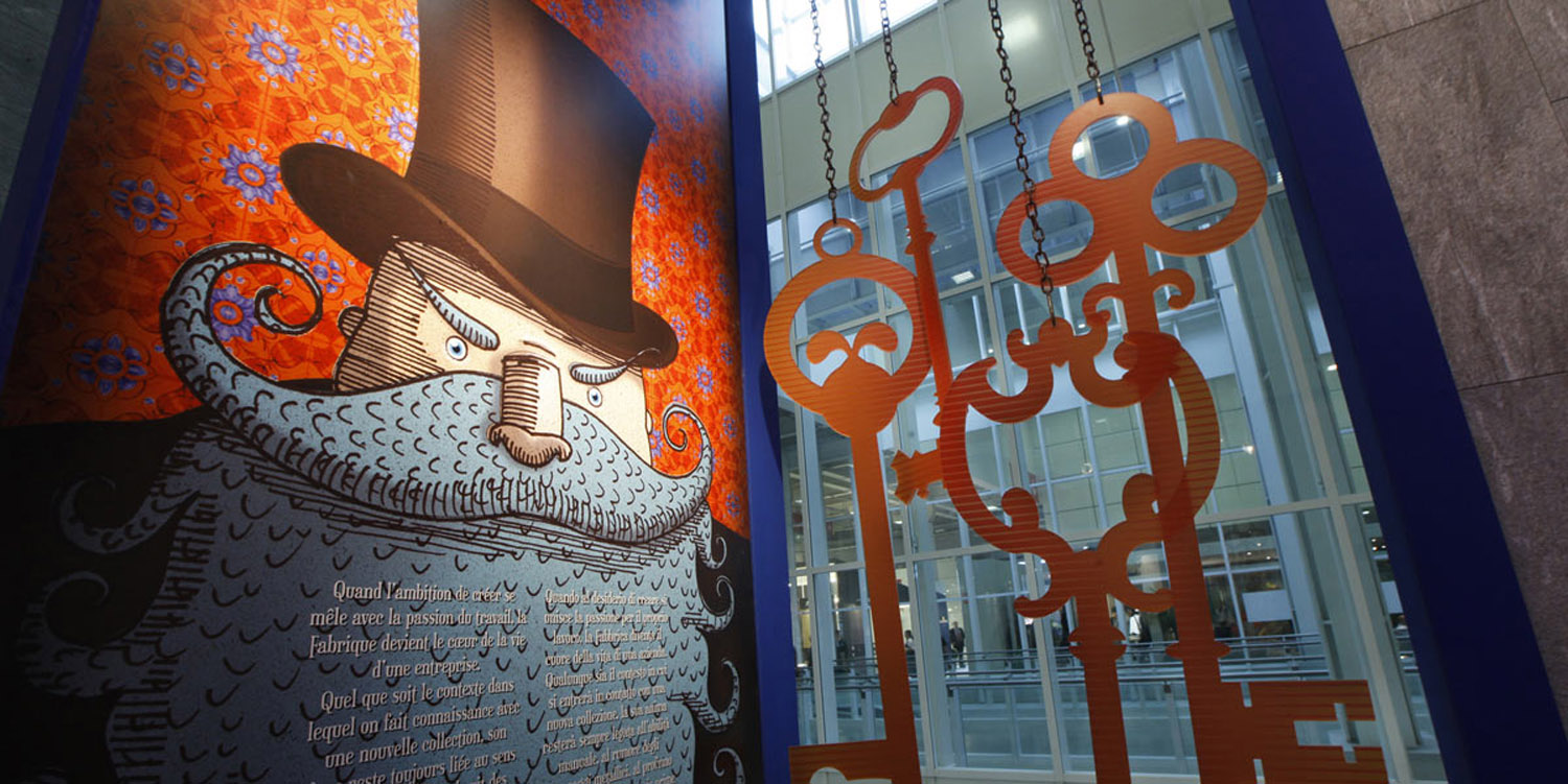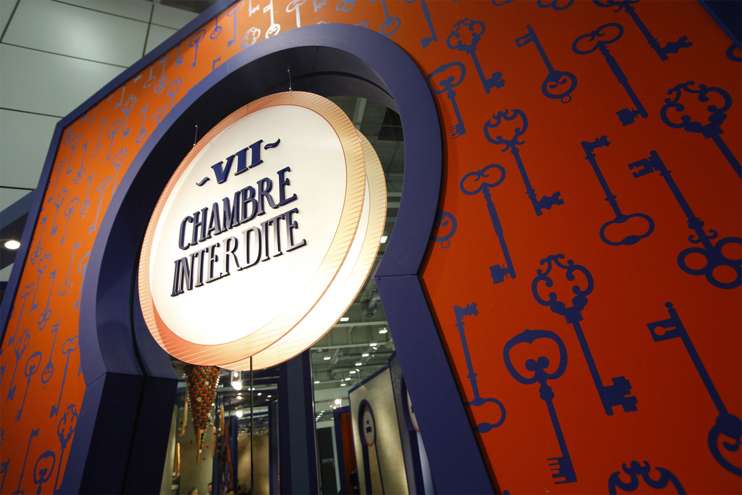 Upon entering the booth you immediately get the impression of infinite space. The long corridor never seems to end with a game of mirrors, reflections and perspectives. The entrance of each room is in the shape of a keyhole as a metaphor exclusive access for visitors of the stand, a real privilege granted by the landlord, often gloomy mood.On the eve of its 150 years, Novoceram want to highlight the 7 core values that have shaped its history and its evolution: Inspiration, Nature, France, Factory, Charm and Relationship presented by allegorical scenes in each box of the stand. The seventh value is hidden in the forbidden room, as in the story, to excite the curiosity of visitors.To begin their journey, visitors will find a « map » of what they are about to discover in the wall visible below.