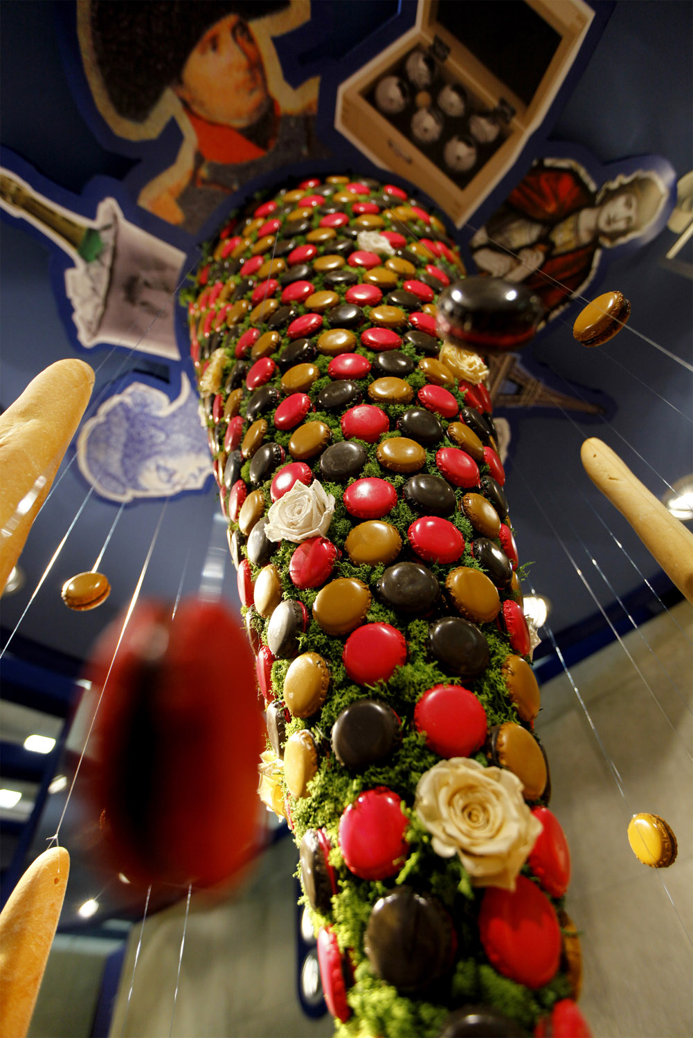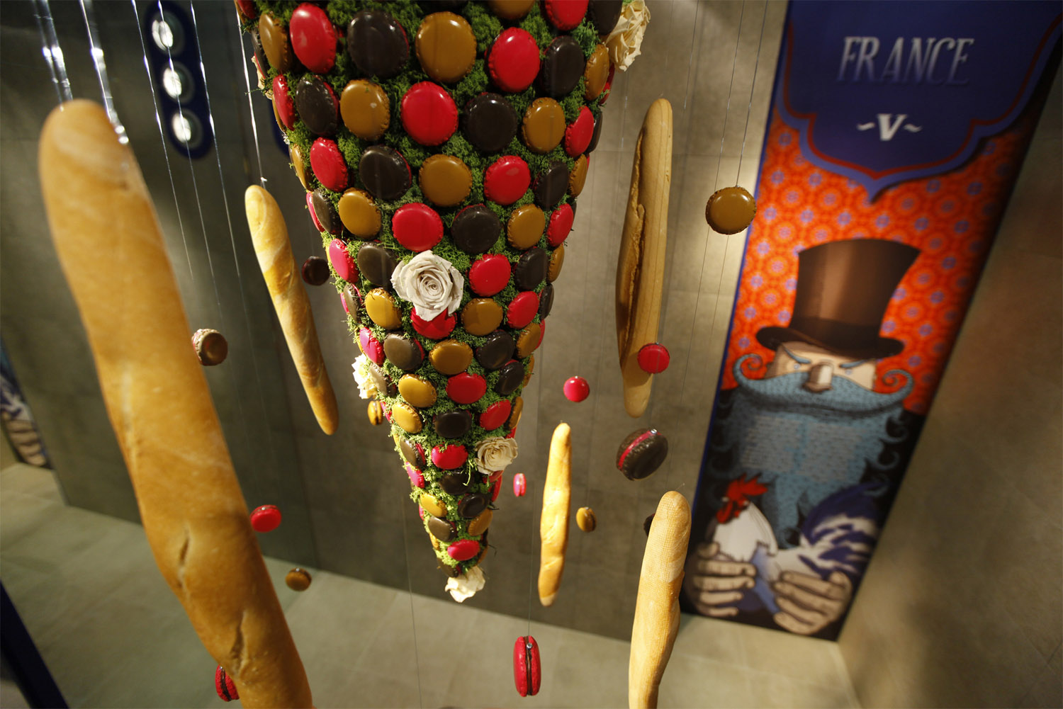 One of the core values of Novoceram is France, represented in the room n.5, covered by the collection Icône, and characterized by a huge tower of macarons, surrounded by baguettes suspended and crowned by the portraits of the most famous figures in French history.