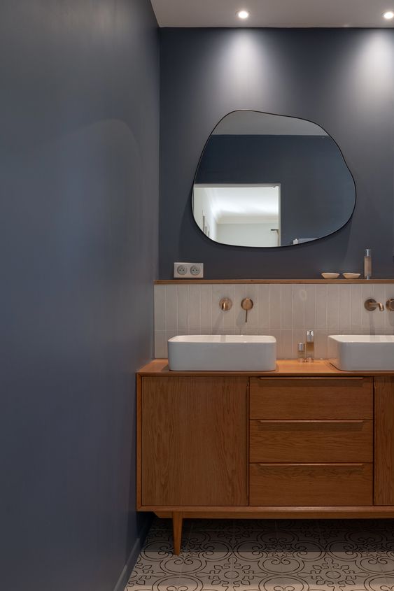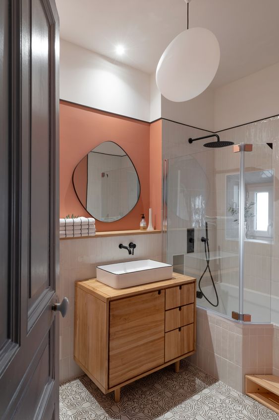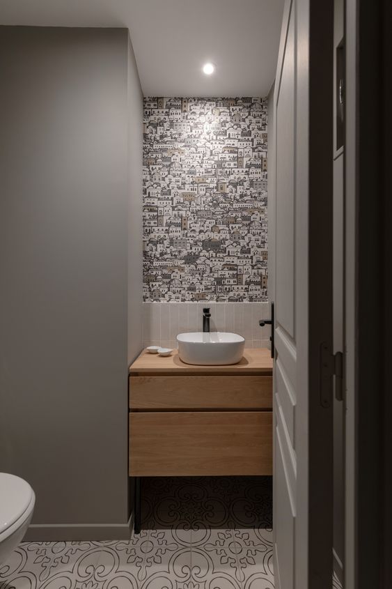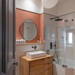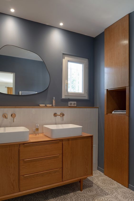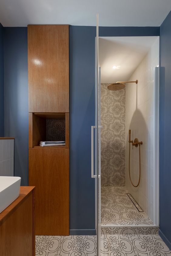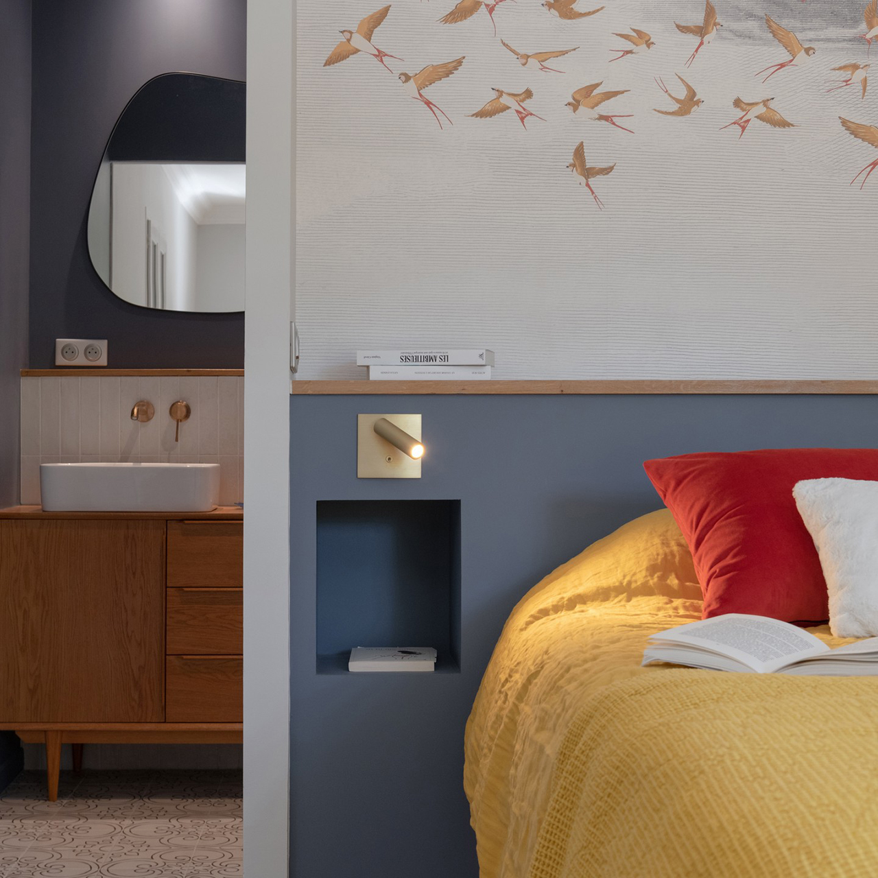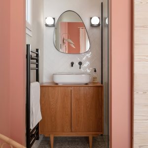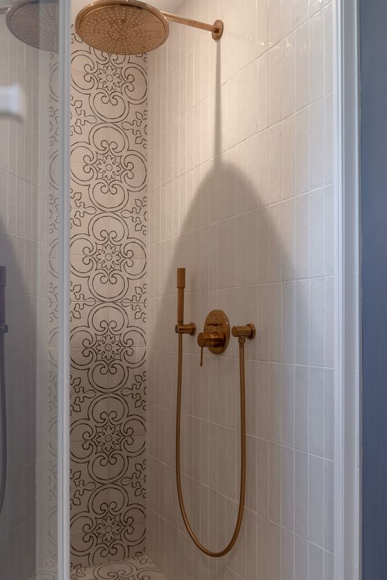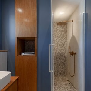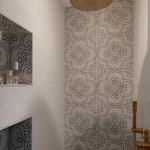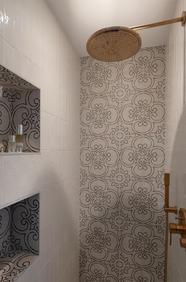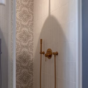 Decoration choices were guided by the presence of cement tiles, with the use of noble materials such as linen, velvet, wicker and wood to create soft, welcoming spaces. The Bohème collection has found its place in the two upstairs bathrooms, one in the master suite with the Lace motif and the other in the children’s bathroom with the Twirl motif. In this way, Bohème creates continuity between these two spaces, each with its own identity. The colour palette chosen reflects a soothing softness.