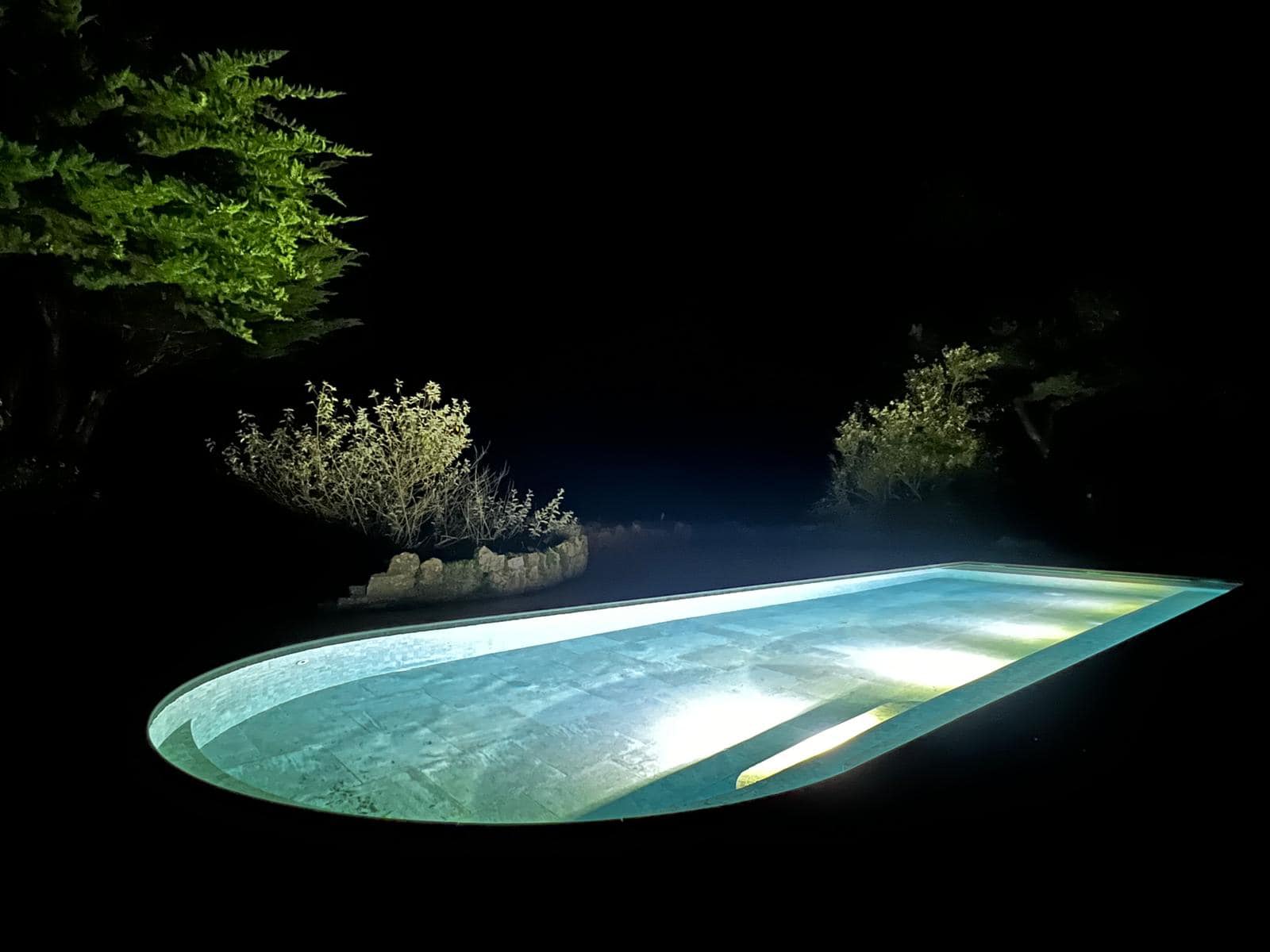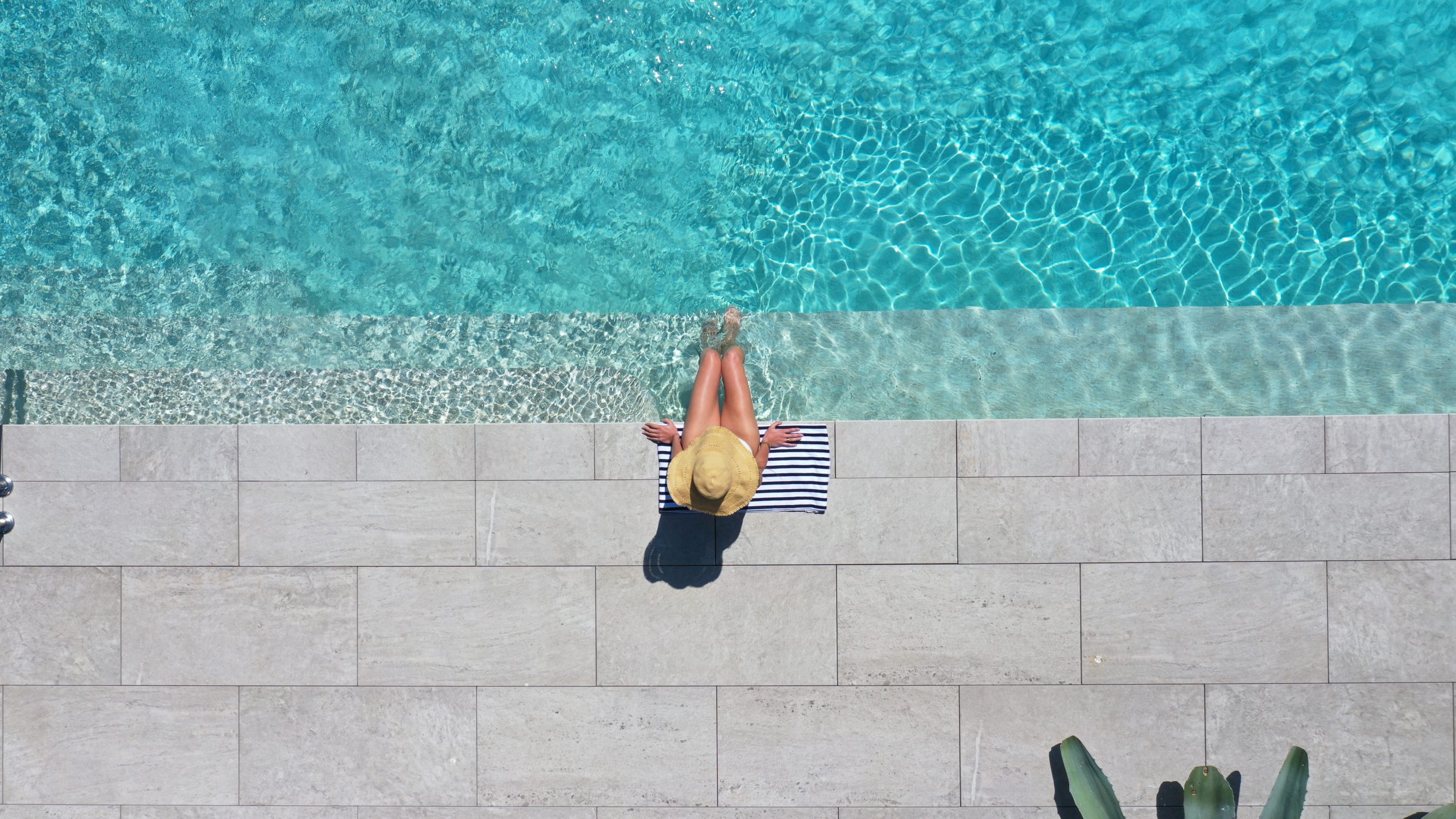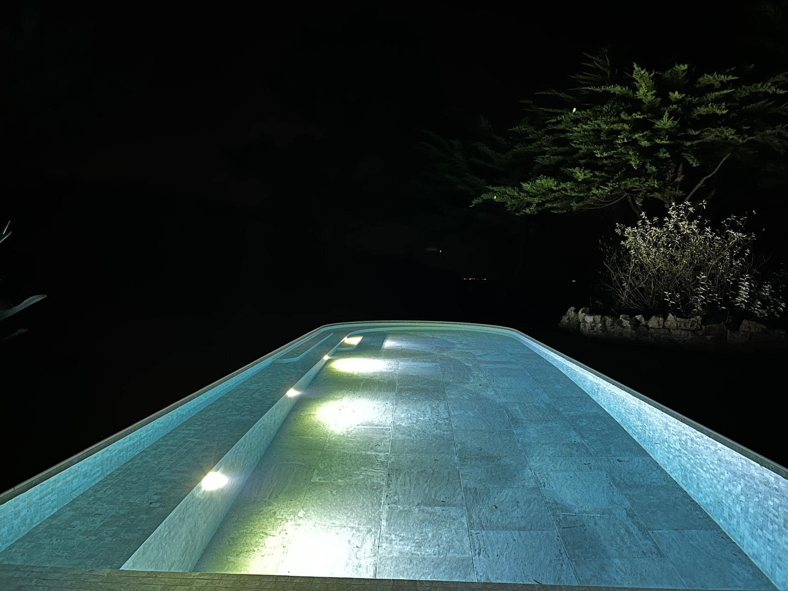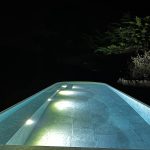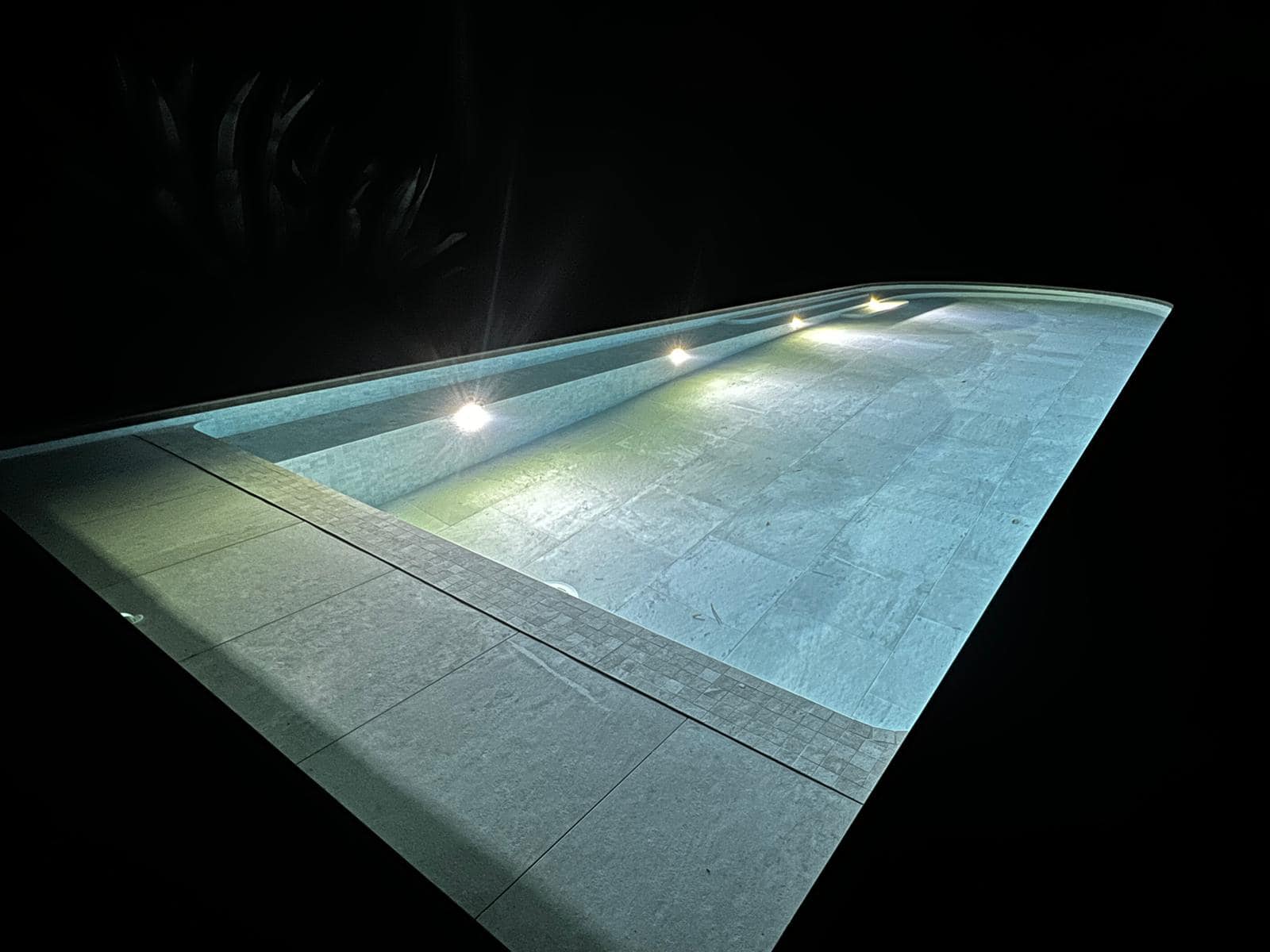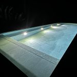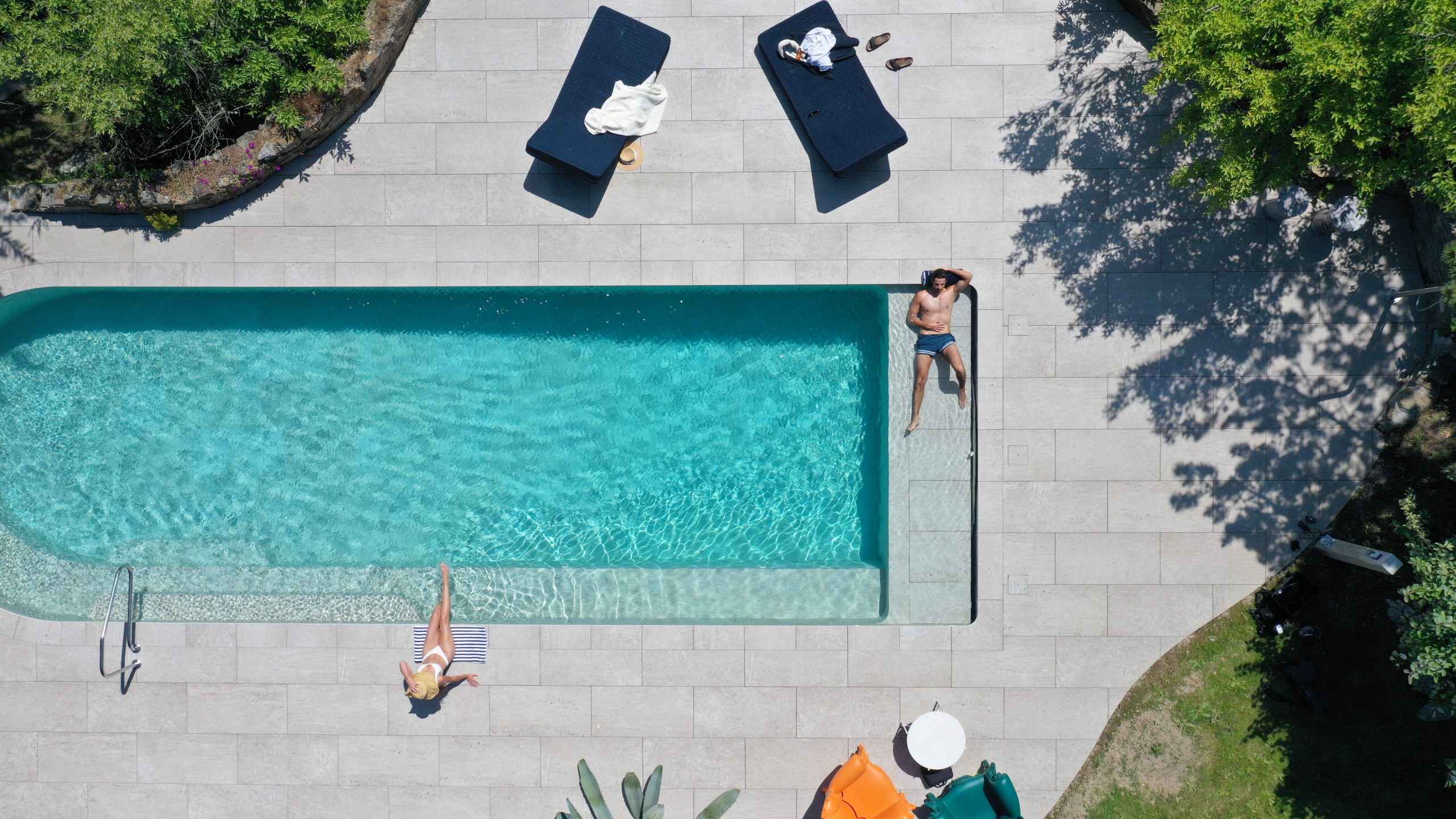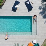 The Losa collection in porcelain stoneware, chosen for its elegance and durability, lines the entire pool. Its grey and sand tones give the water shifting reflections depending on the daylight. The mix of formats, combining slabs and mosaic tiles, subtly enhances the pool’s interior volumes. Rounded coping, tiled mirror skimmers, and discreet LED lighting complete the pool’s refined aesthetic.