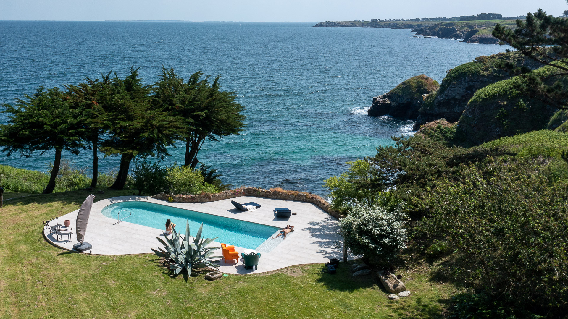 Overlooking the wild landscapes of Belle-Île-en-Mer, in the heart of the Ponant Islands, this renovation by Les Piscines de Jade transforms an abandoned 1930s pool into an exceptional 13x4m lap pool, seamlessly integrated into its natural surroundings.