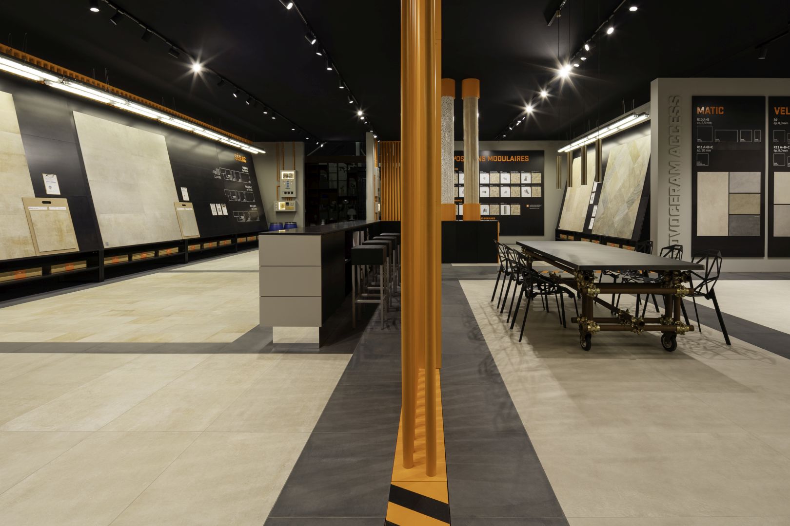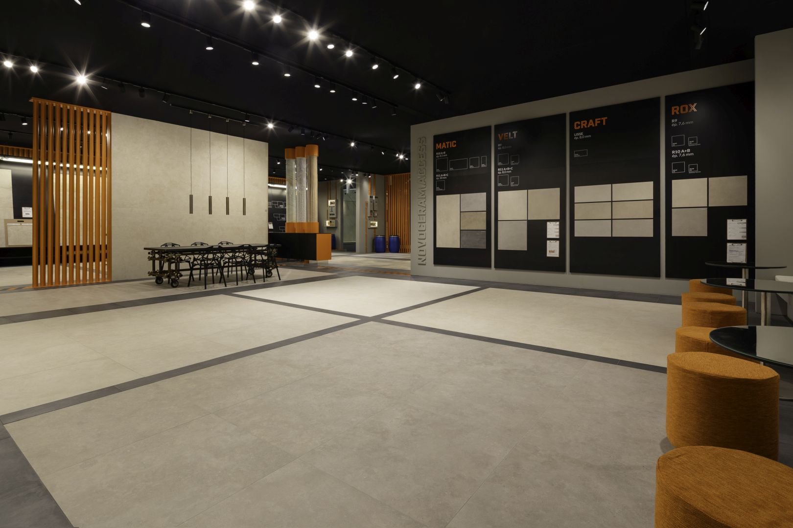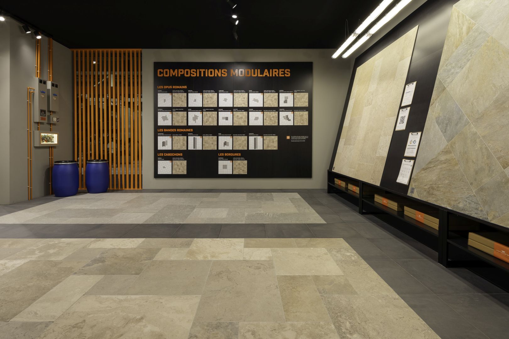 Between industrial lines, workshop elements and nods to ceramic expertise, the space presents itself as a reinvented factory. Here, each tile on display is not only a finished product, but a witness to a process: that of a patient, precise and passionate transformation.