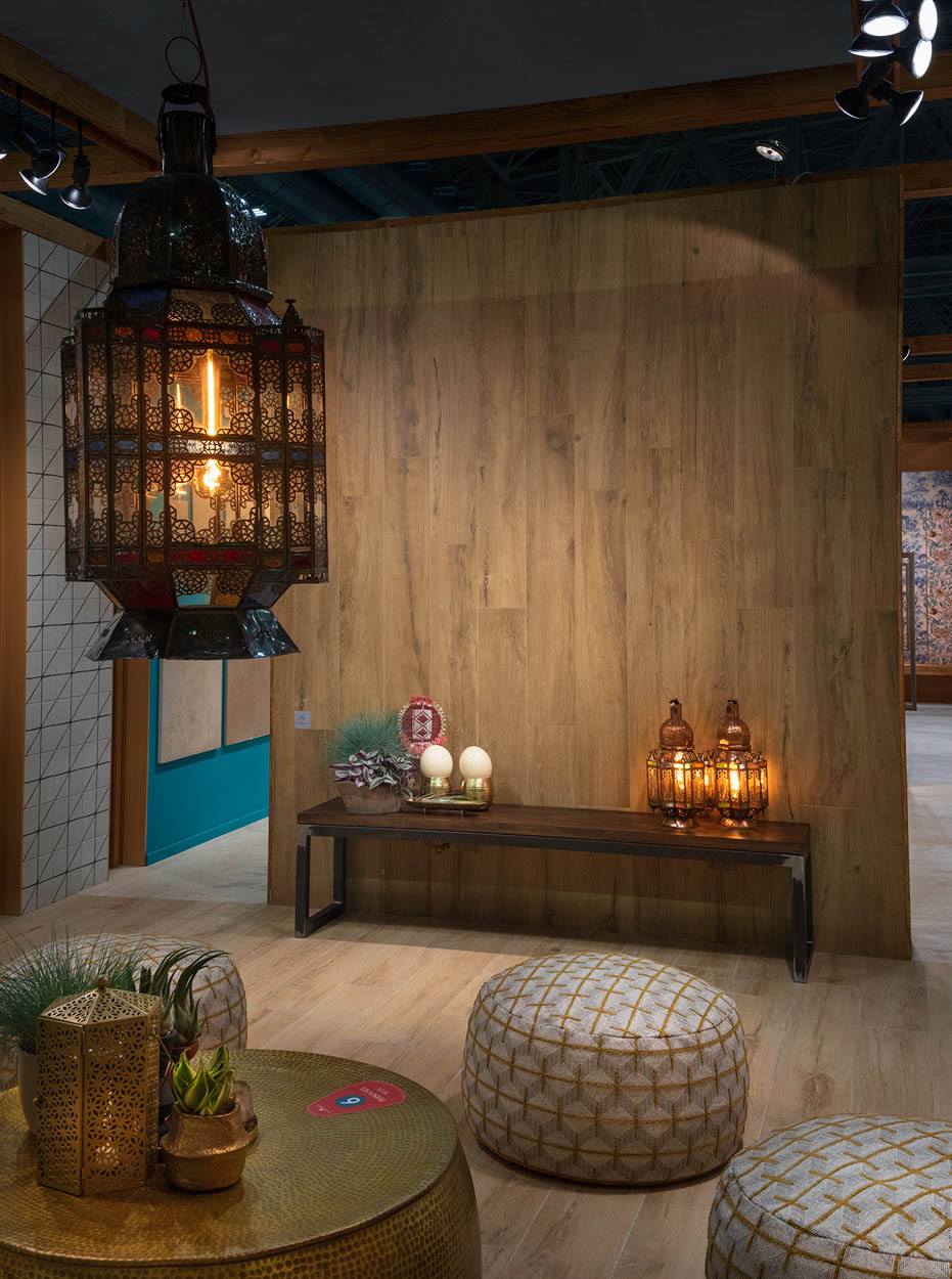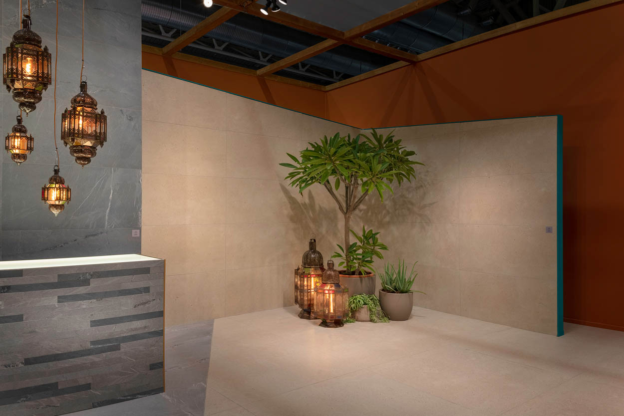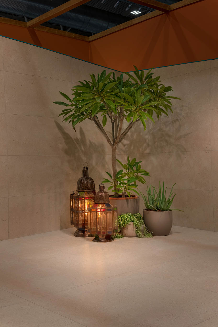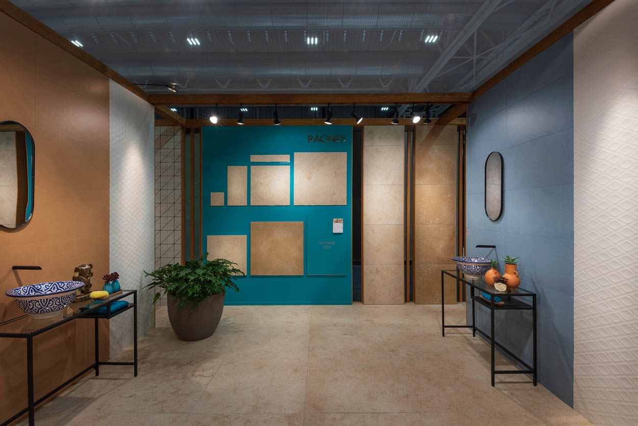 The “Oasis” scenography, designed by Francesco Catalano, reinterprets all the warm colours and rich materials of North Africa in a contemporary way and offers a pleasant imaginary journey among our ten novelties for 2022.