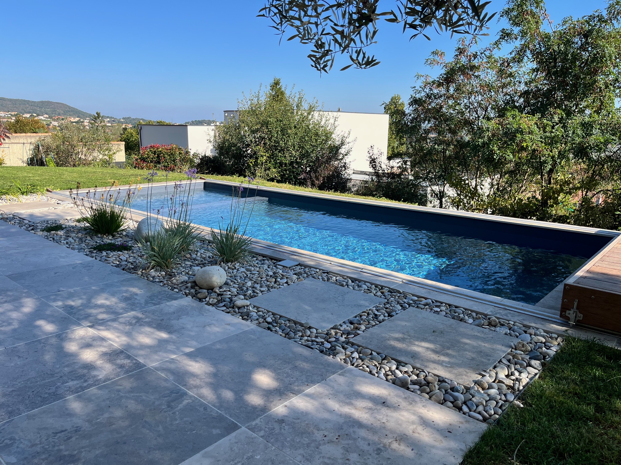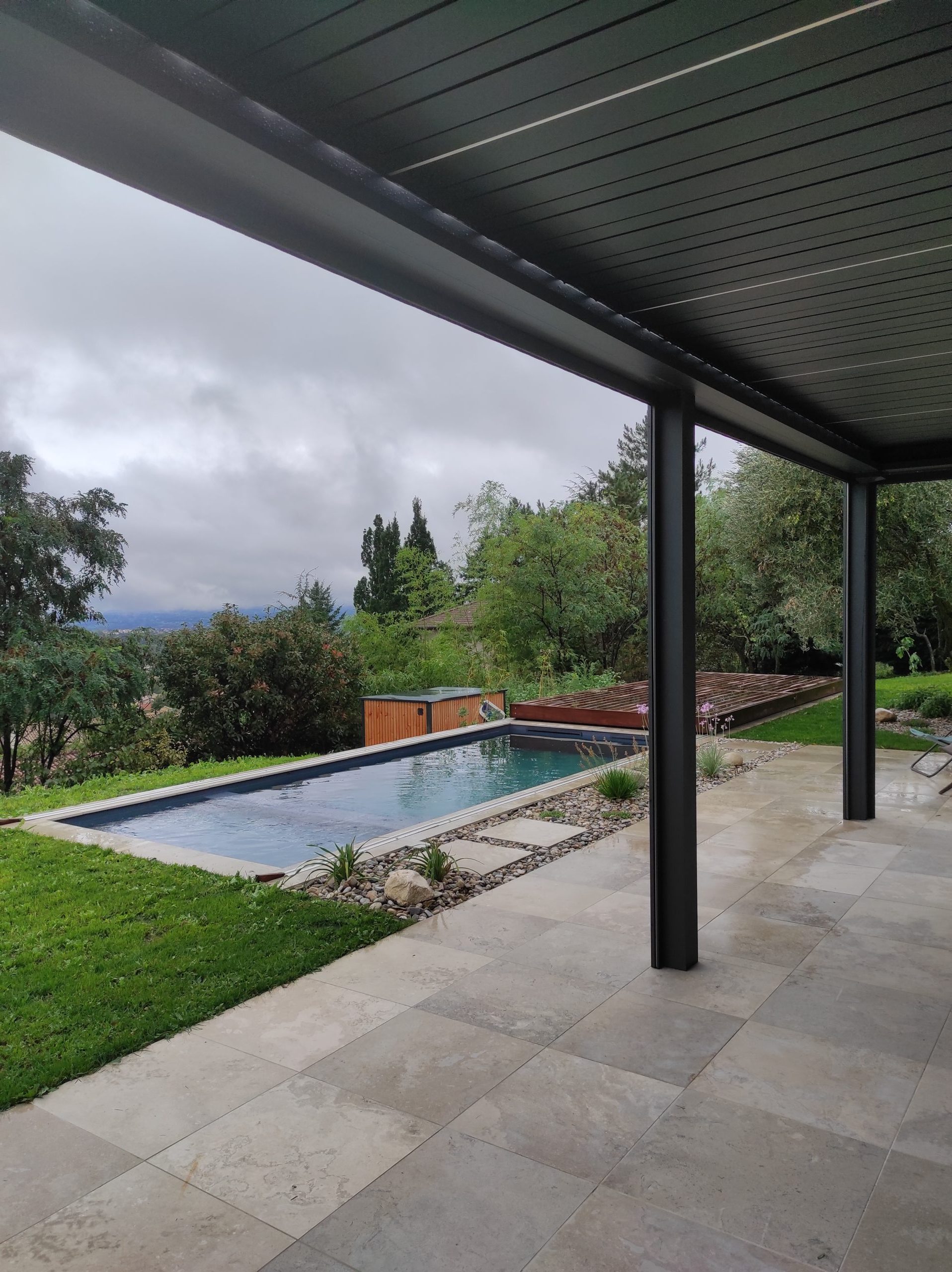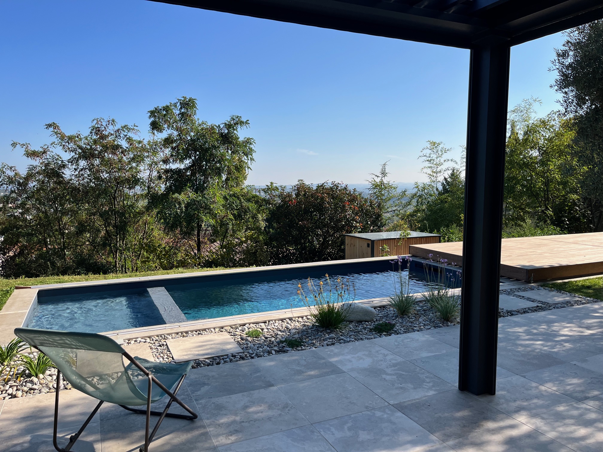 The terrace, shaded by a bioclimatic pergola, opens onto a swimming pool perfectly suited to family life and the landscaped environment.