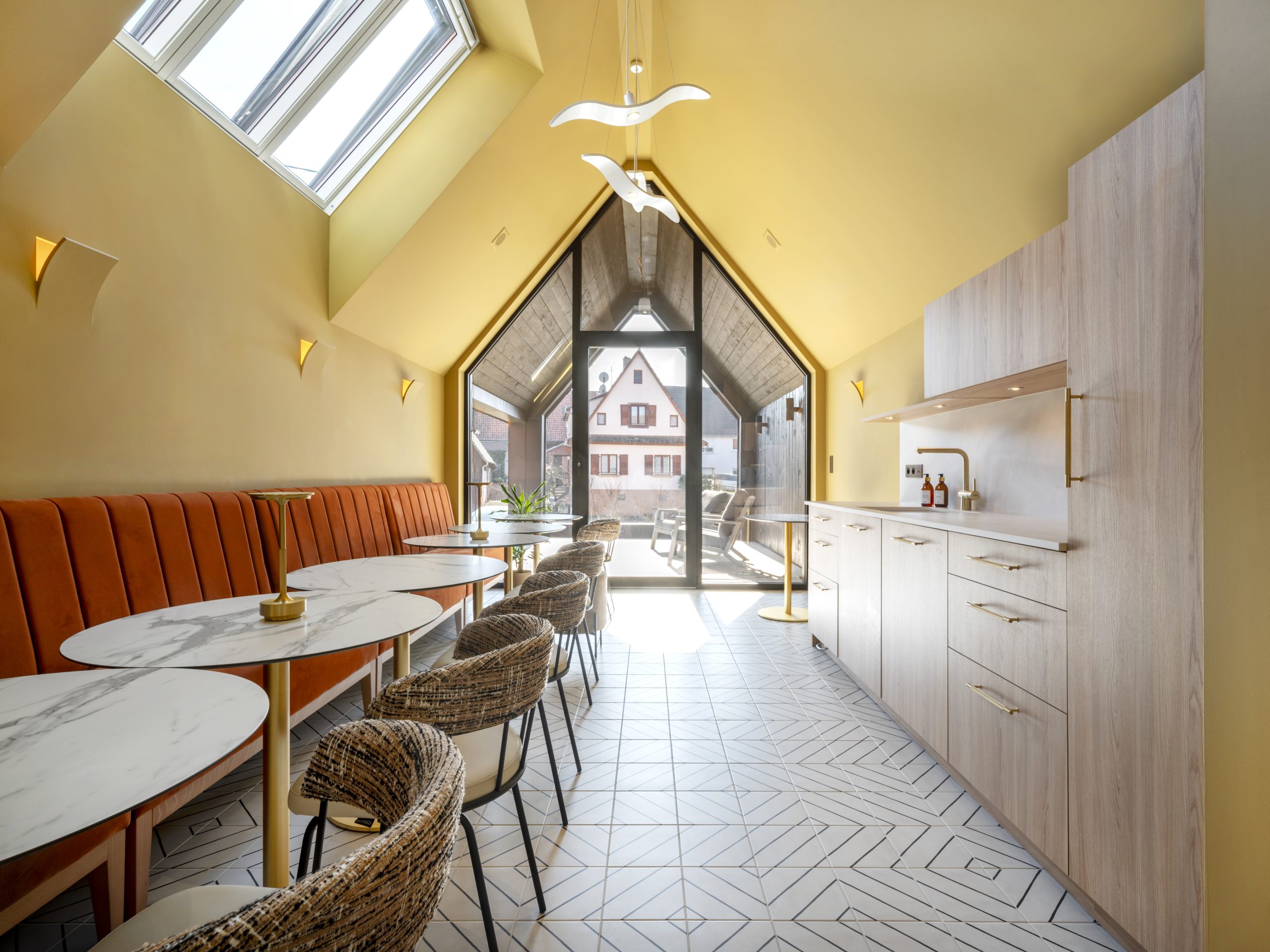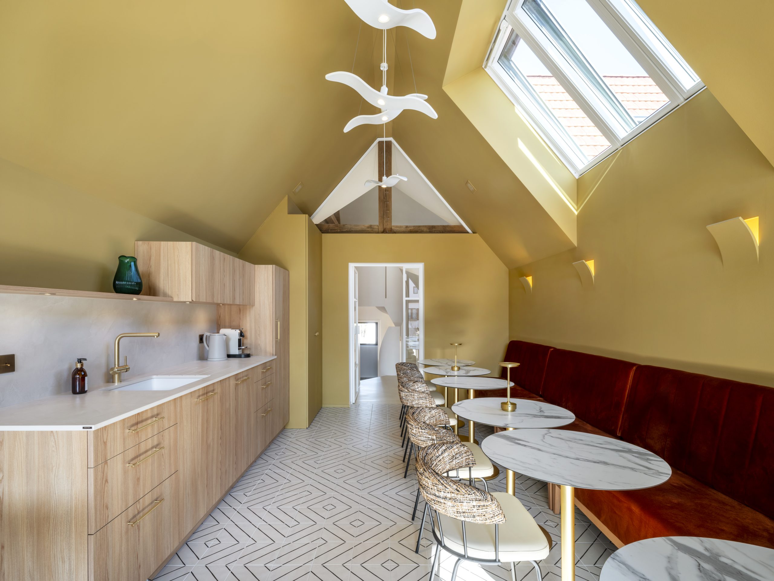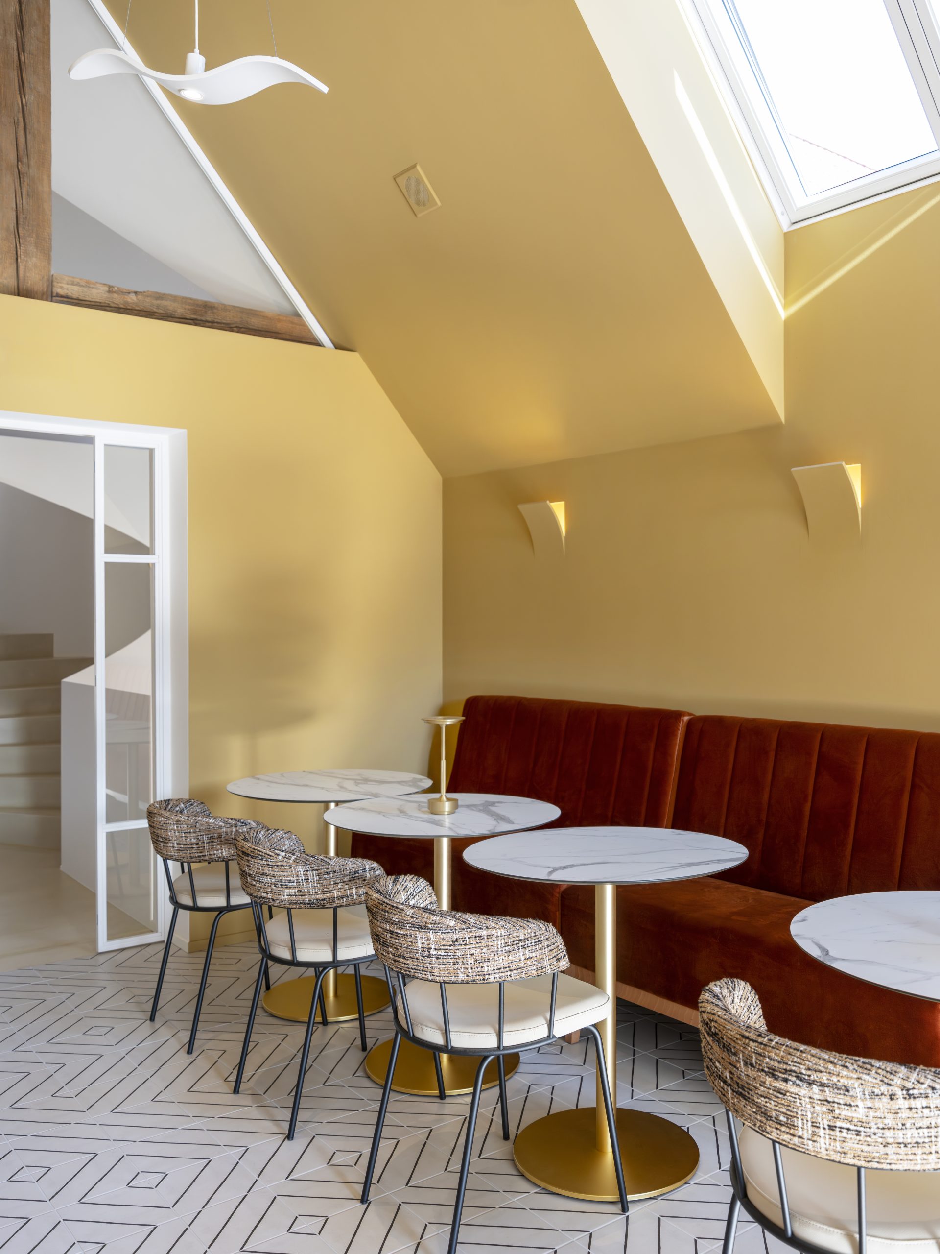 Discover the ‘La Grange’ renovation project by the Maison l’Agate architectural practice with our Bohème collection. Located in Stundwiller, in the heart of Northern Alsace, this innovative project transforms a traditional space into modern offices and a coworking space. The renovation stands out for its bold aesthetic choices, notably the walls painted in a warm golden ochre hue that bathes the space in light, complemented by the use of Novoceram’s Bohème collection for the floor coverings in a geometric pattern. The contrast between the terracotta bench, the white marble tables and the gold details adds elegance and character to the whole, creating a working environment that is as aesthetic as it is functional.