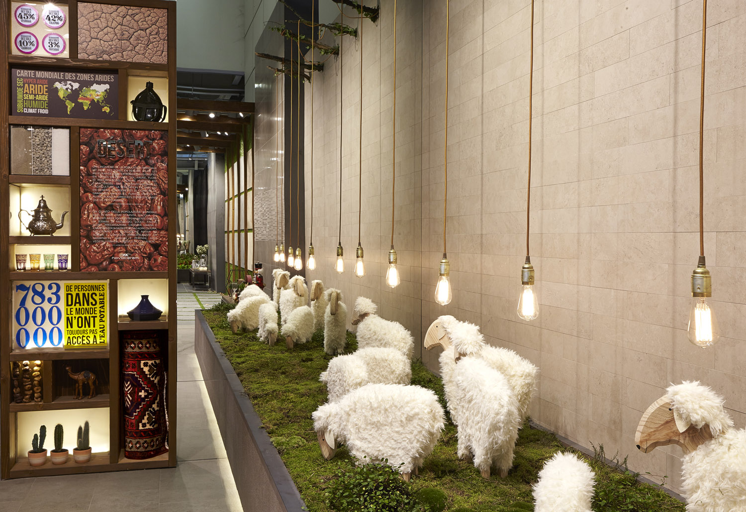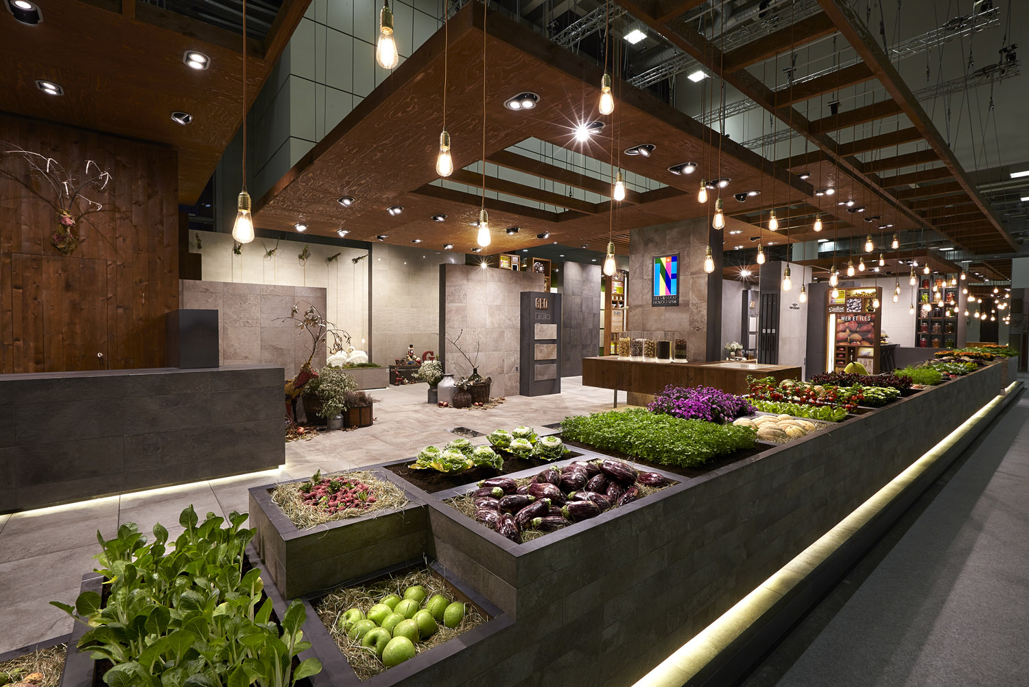 In each one of the nine spaces, Novoceram tell the secrets of the primary food products, inspired by the clusters of Expo 2015: a small tribute from Novoceram to the greatest show dedicated to food in the world which will be held in Milan in few months.Among the surprises of the project, visitors can admire the works of art in « ecotaxidermy » of the artist Antonio Massarutto who created a surreal fauna composed of deer and wild boar that overlook the rooms of the booth.