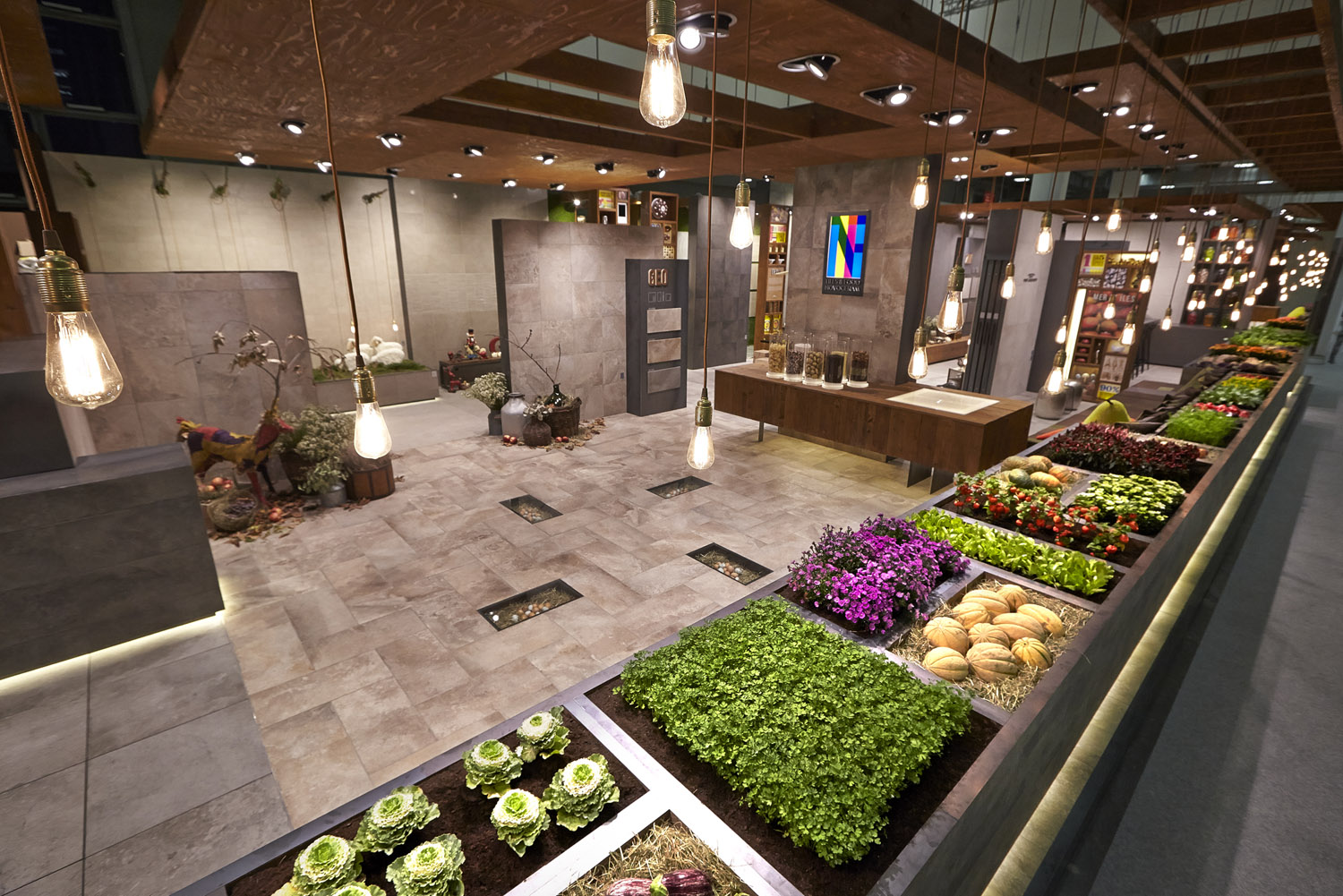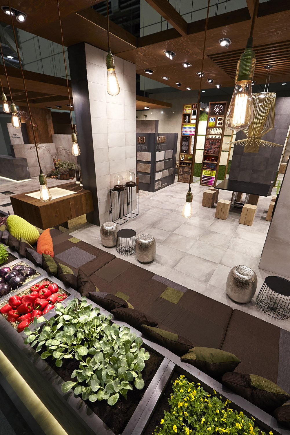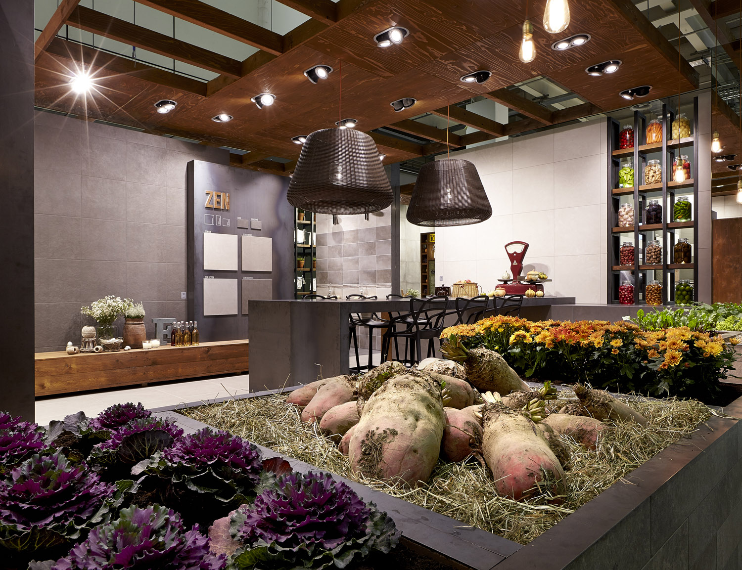 In the corridors of the exhibition he has recreated the atmosphere of a contemporary farm surrounded by the new ceramic collections of Novoceram, Geo, Azimut and Zen.