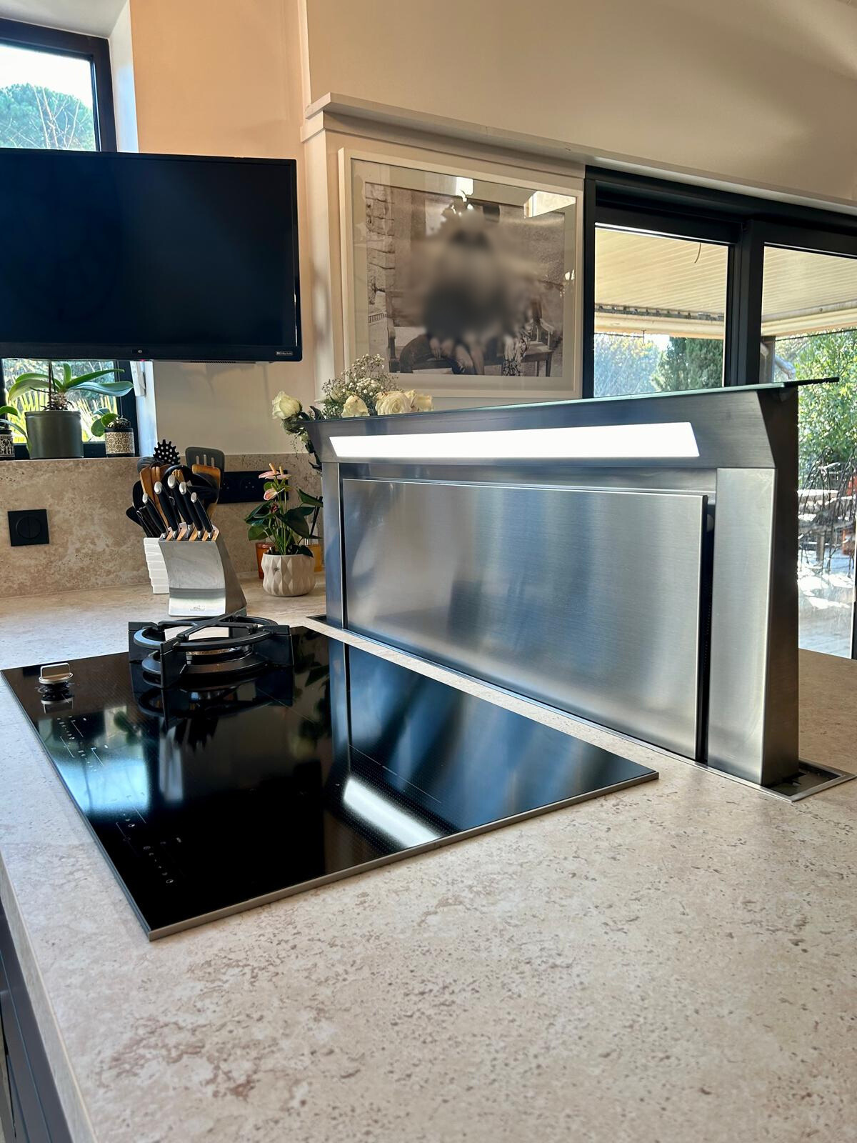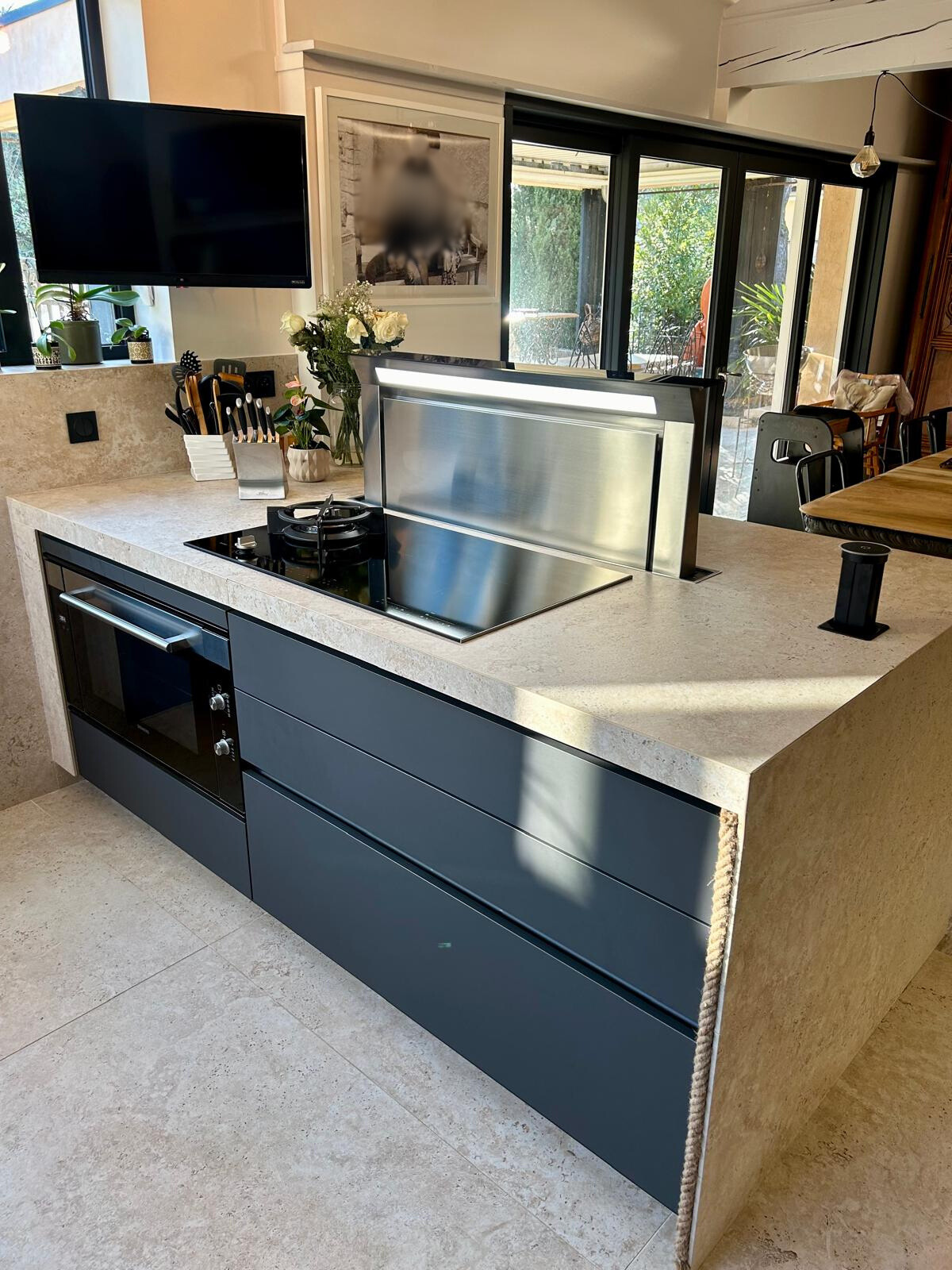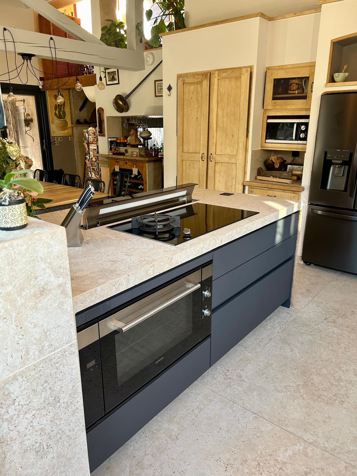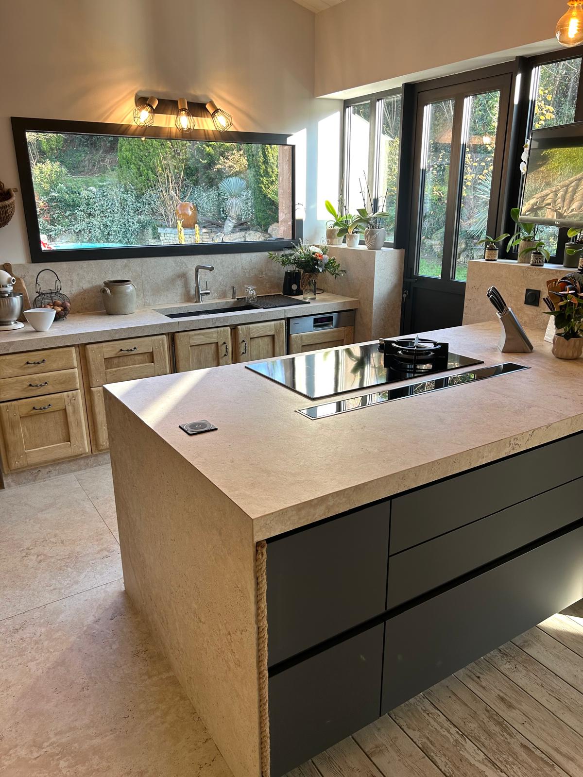 For this project, Patrick Piguet and Cuisines de Marine skilfully orchestrated a harmonious blend of tradition and modernity. Novoceram’s Tiber tiles, inspired by travertine, subtly cover the floor and worktop in 120x120cm format, adding a warm, authentic touch to this kitchen. Combined with contemporary elements such as the matt black central island, this kitchen is a testament to precise craftsmanship and a quest for balance. A functional, elegant kitchen where every detail has been thought through to create a welcoming, refined living space.