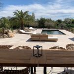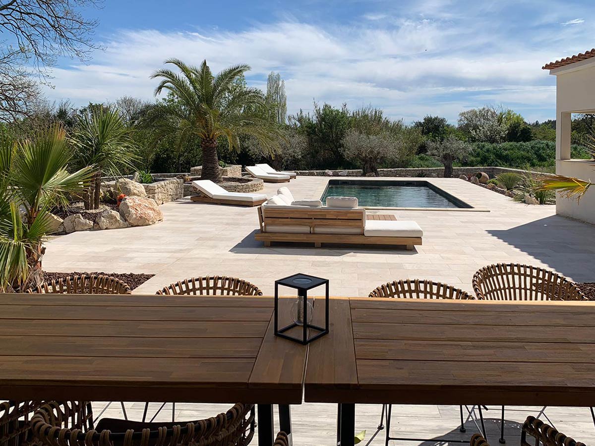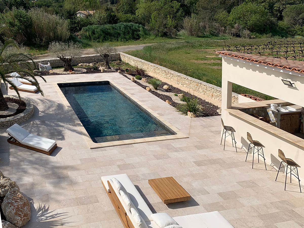Discover this superb design for a contemporary and timeless outdoor space, featuring the Tiber collection in travertine. The light tones and delicate texture of travertine create a soothing atmosphere, perfect for sunny days. With a swimming pool, spacious terrace and summer kitchen, this space is perfect for enjoying the sunny days and cooling off in peace and quiet.