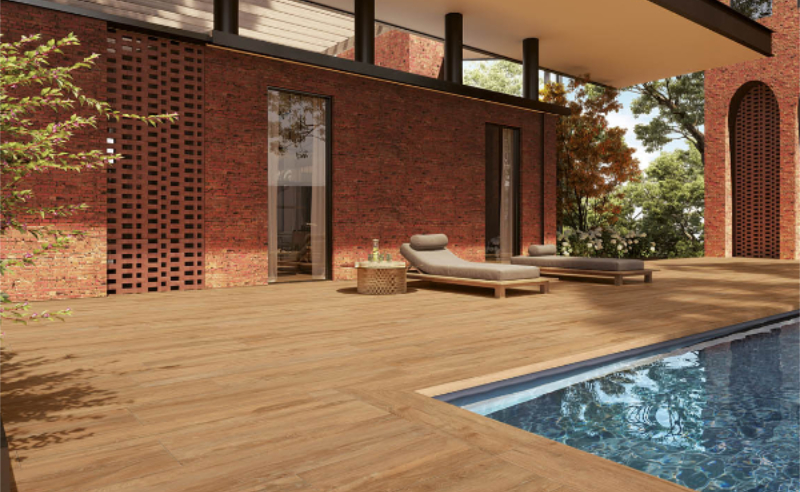 Another advantage of outdoor tiles for pool areas is that they are highly resistant to frost and bad weather conditions. The low porosity of porcelain stoneware prevents water from penetrating through the tile, so that it does not break when it freezes.