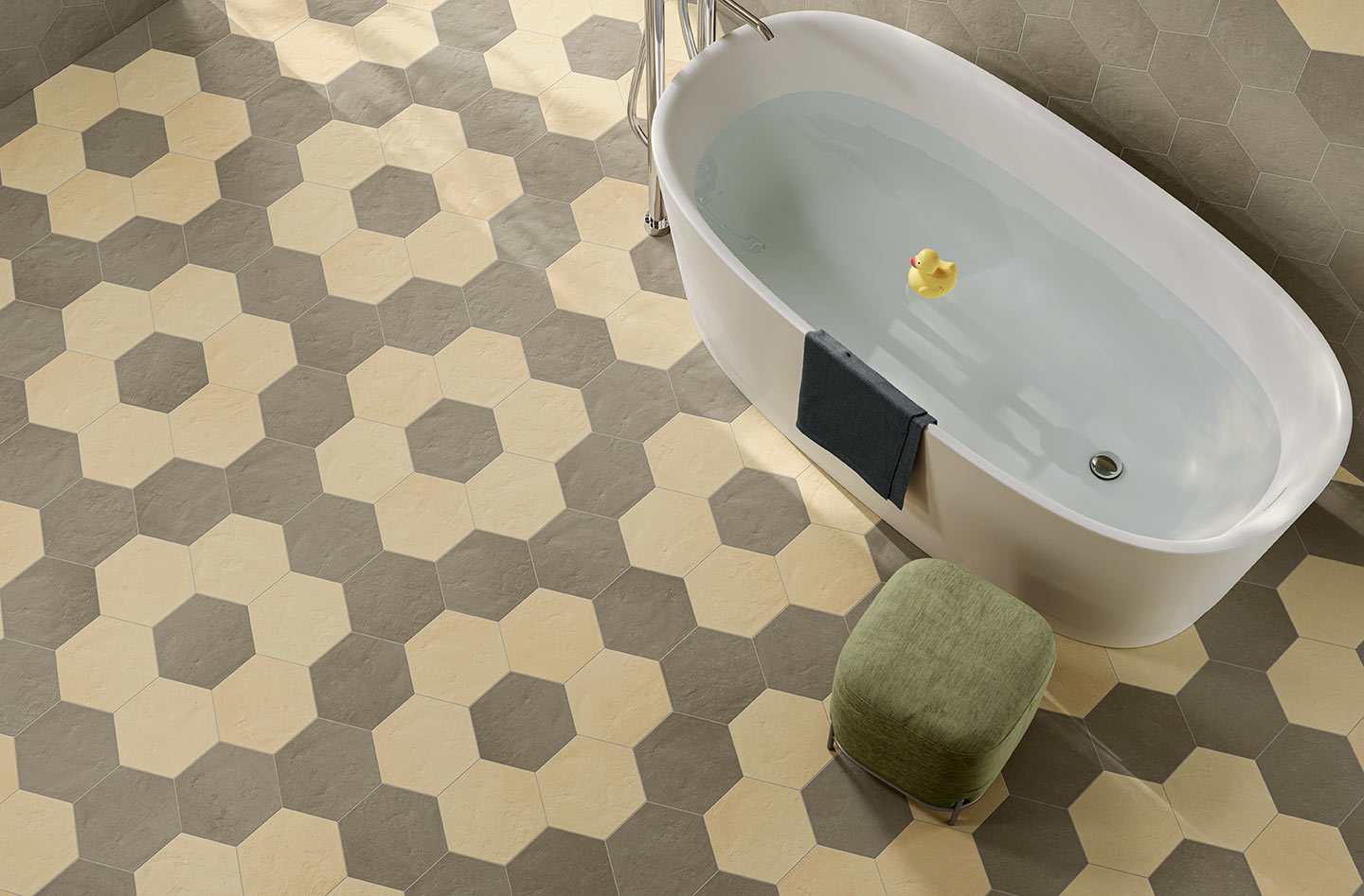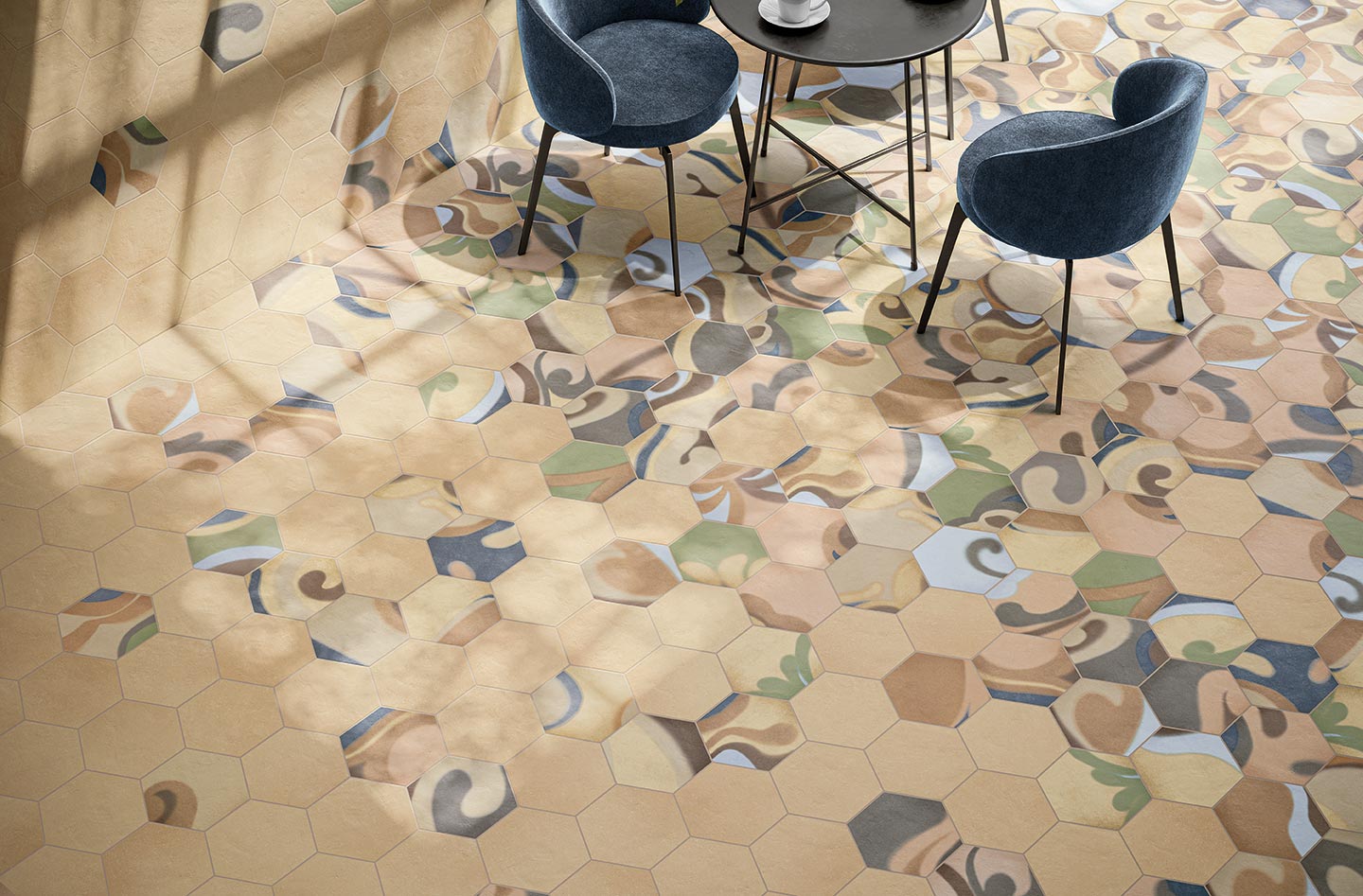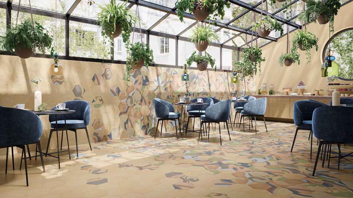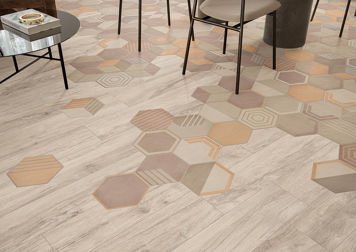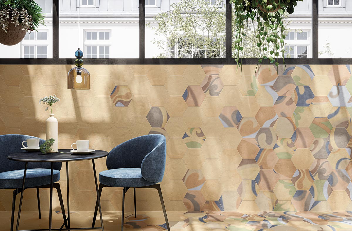 Osmose was born from an opportunity. A suggestion born from the desire to show in all its beauty the rainbow of colours that characterise Novoceram’s Ojala series. The wealth of shades and variety in the design is intended to give new life to a classic format in the ceramic industry, the hexagon.
