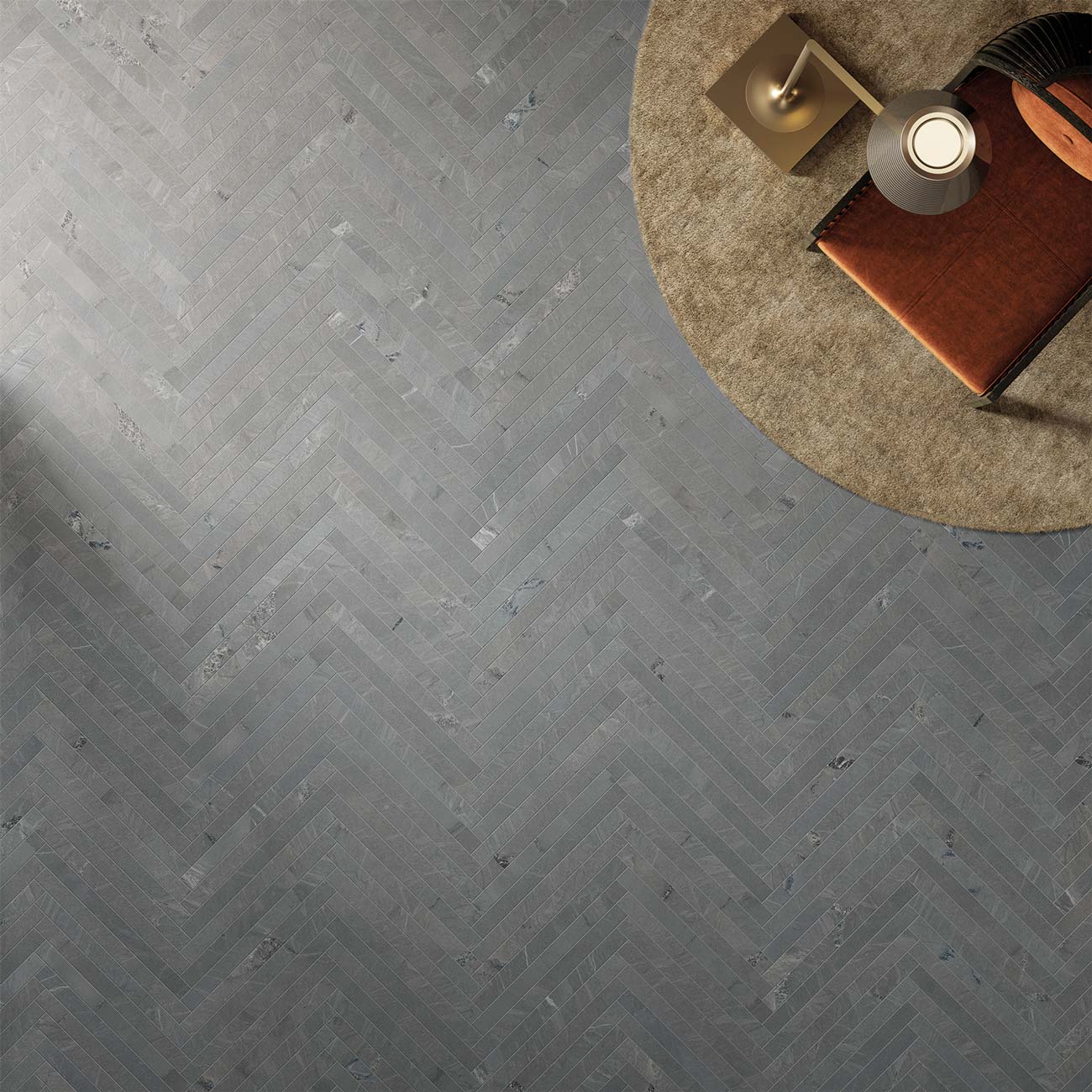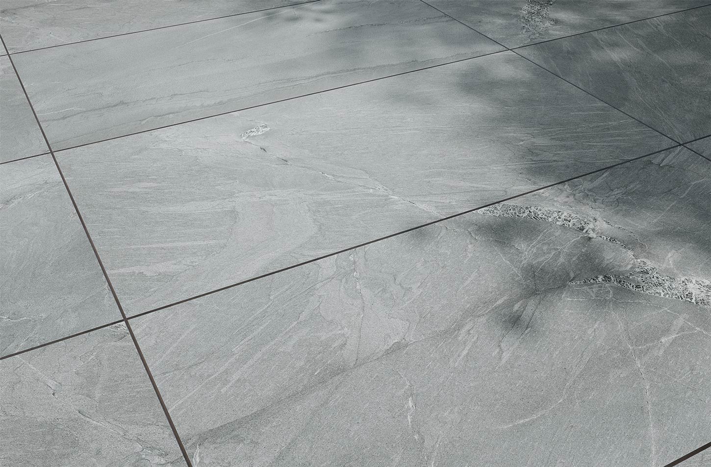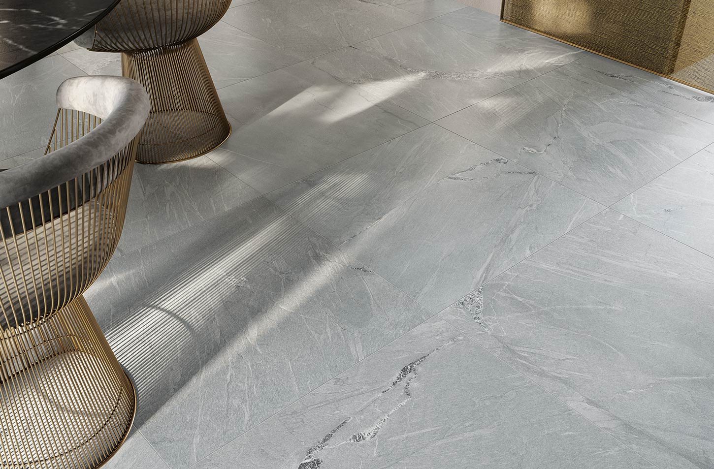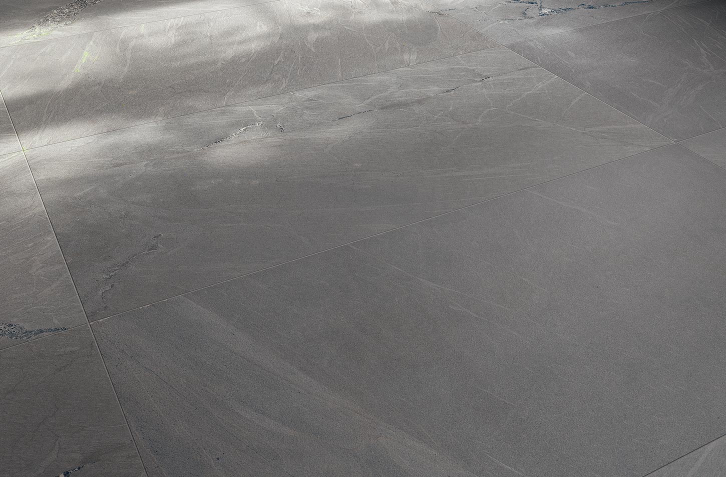 The tile surface is decorated with many white mineral veins, taken exactly from the original material, which contrast with the background rich in shades of grey. The collection has two colours: Fer and Quartz. The first is identical to the ash-coloured original stone while the second is an interpretation in a lighter version.