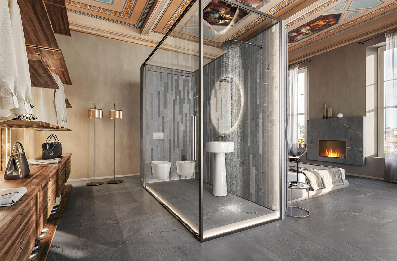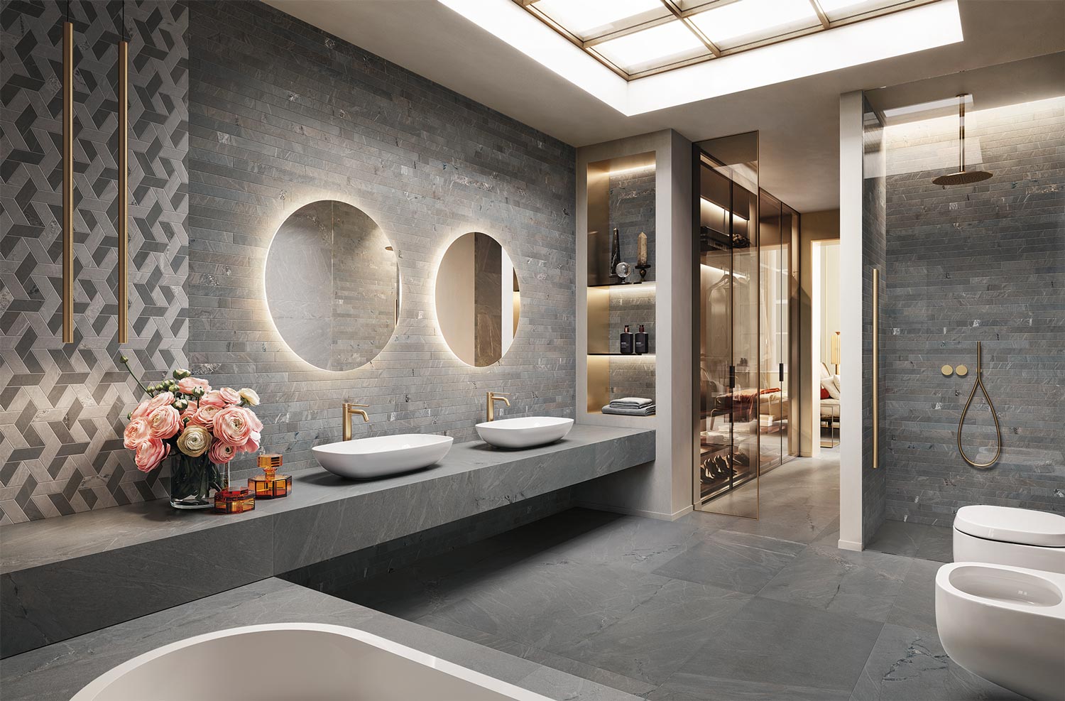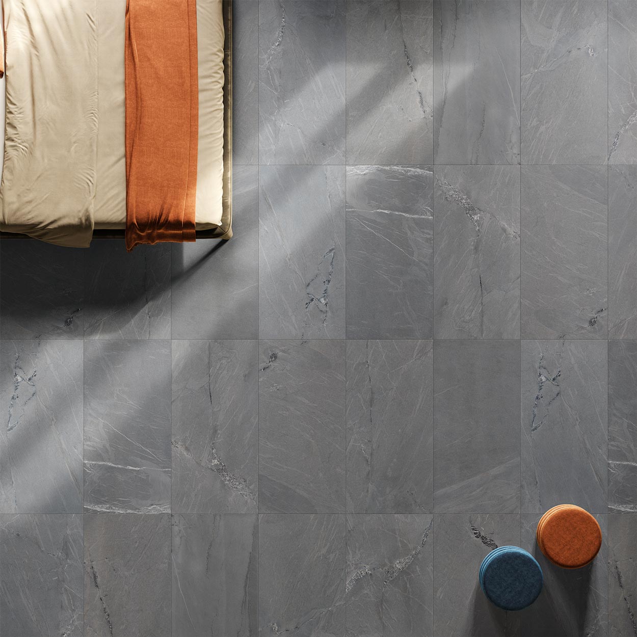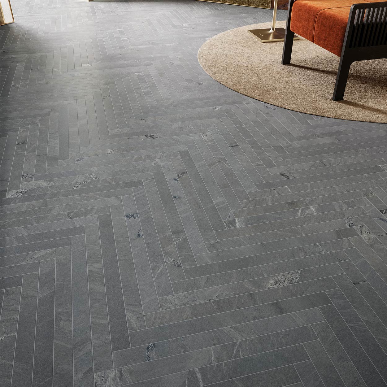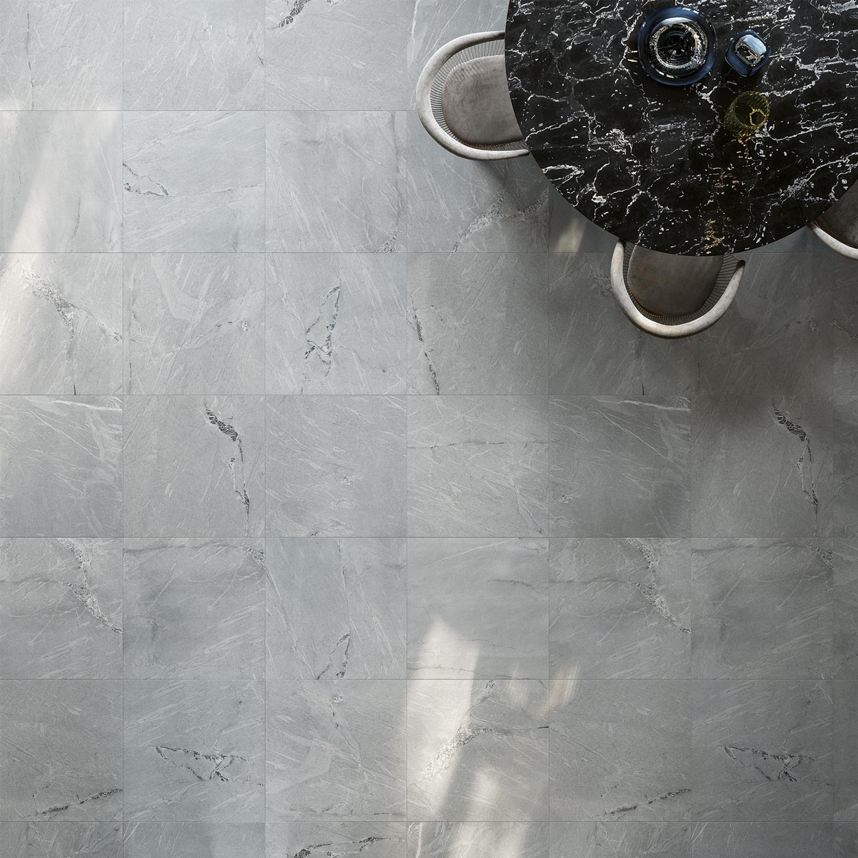 The tile surface is decorated with many white mineral veins, taken exactly from the original material, which contrast with the background rich in shades of grey. The collection has two colours: Fer and Quartz. The first is identical to the ash-coloured original stone while the second is an interpretation in a lighter version.