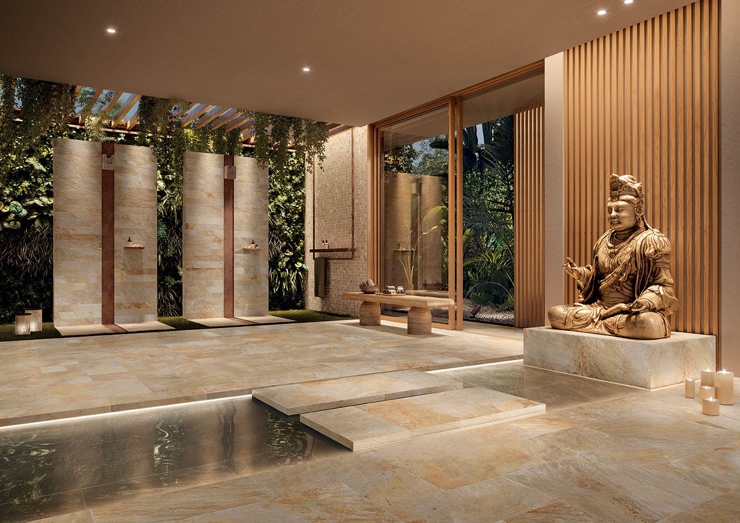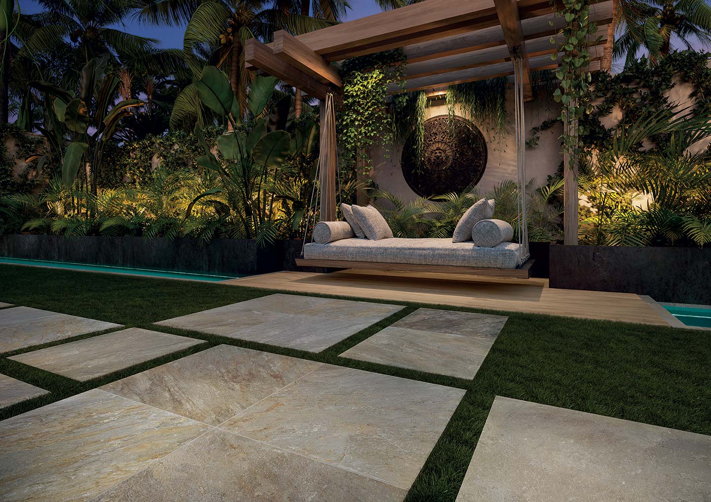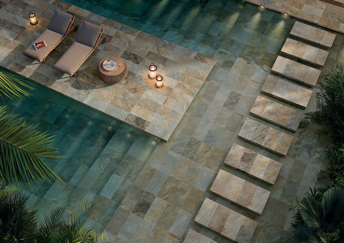 Zéphyr is an exciting explosion of color. Zéphyr is the possibility of having in your garden, on your balcony, in your swimming pool, all the unimaginable material and chromatic shades of Bali stone: shades ranging from water green, to gray, to ocher, up to the golden tones of yellow, of pink and rust, in a harmonic fusion which only can be obtained in nature through millenary processes of formation and transformation of matter.