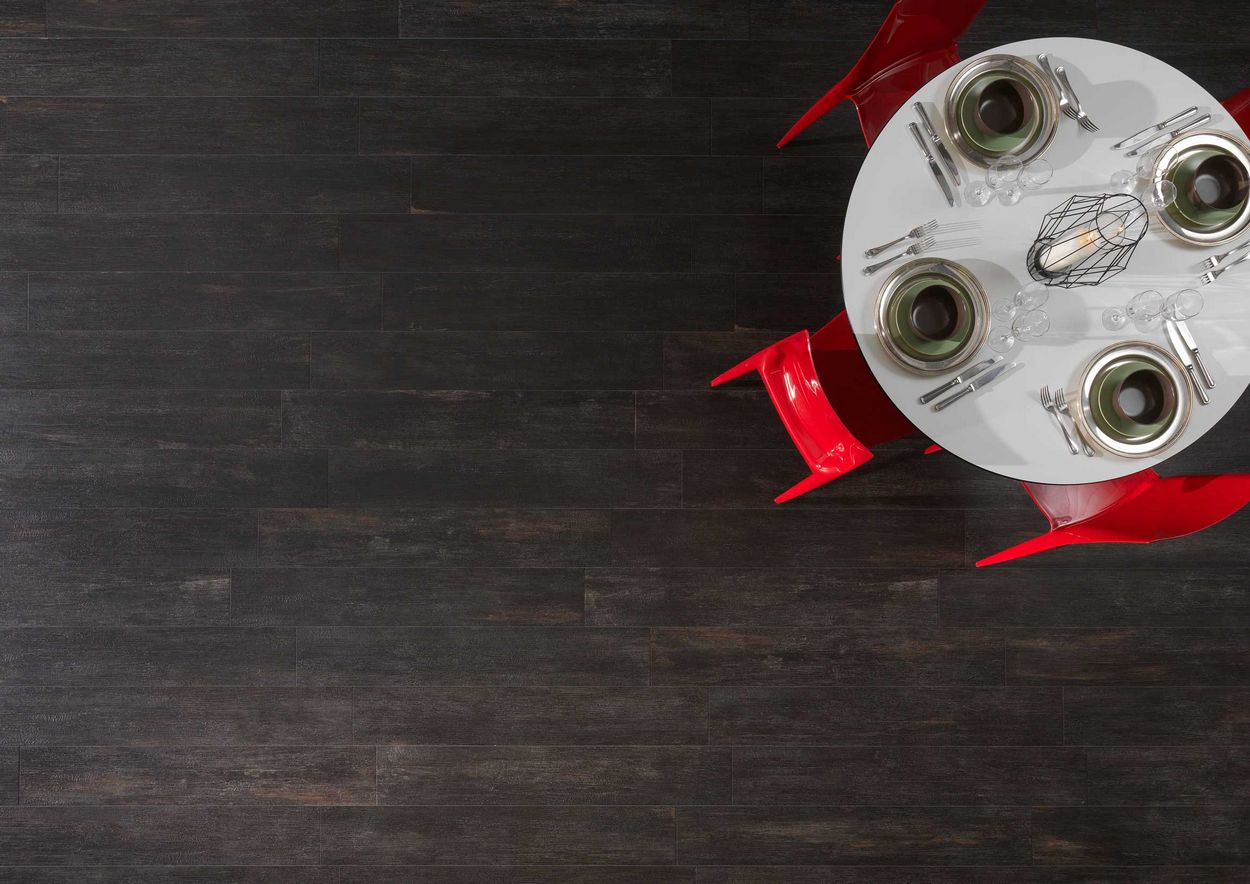 For example, it goes wonderfully well with more modern, sober interiors and enhances furniture with clean lines. Combined with light-coloured furniture, it lends power and intensity to floors and walls, and makes a powerful statement against lighter shades. Another option is to combine black porcelain stoneware tiles with natural materials such as wood. This marriage combines the sophistication of black with the natural warmth of wood, resulting in a perfect balance between modernity and conviviality.