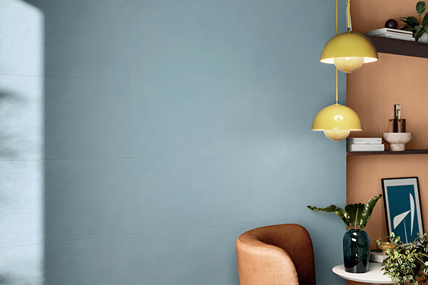 This tint of an elegant richness can firstly colour concrete effect tiles. In this case, the freshness and simplicity of ceramic blue tiles slightly soften the raw and modern nature of concrete. This creates a much-appreciated graphic style as the various shades delicately highlight the multiple details of the concrete effect.