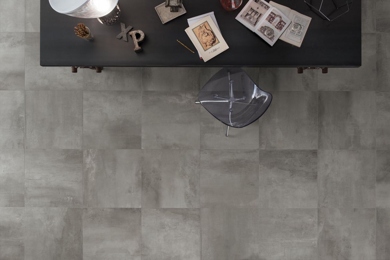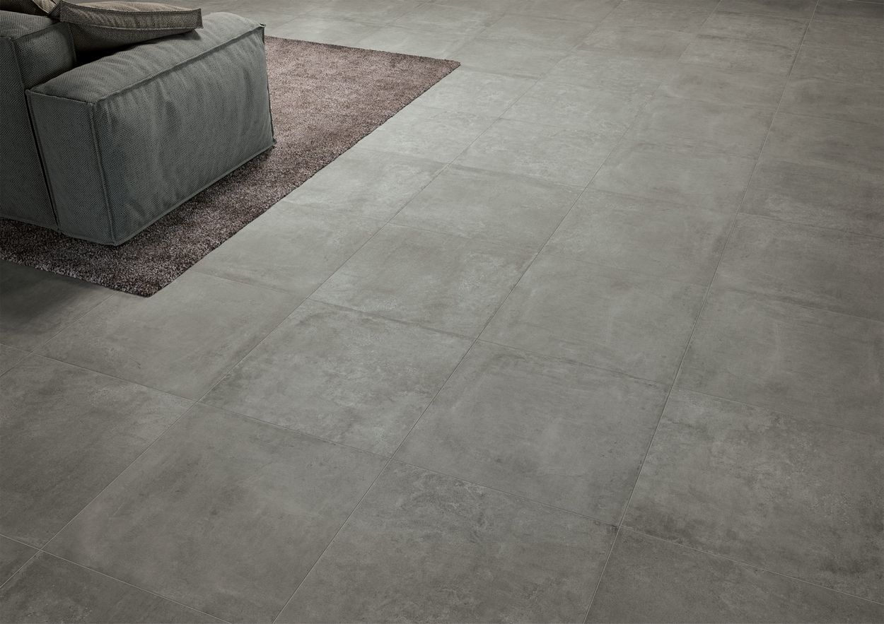 • Grey porcelain stoneware in medium format, which is the perfect compromise between large and small formats. These so-called ‘standard’ sizes, such as 45×45 cm, are ideal for those who are undecided, because they can be adapted to any space. For example, the 60×60 grey tiles enhance any room without overloading it.