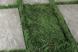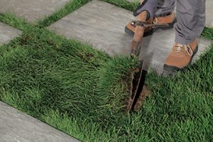 For optimum stability, dig out to a depth of 5 to 6 cm and add a bed of fine gravel with a grain size of between 4 and 8 mm. Consolidate the substrate before laying the tiles. The tiles should remain below the level of the grass to avoid damaging the lawnmower when it passes.The laying can also be carried out on concrete rather than gravel.