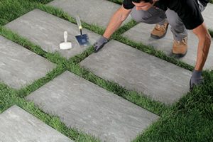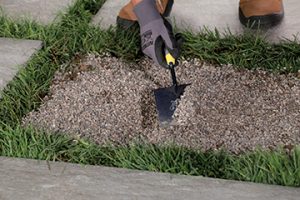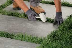 To lay the paving, place the tiles in a « stepping stone » arrangement. It is important to estimate the number of stepping stones needed to complete the path, then arrange the tiles an equal distance apart.