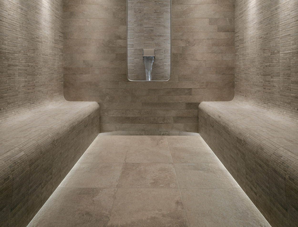 The decorative power of 15×1.875 tesserae is enhanced by the aesthetic effects designed by Novoceram. With the aim of creating a play of surfaces both indoors and out, the appearance of natural stone is brought to life on this particular format.