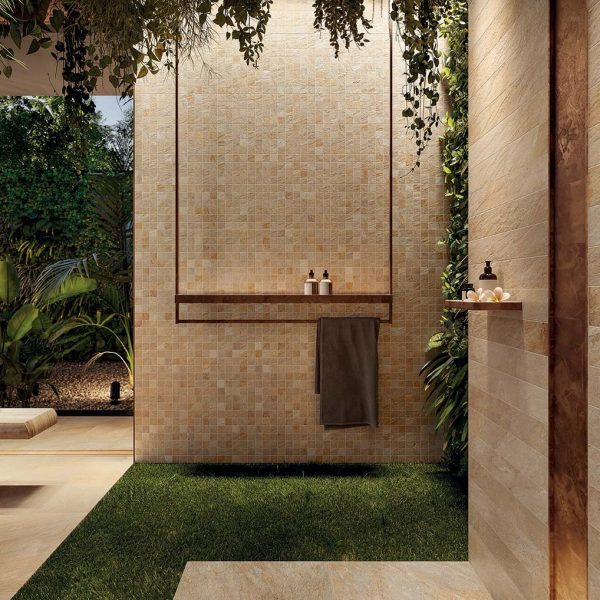 By choosing the Bali stone look tile for your bathroom, you will be bringing a nice vacation touch to your home. Regardless of whether you want to cover the floor of a walk-in shower or dress up the walls of your bathroom, this stone should definitely satisfy you. Its warm colors will also make your room a real cocoon for you and your family.