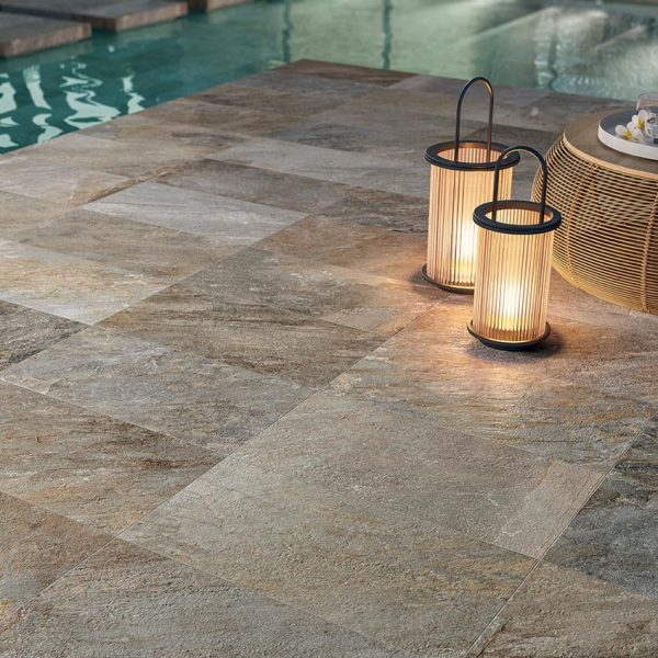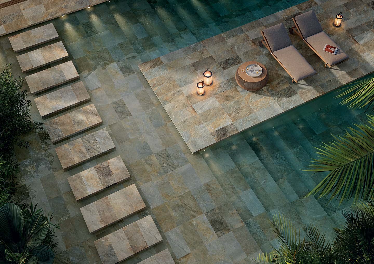 For the tiling of a swimming pool, Bali stone effect tiles are an ideal choice, be it for technical or aesthetic reasons. With its anti-slip properties and its sublime emerald reflections, it will satisfy you down to the smallest detail. Its paradisiac colors will allow you to enjoy a pool with an upscale and soothing look, on par with the greatest luxury spas. The Bali stone look tiles will give you the impression of diving into the most beautiful Indonesian lagoons from your home. Your pool will bring a certain charm to your exterior.