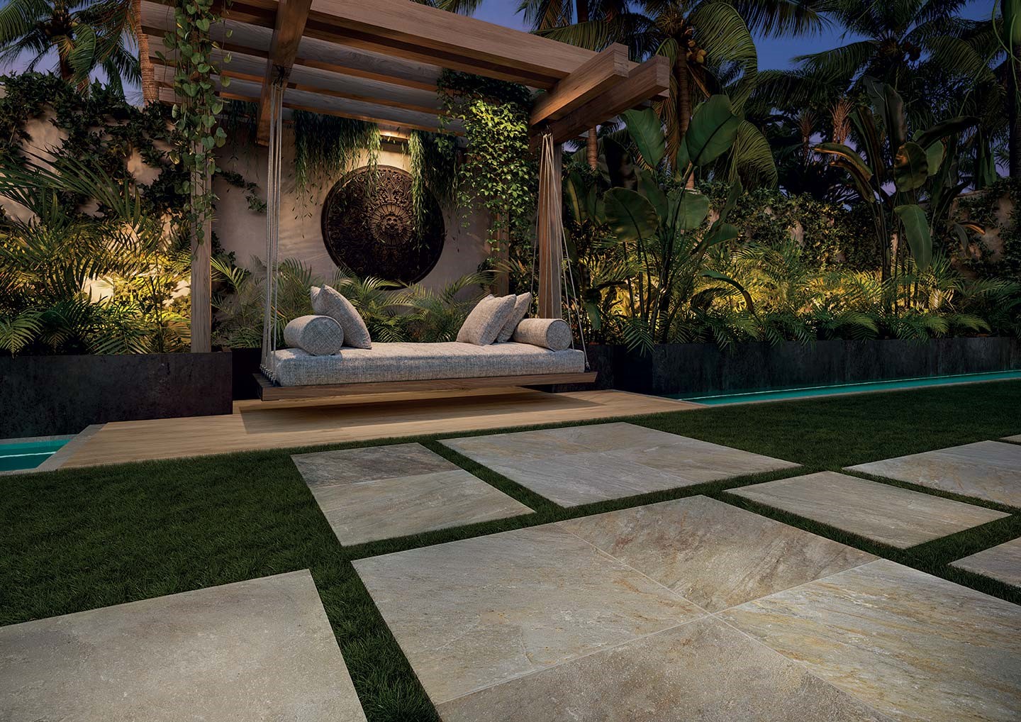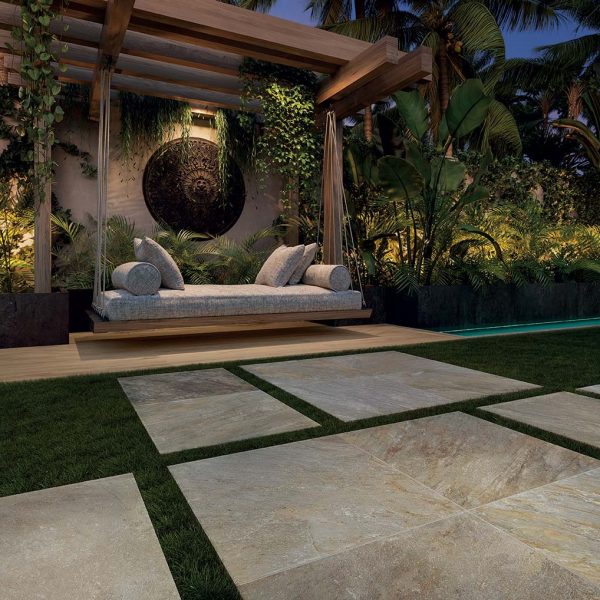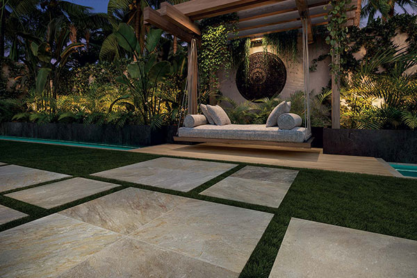 Bali stone effect tiles are not only suitable for swimming pools and water rooms in your home. Your terrace, or even your garden paths, can also benefit from a covering made from this unique material. A Bali stone effect tile will blend perfectly with exteriors that are both sober and exotic. Due to the sturdiness of this type of flooring, you can also easily place a garden lounge on it without fear of damaging it.